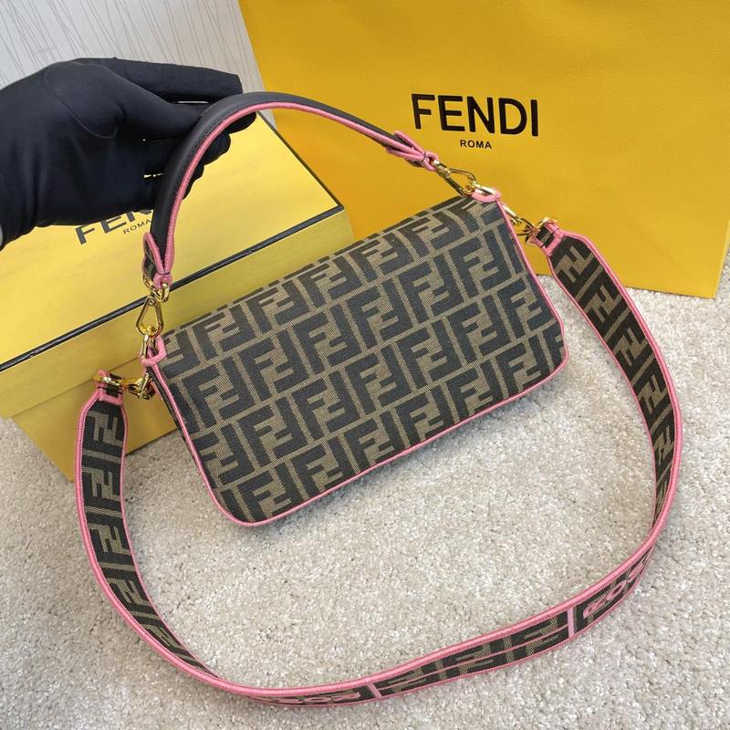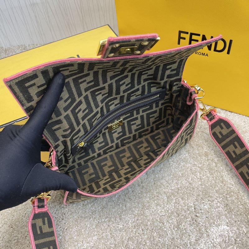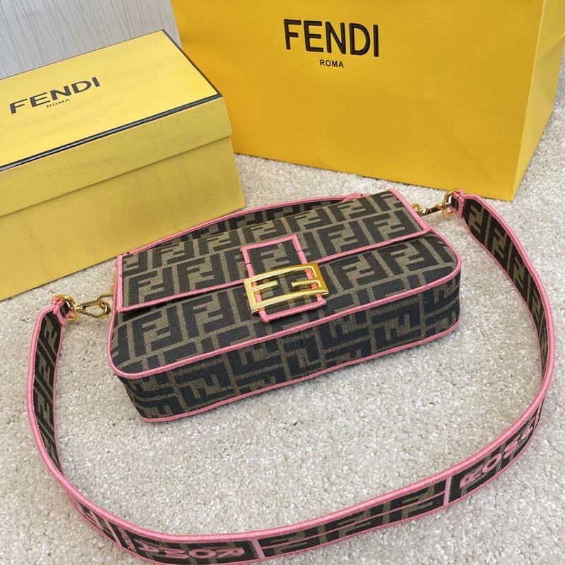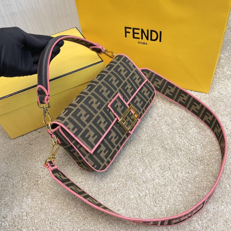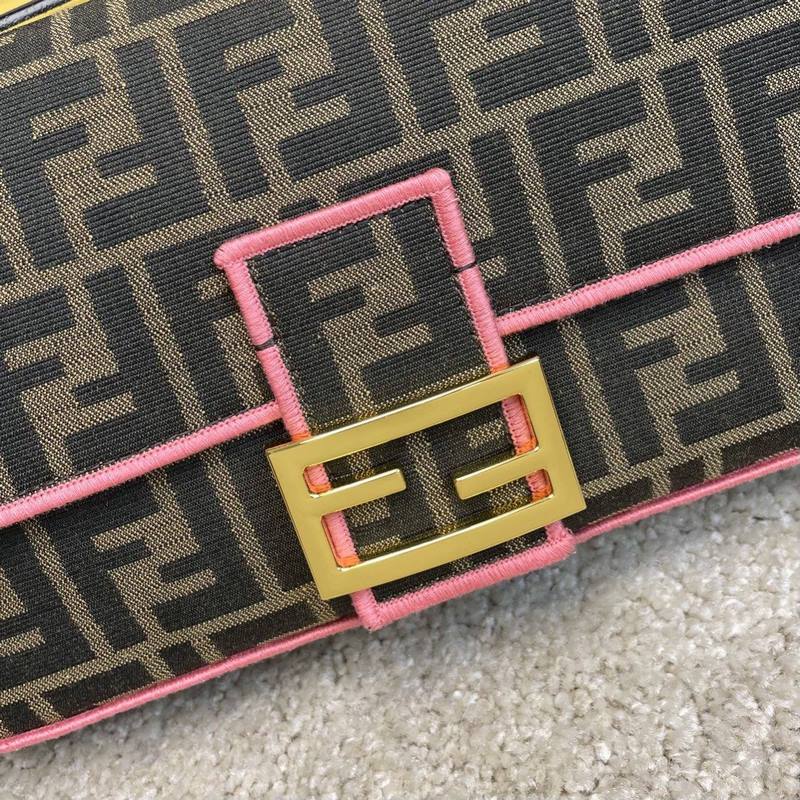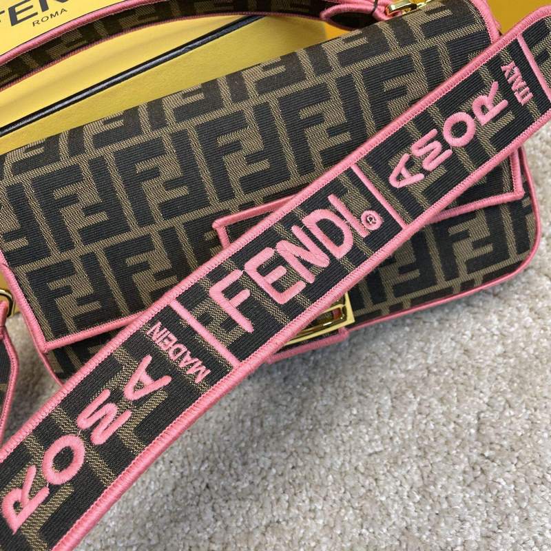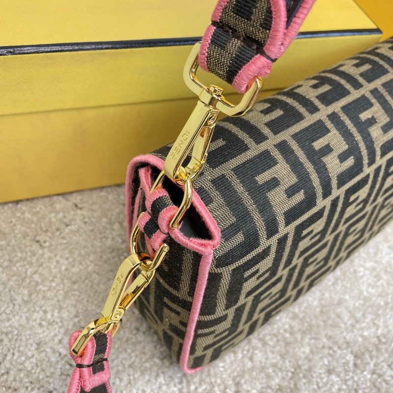 이름: 바게트 중 모델: 8853 색상: 분홍색 크기: 26 x 4 x 16 상징적인 Fend1 바게트 미디엄 핸드백은 FF 자석 걸쇠가 달린 플랩 디자인과 지퍼 포켓이 있는 안감을 특징으로 합니다. 손으로 들거나 크로스 바디로 들 수 있도록 탈착식 어깨 끈이 함께 제공됩니다. 패브릭 소재로 제작되었으며 FF 모티브와 가장자리에 분홍색 새틴 스티치 장식이 있습니다. 맞춤형 어깨 끈에는 분홍색 Fend1 라벨 모티브가 장식되어 있습니다.