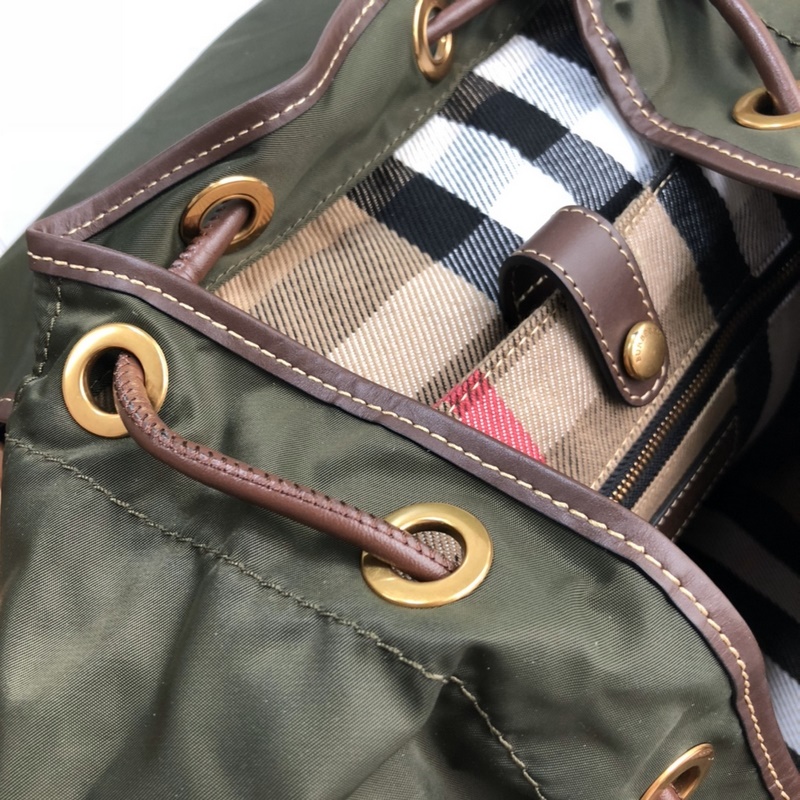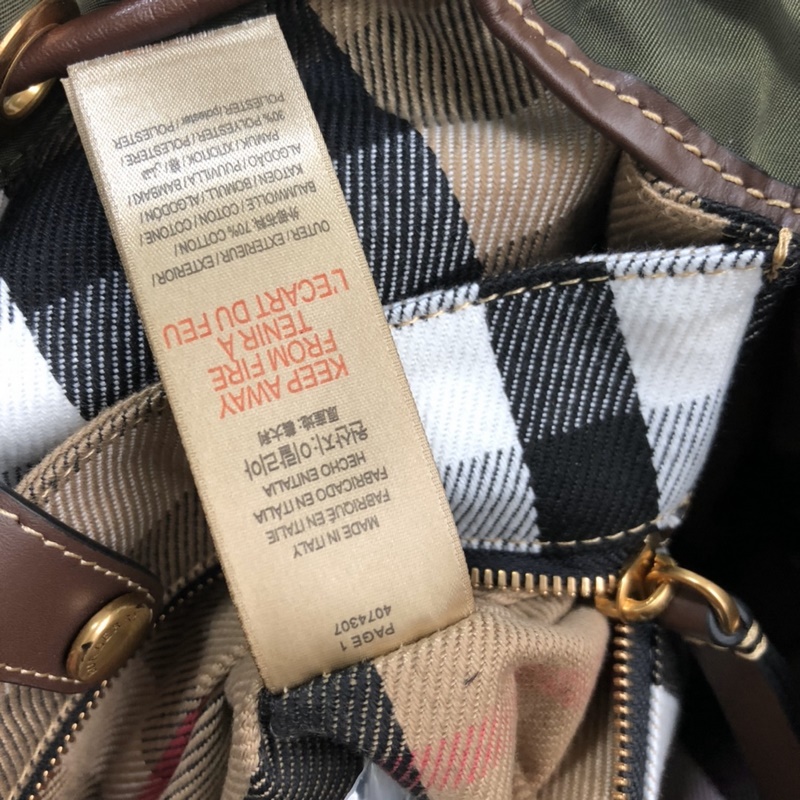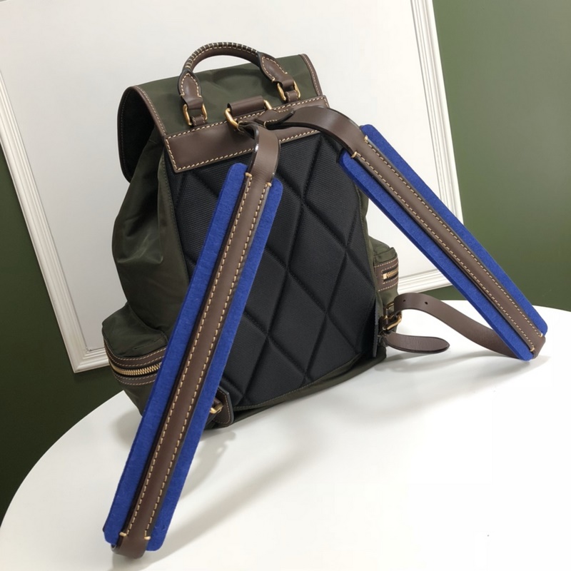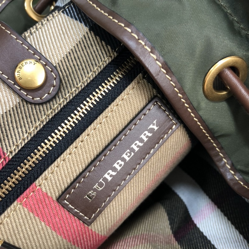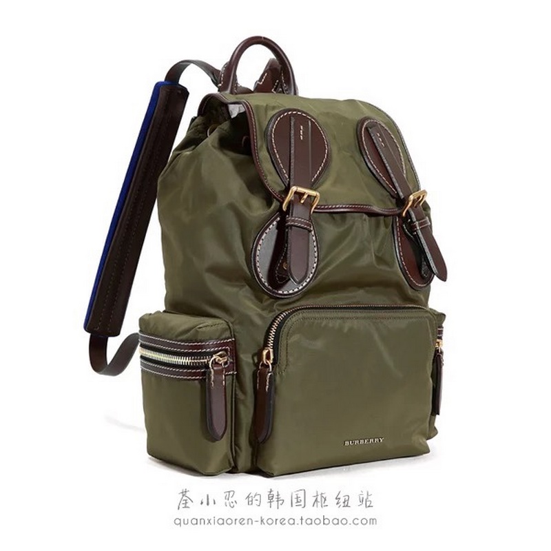 버버리 톱스티치 장식의 군용 배낭. 가벼운 나일론 소재에 송아지 가죽을
