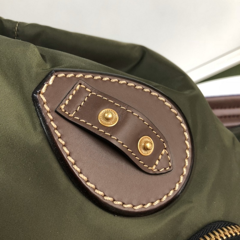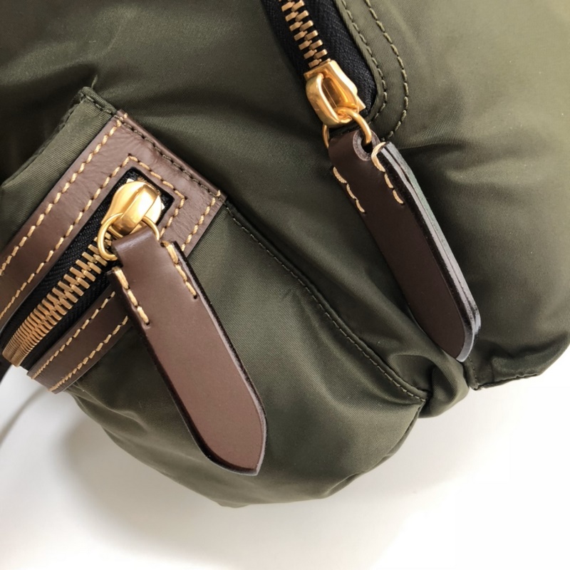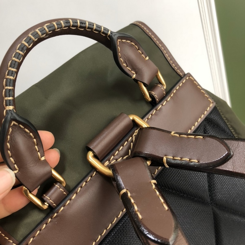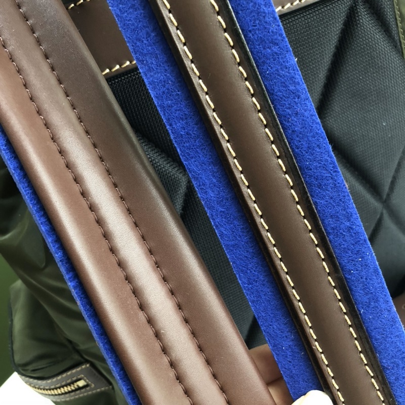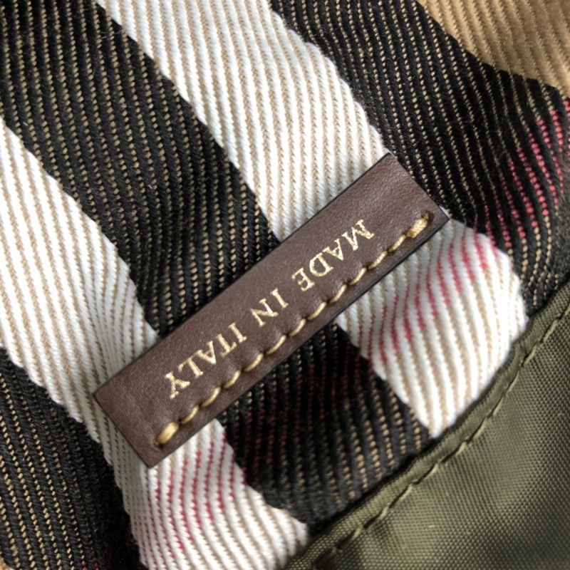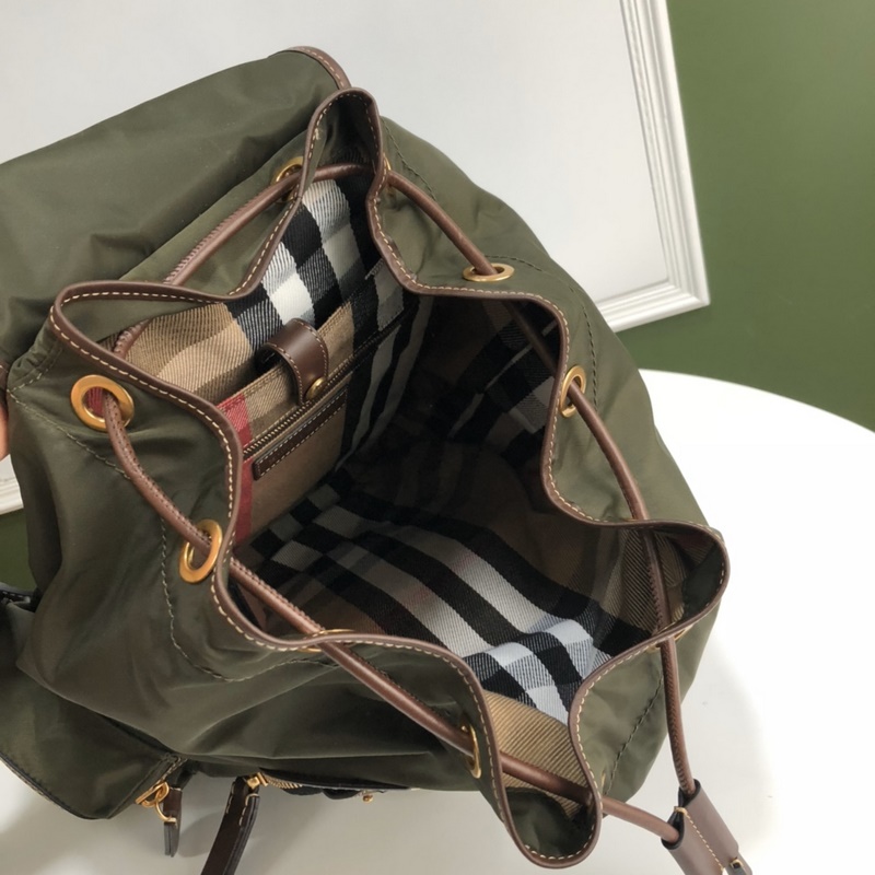 버버리 톱스티치 장식의 군용 배낭. 가벼운 나일론 소재에 송아지 가죽을