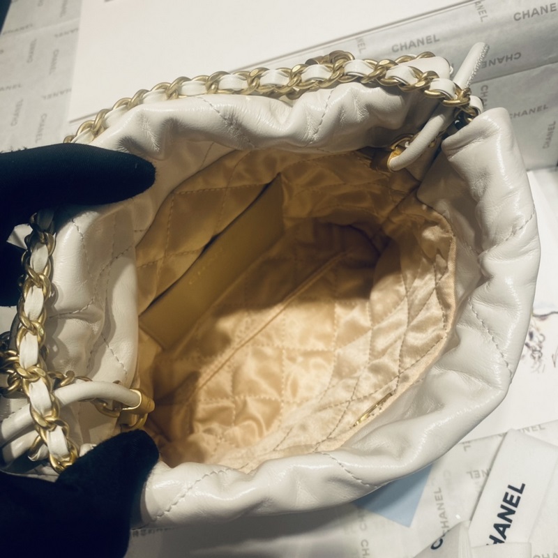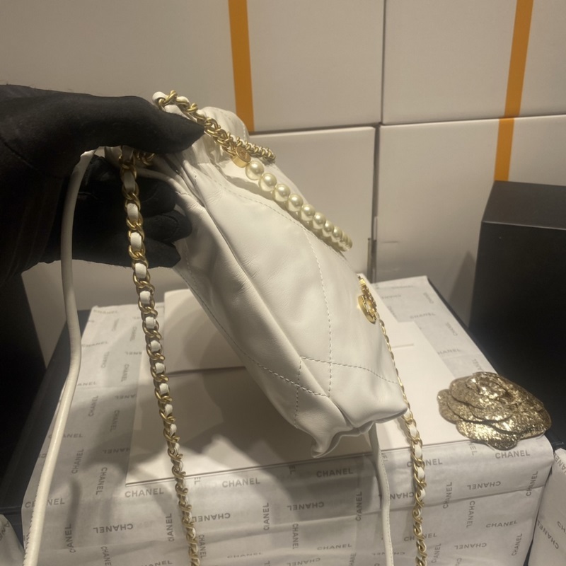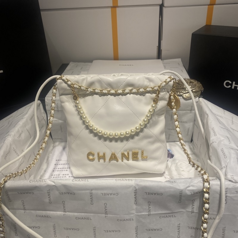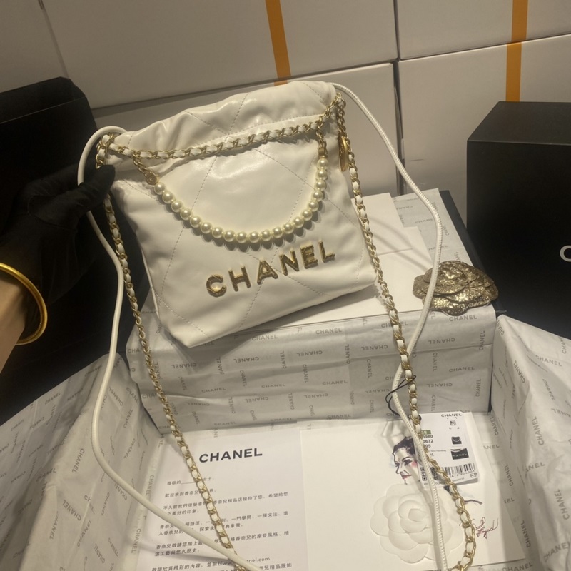 샤넬 23 봄/여름 신상 미니 22 백 더 큰 사이즈와 동일한 반짝이는 송아지 가죽 소재에 빈티지 골드 하드웨어와 다이아몬드 패턴 작은 22번 가방은 큰 사이즈보다 더 정교합니다. 체인 디자인이 너무 좋고 더블 체인 가죽 로프 체인으로 디테일이 가득합니다. 가방 앞쪽에 있는 짧은 가죽 끈 두 개는 가방을 조이고 닫는 데 사용됩니다. 뒷면의 두 개의 긴 끈은 단순히 끈으로 사용됩니다. 크기: 20*19*6cm/3980