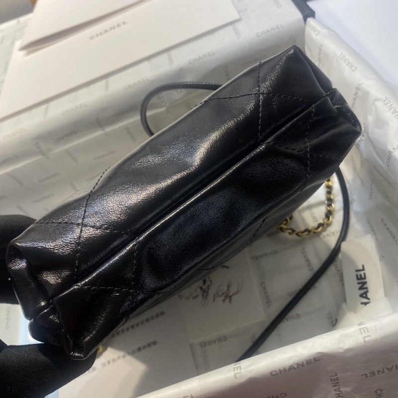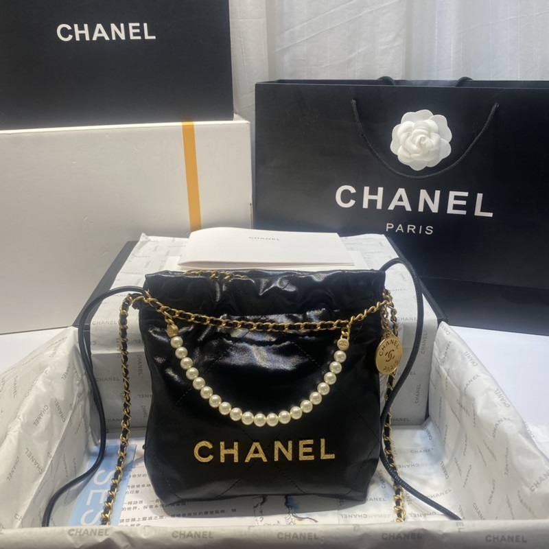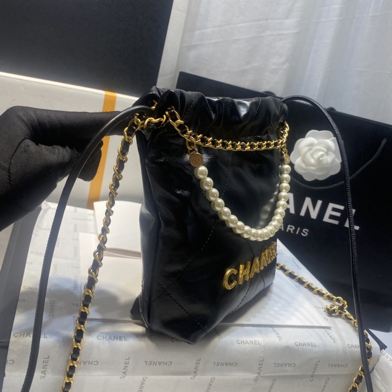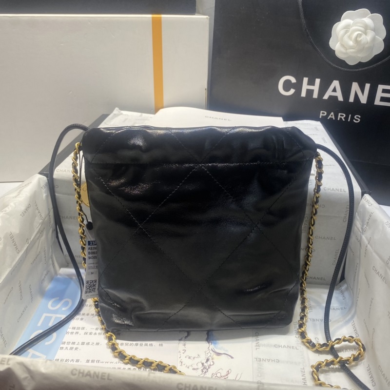 샤넬 23 봄/여름 신상 미니 22 백 더 큰 사이즈와 동일한 반짝이는 송아지 가죽에 빈티지 골드 하드웨어와 다이아몬드 패턴 작은 22번 가방이 큰 사이즈보다 더 정교합니다. 체인 디자인이 너무 좋고 더블 체인 가죽 로프 체인으로 디테일이 가득합니다. 가방 앞쪽에 있는 짧은 가죽 끈 두 개는 가방을 조이고 닫는 데 사용됩니다. 뒷면의 두 개의 긴 끈은 단순히 끈으로 사용됩니다. 크기: 20*19*6cm/3980