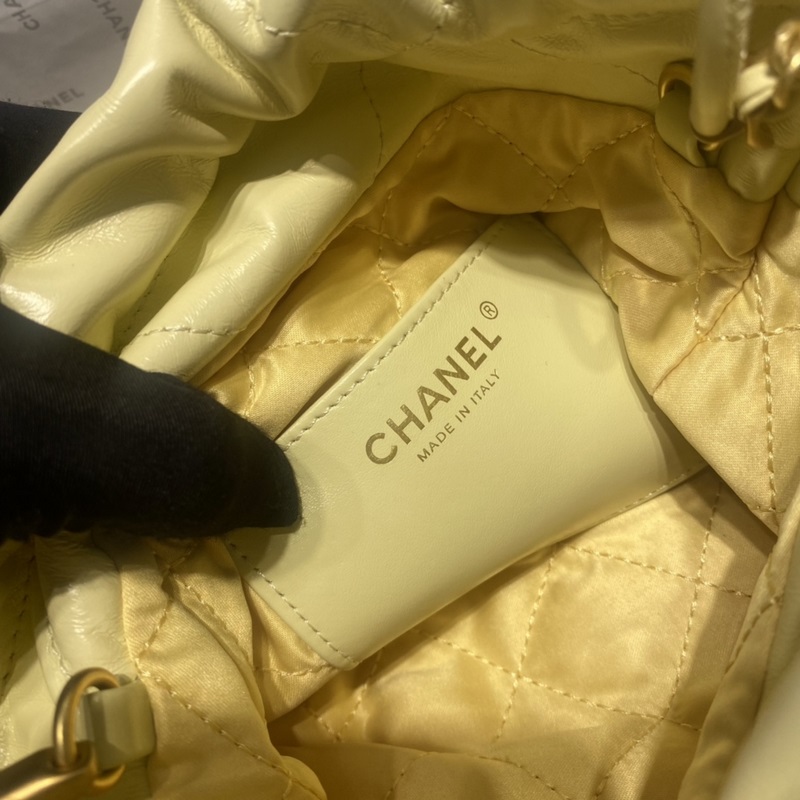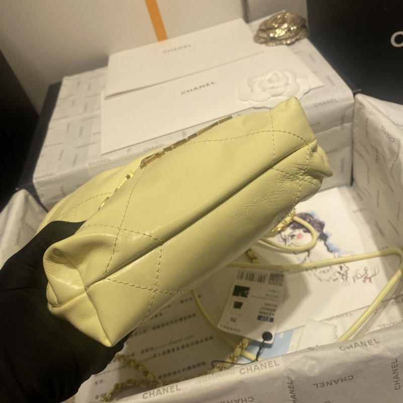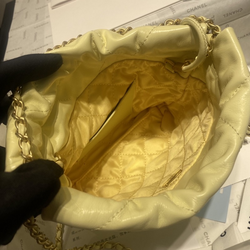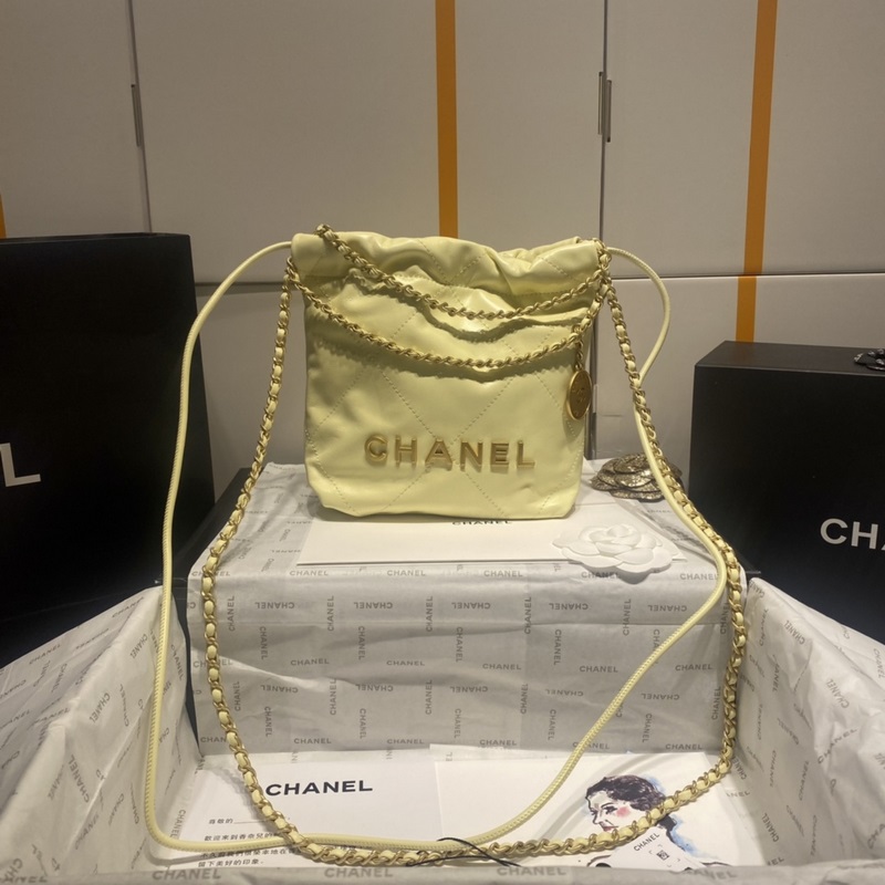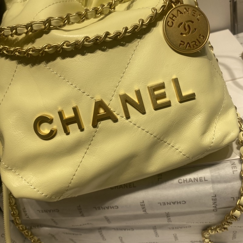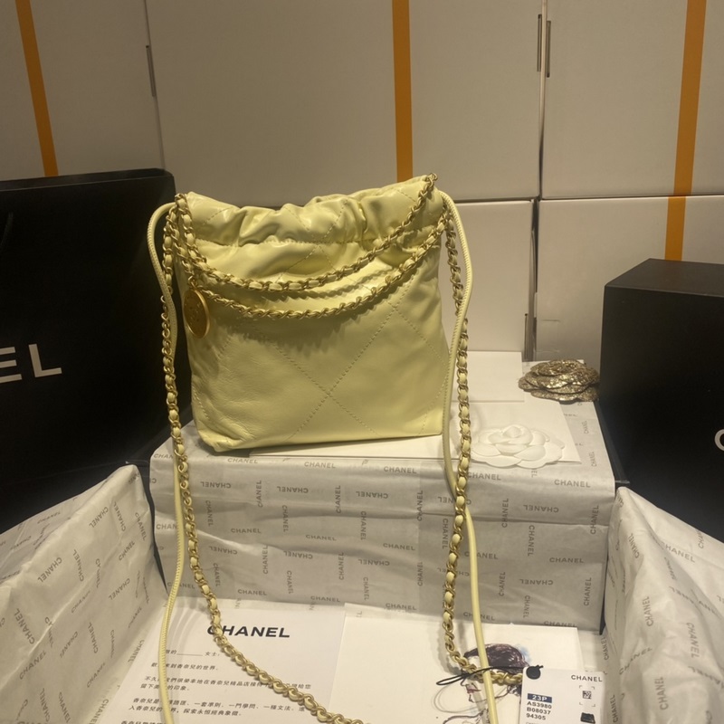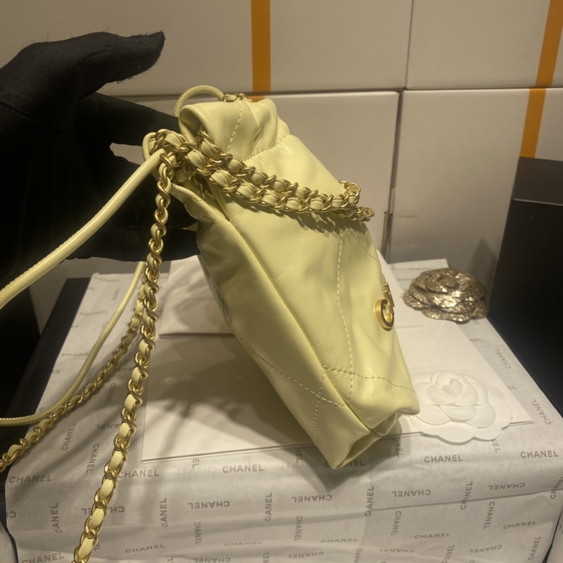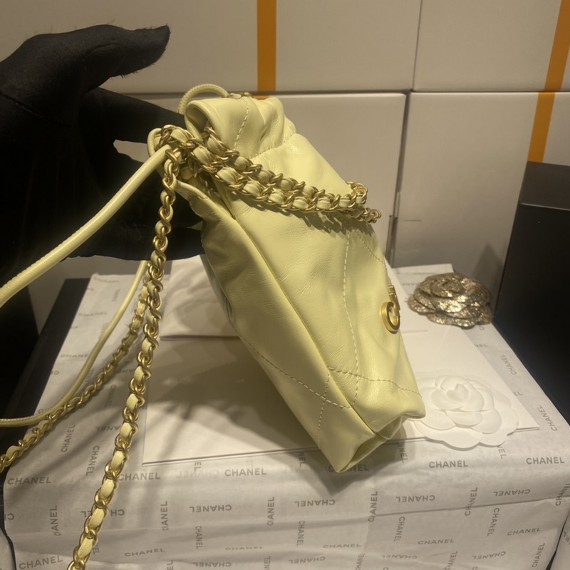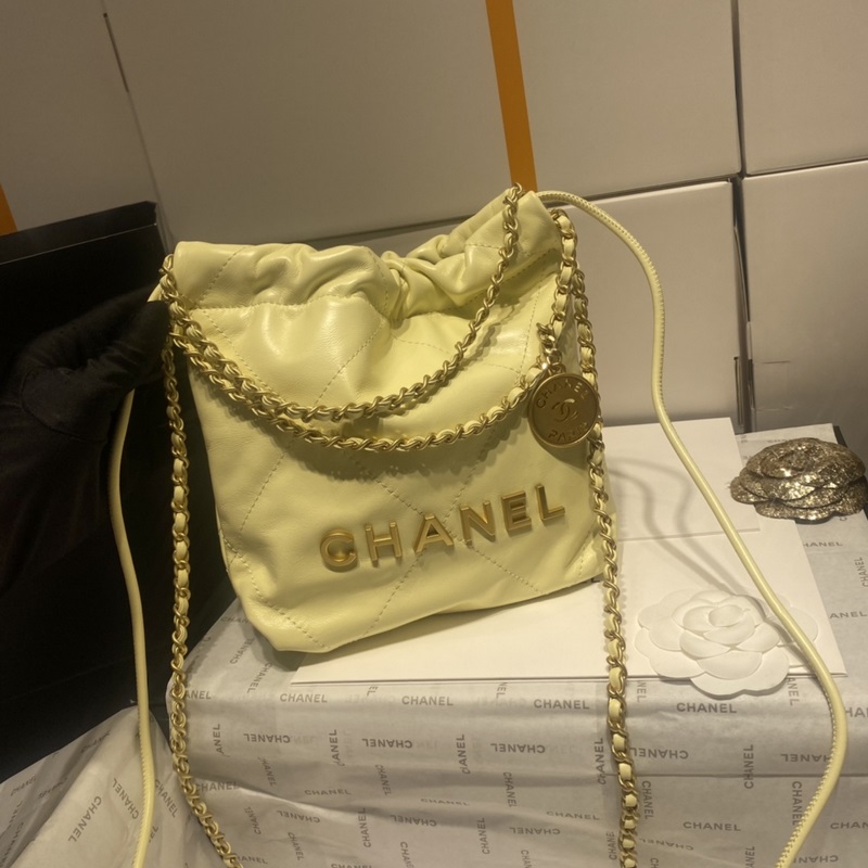 샤넬 23 봄/여름 신상 미니 22 백 더 큰 사이즈와 동일한 반짝이는 송아지 가죽에 빈티지 골드 하드웨어와 다이아몬드 패턴 작은 22번 가방이 큰 사이즈보다 더 정교합니다. 체인 디자인이 너무 좋고 더블 체인 가죽 로프 체인으로 디테일이 가득합니다. 가방 앞쪽에 있는 짧은 가죽 끈 두 개는 가방을 조이고 닫는 데 사용됩니다. 뒷면의 두 개의 긴 끈은 단순히 끈으로 사용됩니다. 크기: 20*19*6cm/3980