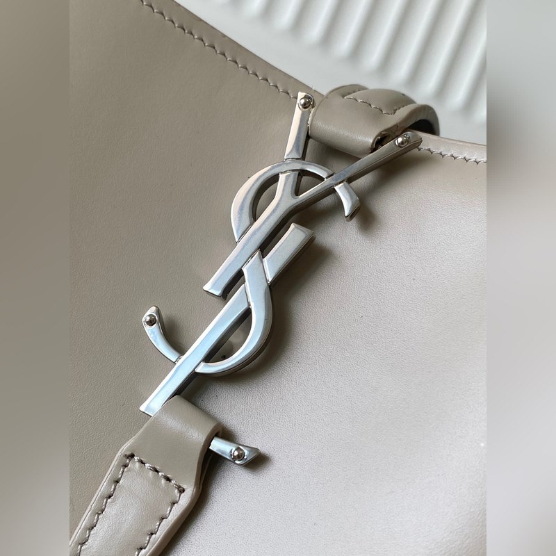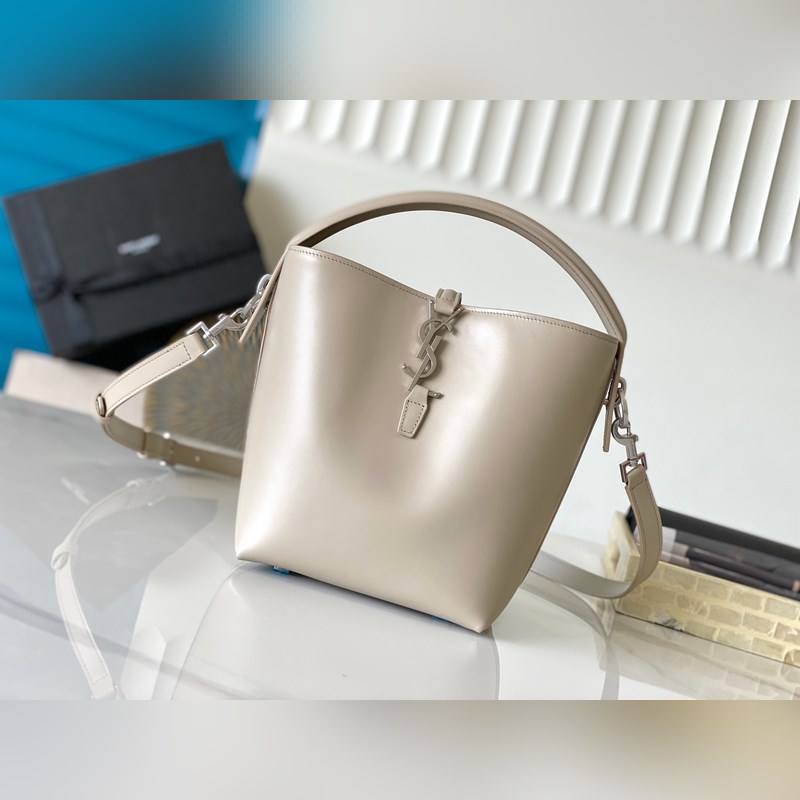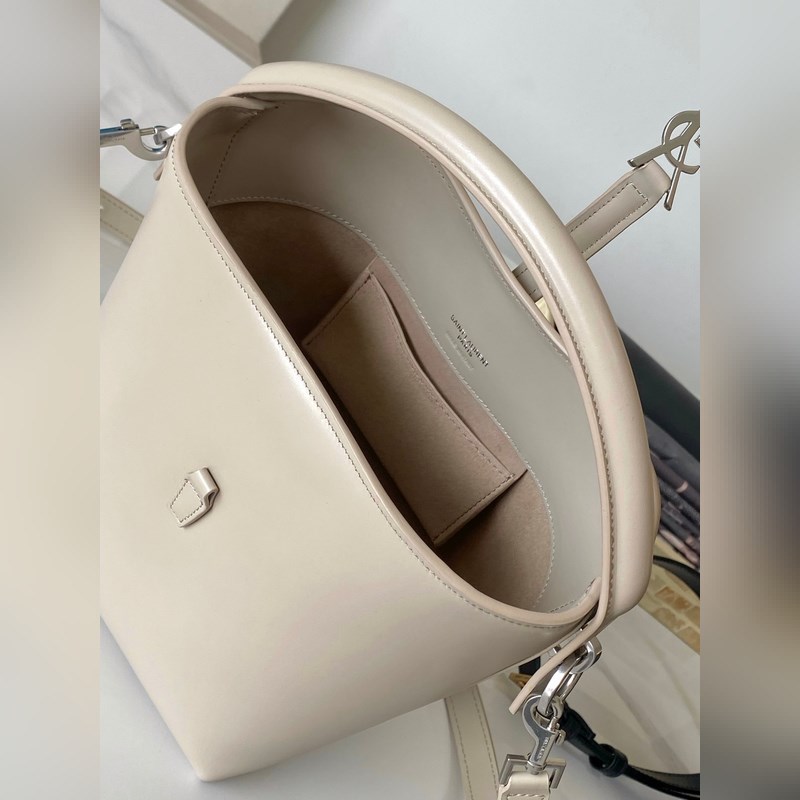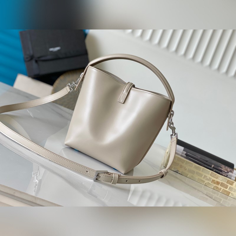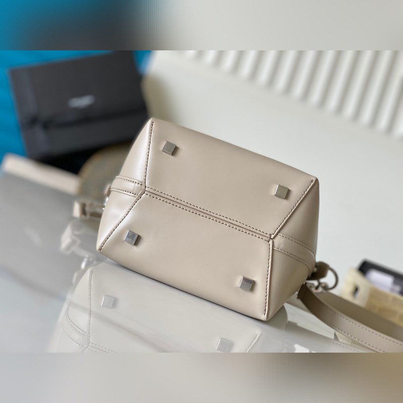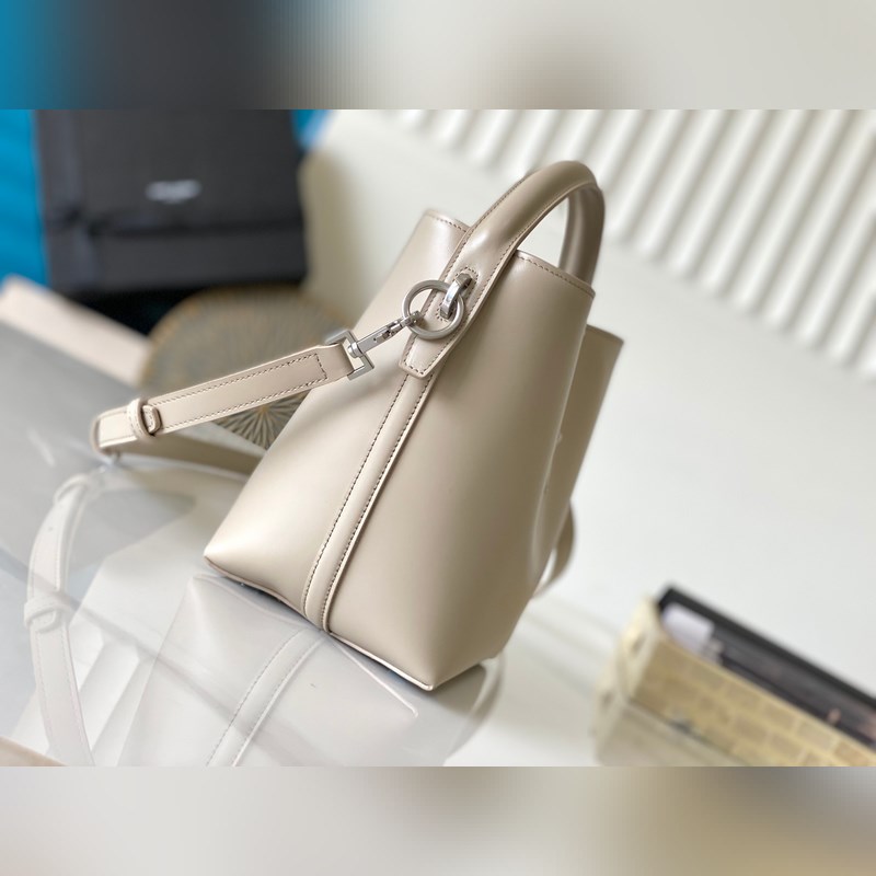 LE 37 버킷백 미디엄_ 손잡이가 달린 아주 멋진 버킷백_ 이탈리아 송아지 가죽으로 만든 새로운 유형의 가방으로 단순하고 입체적인 실루엣이 단단하지만 너무 거칠지 않은 느낌을 줍니다. 바닥에는 클래식하고 상징적인 금속 로고가 새겨진 금속 스터드와 스냅 버튼이 있어 전체적으로 클래식한 우아함과 세련된 모던함이 독특하게 결합된 느낌을 줍니다! 모델: 749036 밀크 아몬드 소가죽 실버 버클 크기: 20*17*13cm