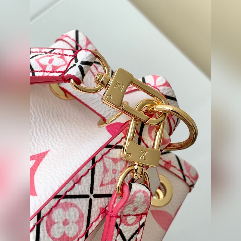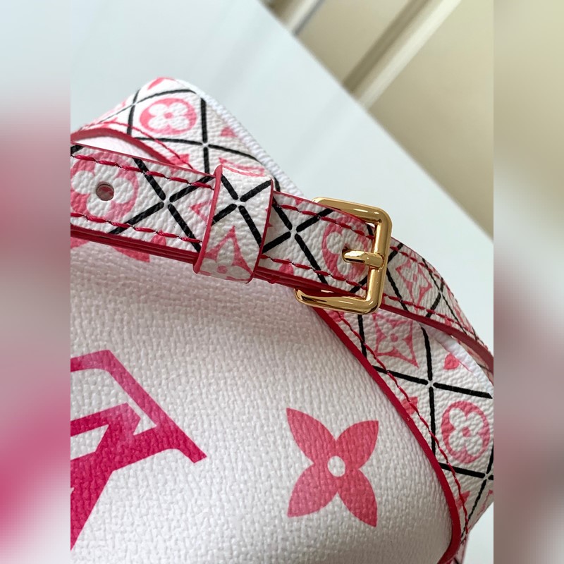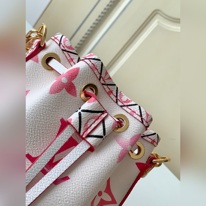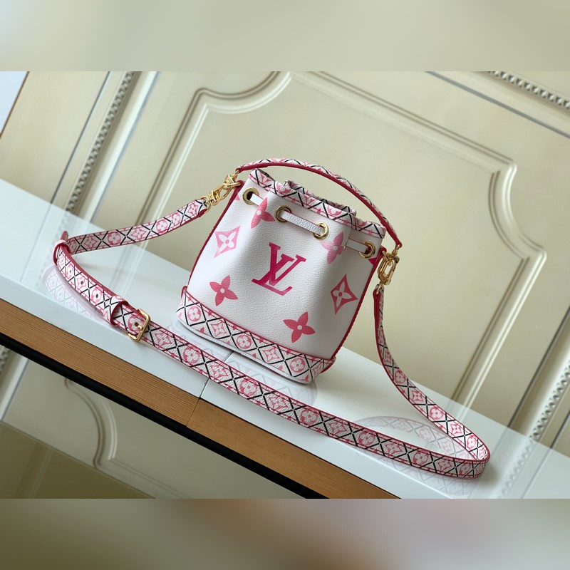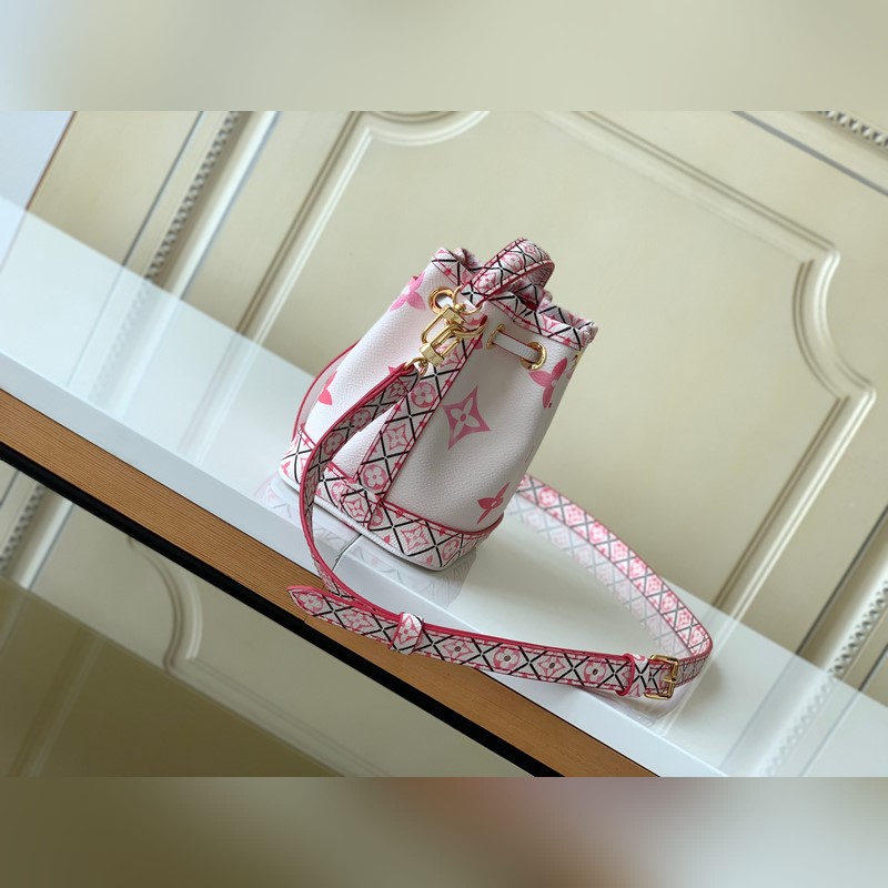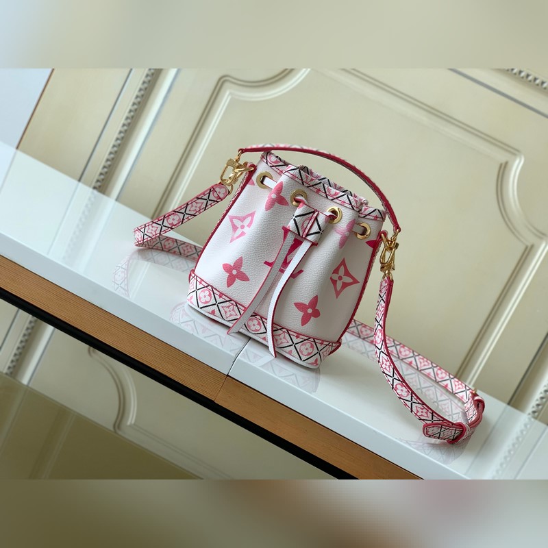 [하이위안 외곽 싱글 리얼 홈 샷] [나노 노에 핸드백] M82386 (2024년 여름) 휴가용 컬렉션의 이 나노 노에 백은 여름 색상의 코팅된 캔버스 표면에 큰 모노그램 패턴이 특징입니다. 끈 탈착식 손잡이 탈착식 및 길이 조절이 가능한 어깨 끈으로 완성되어 클래식 노에 백의 컴팩트 버전을 재현합니다. 크기: 13.0 x 16.0 x 10.0cm