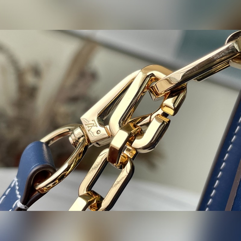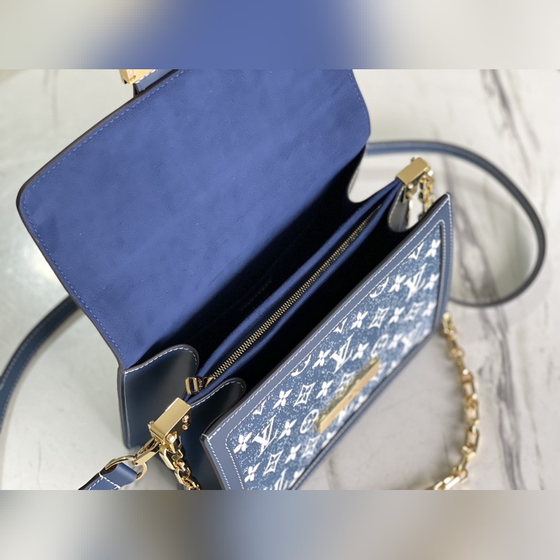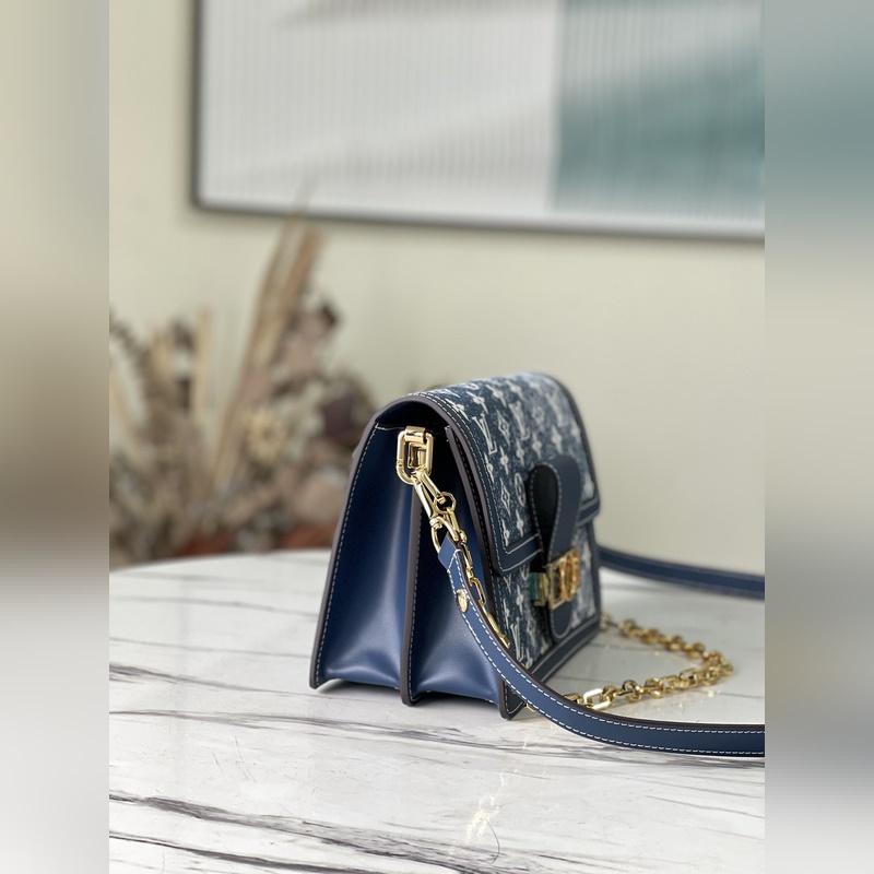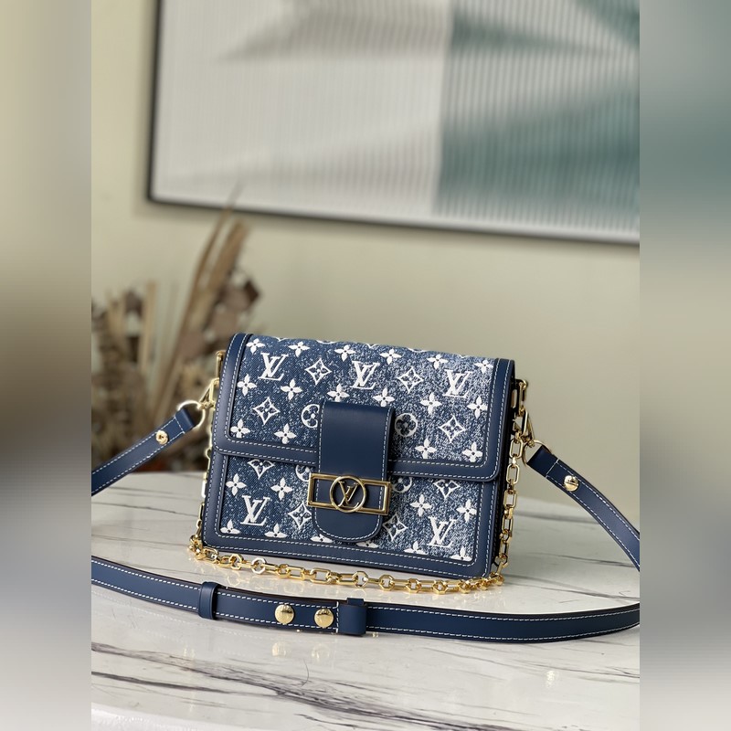 최고급 오리지널 M59631 데님 블루 청바지 한 벌 이 Dauhine 중형 핸드백은 클래식 로고 데님으로 만들어졌습니다. 소가죽 트림과 함께 새로운 복고풍 분위기를 자아냅니다. 크기는 5 x 17 x 10.5cm(길이 x 높이 x 너비)입니다.
