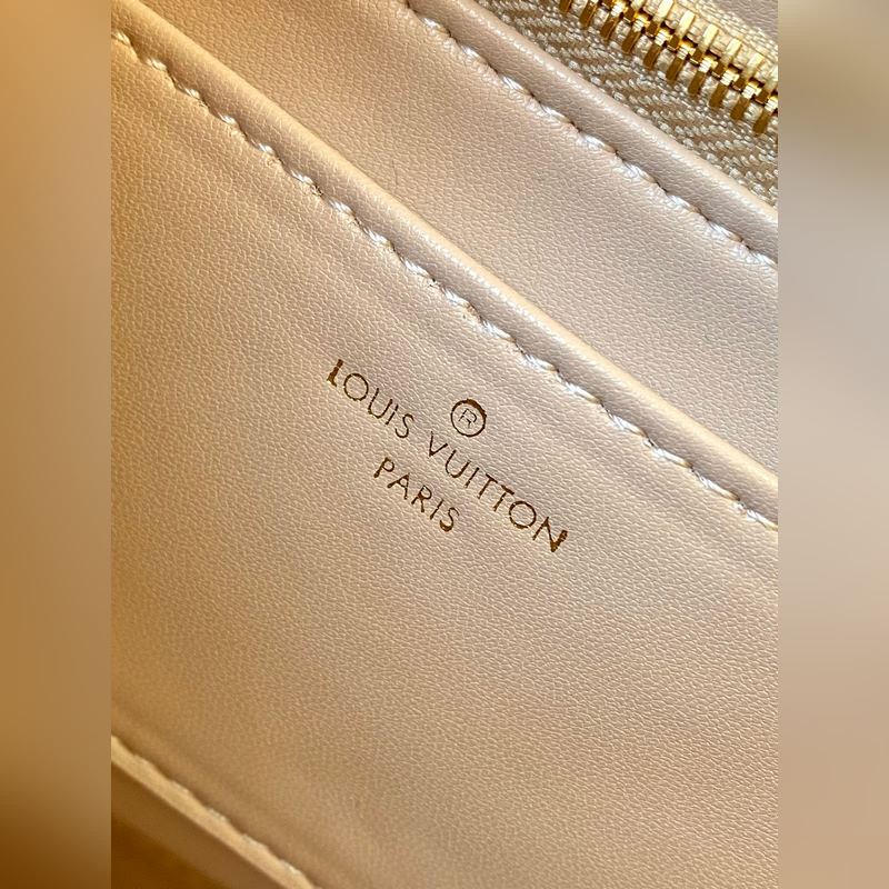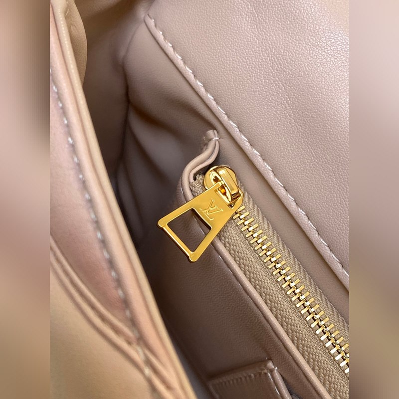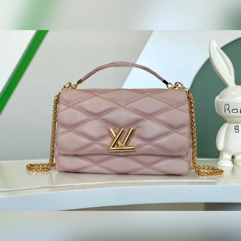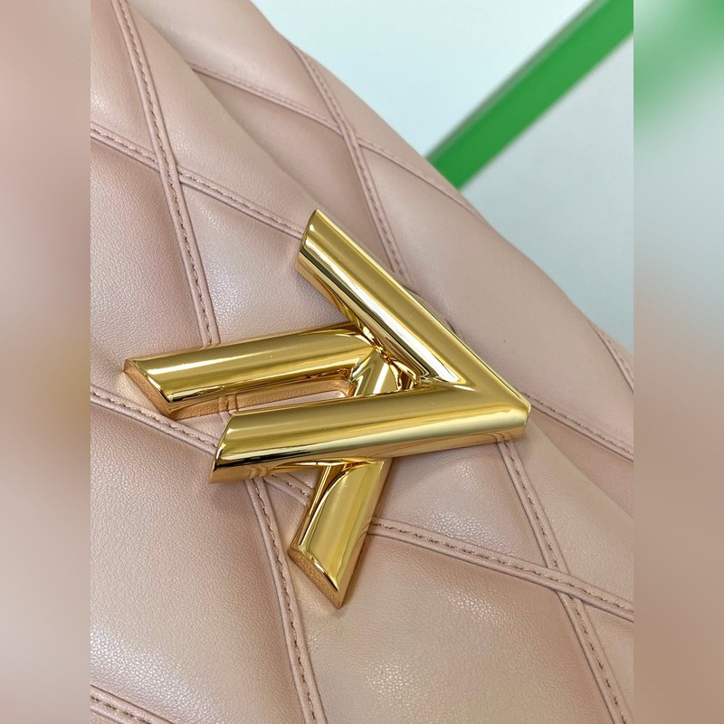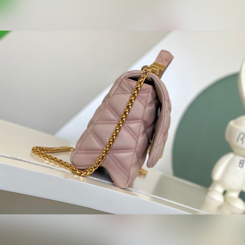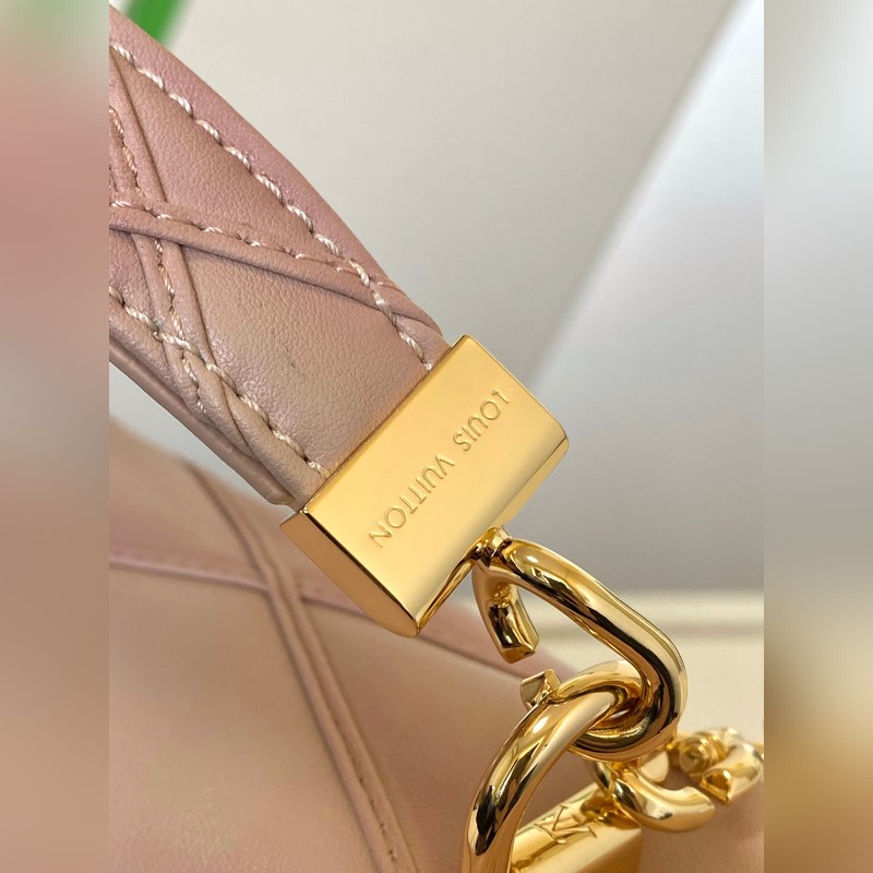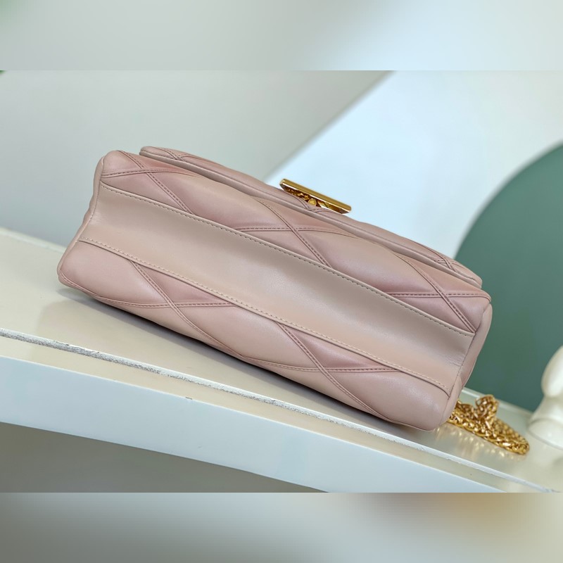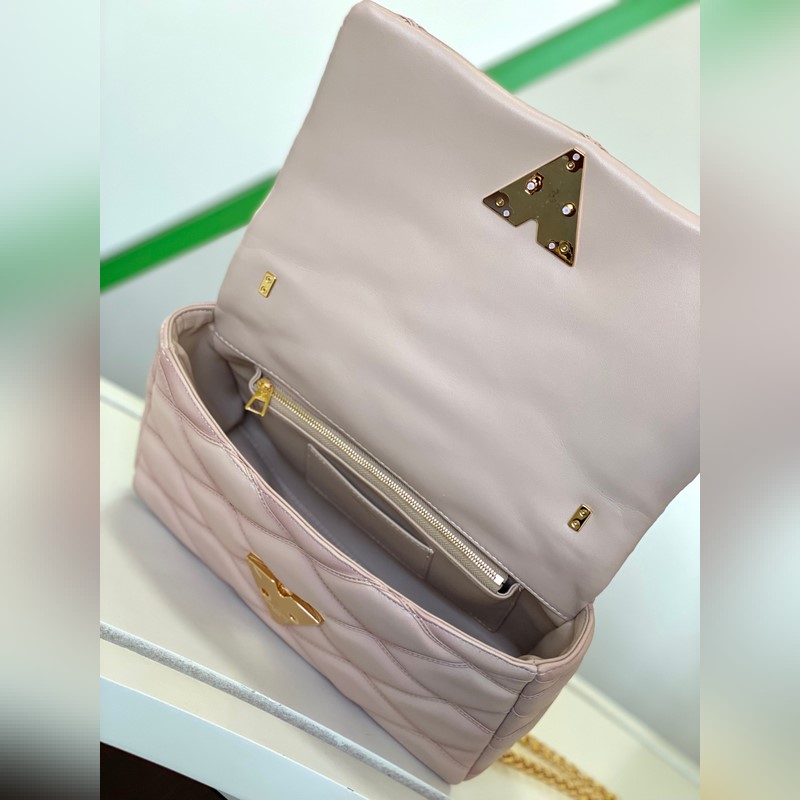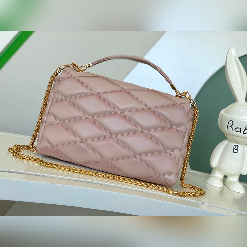 [원작 호이웬 싱글 리얼 홈 샷] GO-14 23689 퀼팅 처리된 양가죽 소재의 살구색 대형 가방 LV 트위스트 오프닝 플랩 내부 지퍼 포켓 뒷면에 거울이 달린 패치 포켓. 상단 손잡이와 슬라이딩 체인을 분리하여 다양한 방법으로 휴대 가능. 31 x 19.5 x 11cm (길이 x 높이 x 너비) 양가죽 양가죽 트림 소가죽 안감 금속 부품 LV 플랩 트위스트 락 지퍼 달린 뒷면 내부 포켓 뒷면 안쪽 패치 포켓에 거울 부착 체인: 조정 및 제거 가능 체인 반 길이: 26.0cm 조절 가능한 체인 길이: 56.0cm 핸들: 단일 핸들 탈착 가능