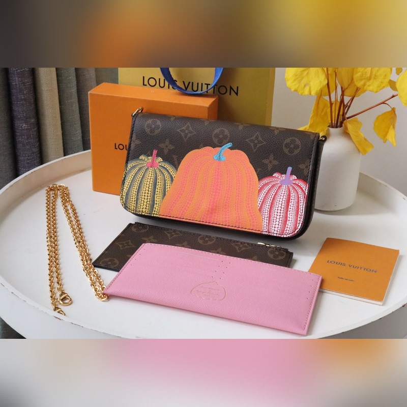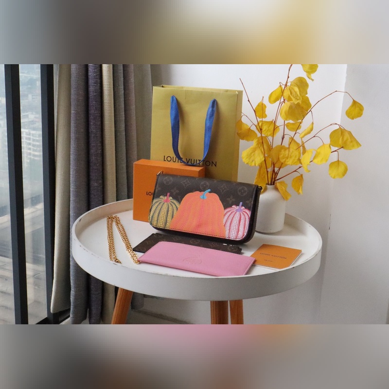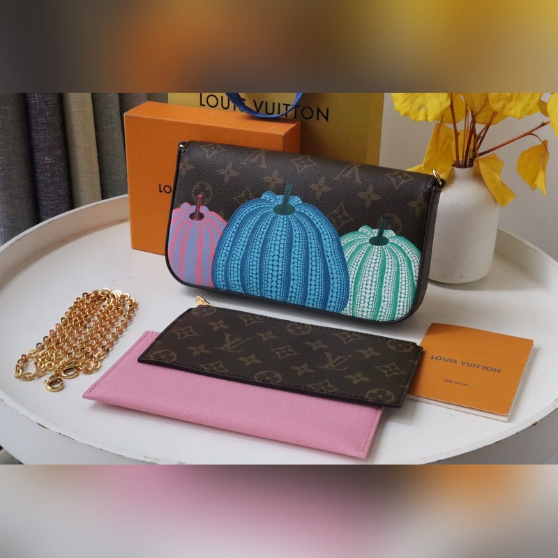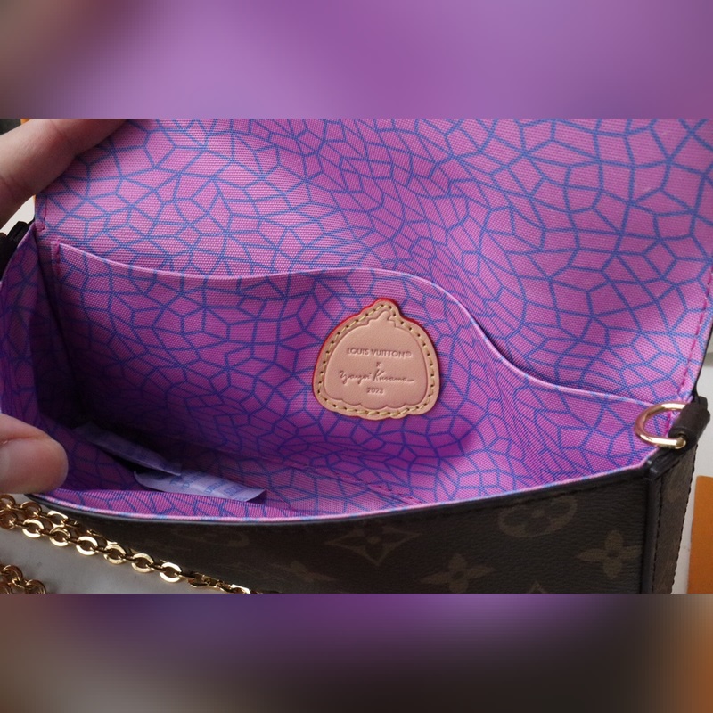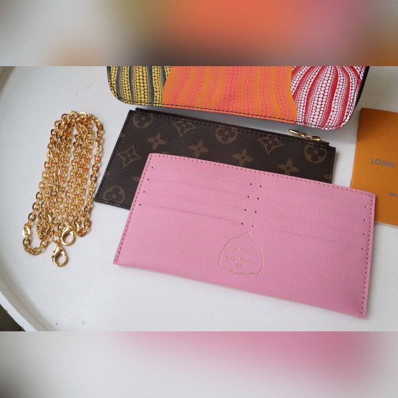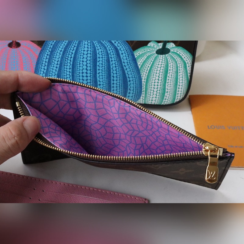 M82108 호박 스크린 인쇄 M61276 Trilogy LV x YK Pochette Felicie 핸드백 루이비통과 쿠사마 야요이의 콜라보레이션으로 탄생한 특별한 신제품 컬렉션에 완벽하게 어울리는 창의적이고 매력적인 LV x YK Pochette Felicie. 많은 사랑을 받고 있는 일본의 예술가 쿠사마 야요이는 호박을 따뜻함과 낙관주의의 상징으로 여기며 그녀의 그림과 조각품의 주요 주제로 사용합니다. 이 세련되고 실용적인 클러치 백은 호박에서 영감을 받아 모노그램 캔버스에 세 가지 밝은 색상의 호박 패턴이 인쇄되어 있습니다. 탈착식 카드 홀더가 있어 비접촉 결제에 적합합니다. MsLy 크기 21 x 12 x 3cm.