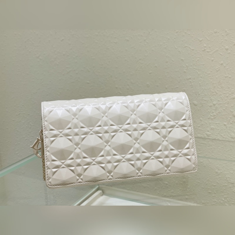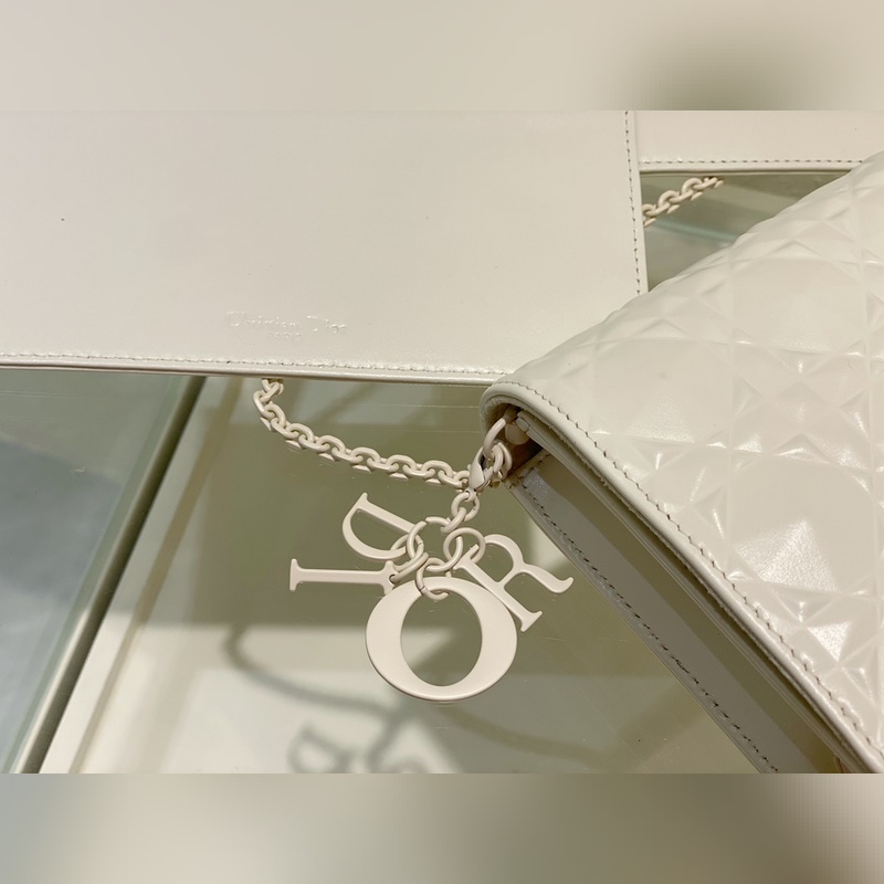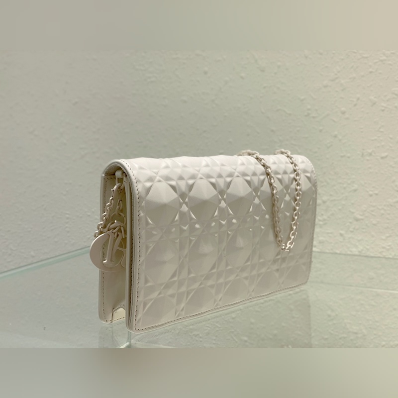 레이디 디올 체인백은 흰색 소가죽으로 제작되었으며 다이아몬드 무늬의 등