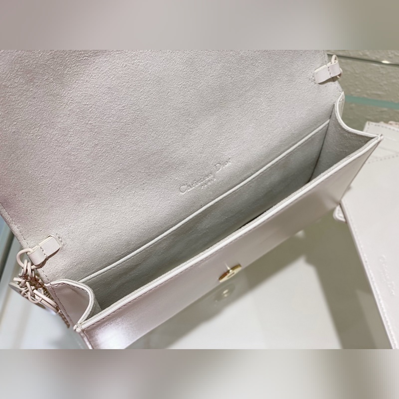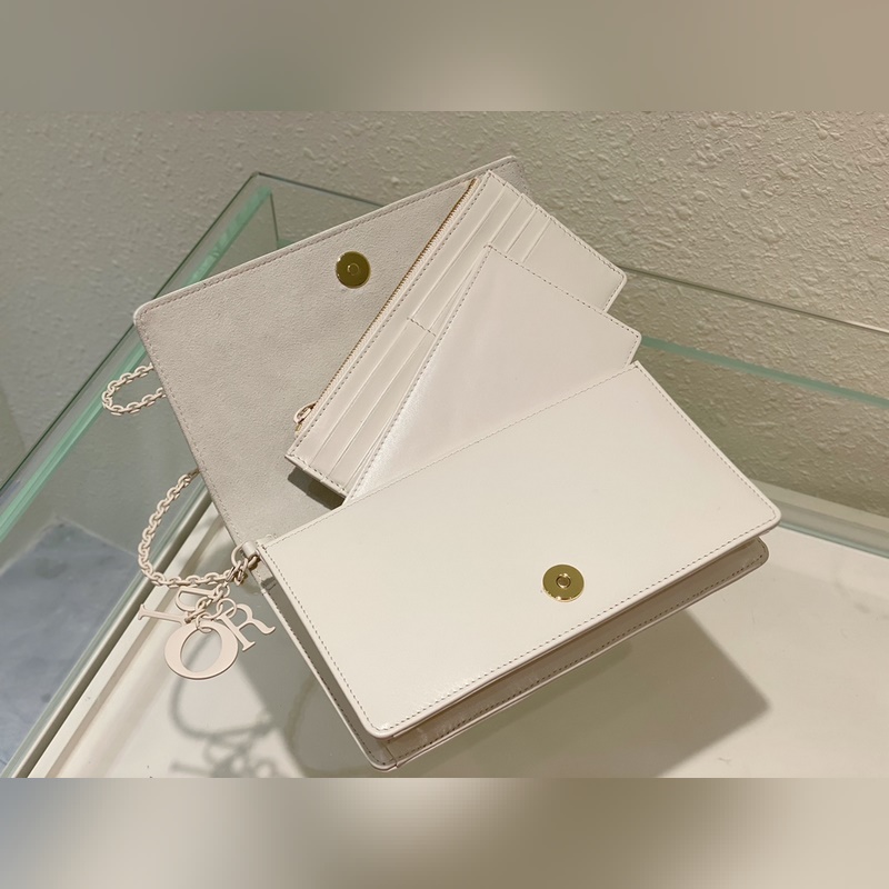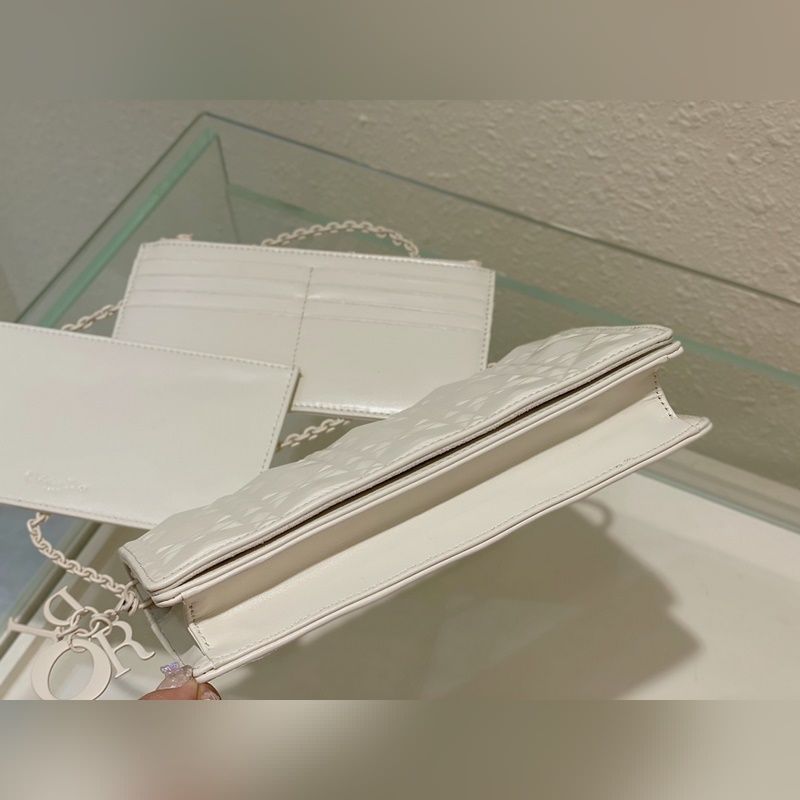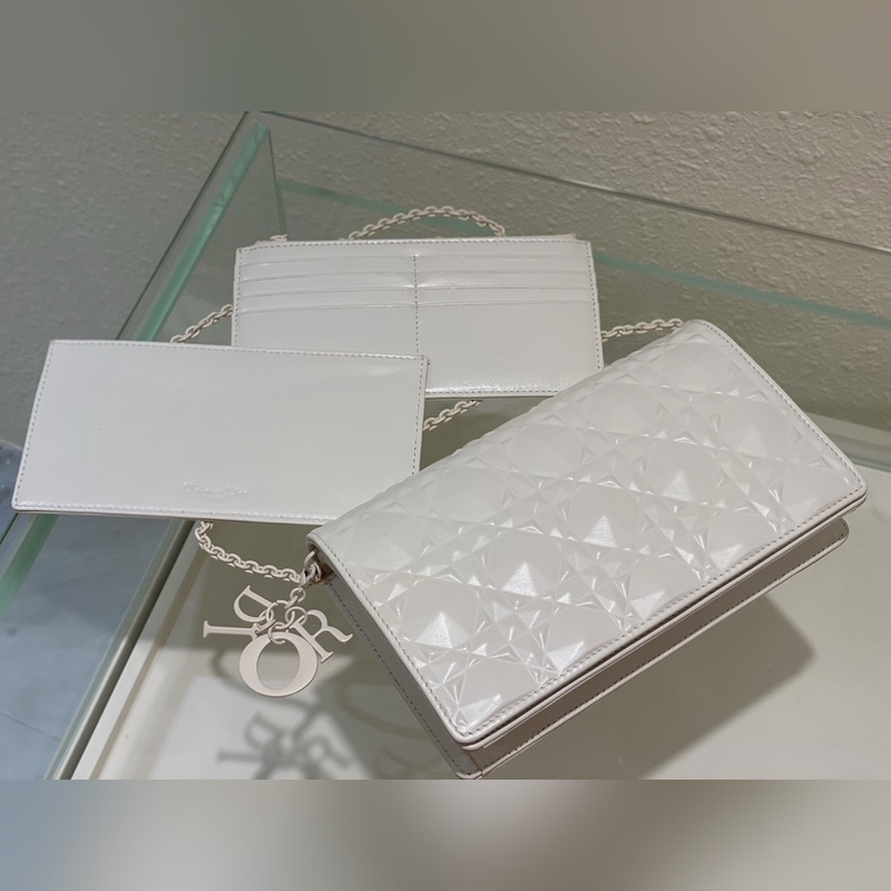레이디 디올 체인백은 흰색 소가죽으로 제작되었으며 다이아몬드 무늬의 등나무 직조와 탈착식 D.I.O.R. 참이 특징입니다. 탈착식 체인 숄더 스트랩과 탈착식 카드 홀더 지퍼 파우치가 함께 제공되며 이 모든 것은 별도로 사용할 수 있습니다. 이 클러치백은 디올의 상징적인 패턴을 독특하게 해석한 것으로 같은 시리즈의 다른 아이템과 쉽게 매치할 수 있어 어떤 룩에도 마무리 터치를 더해 줍니다.