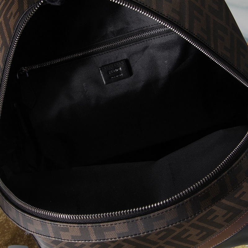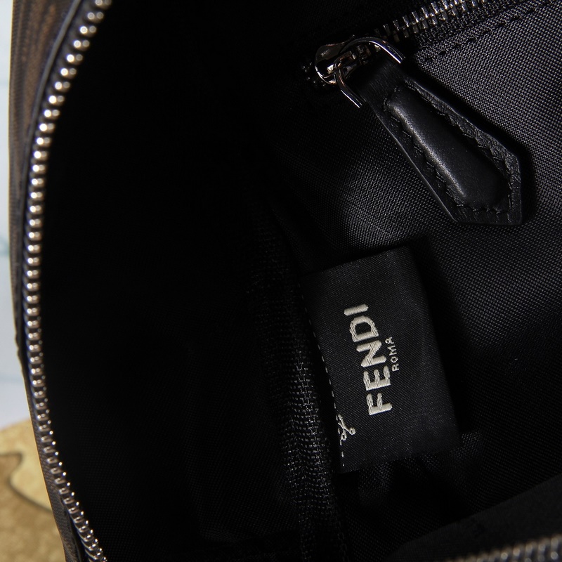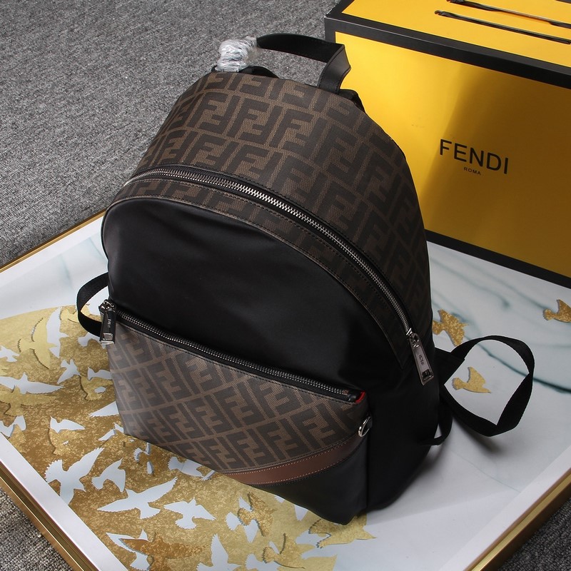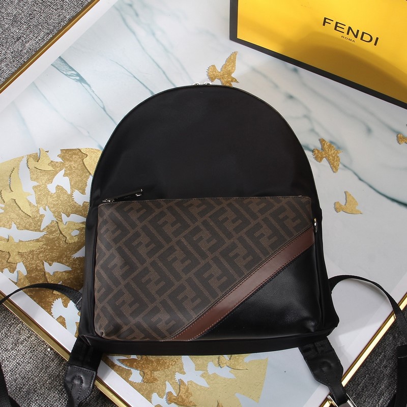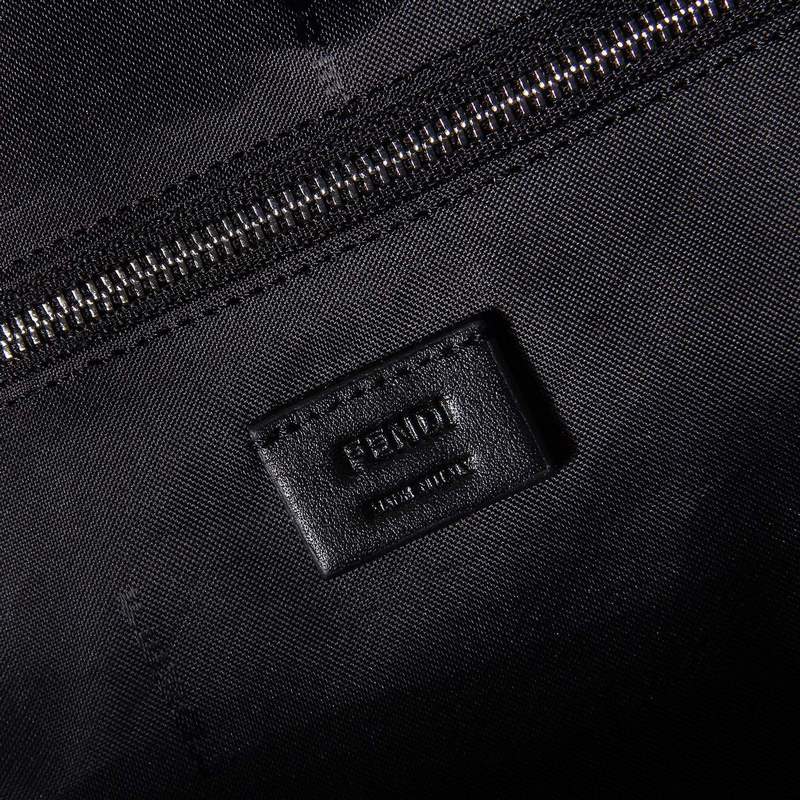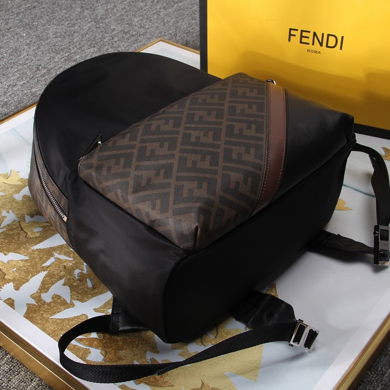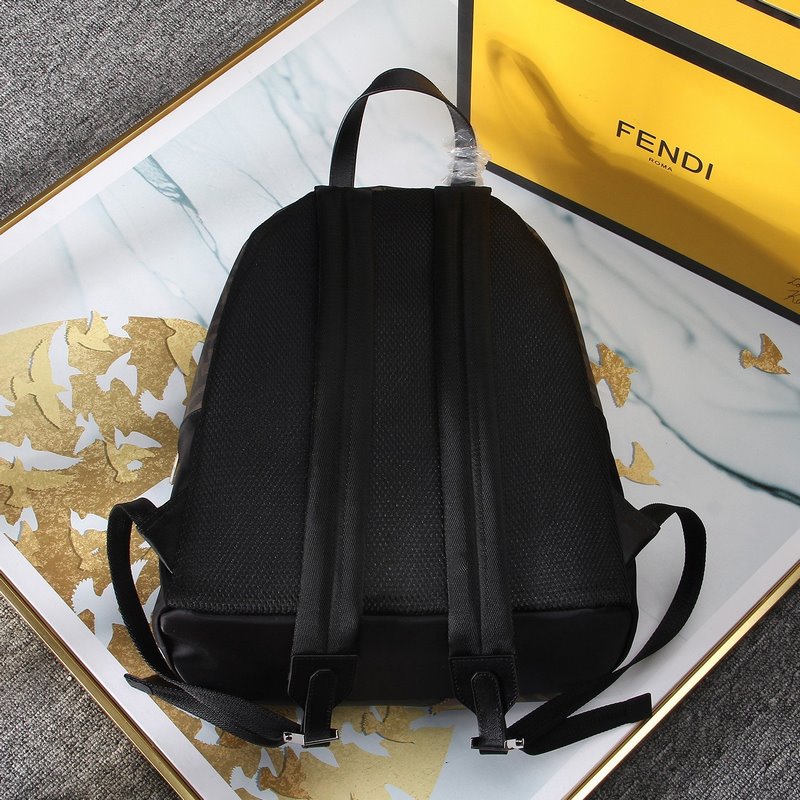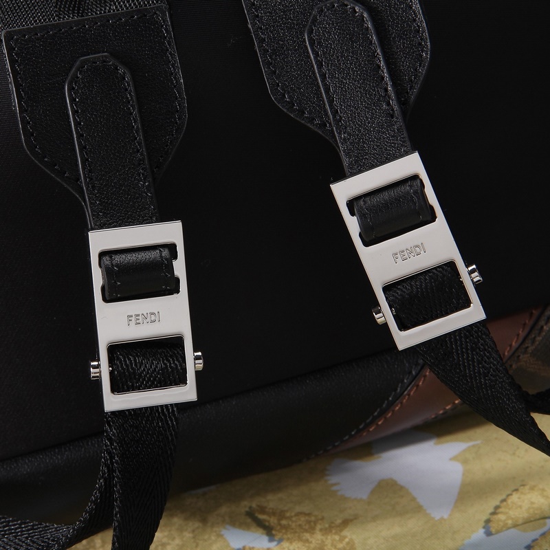 FENDI 모델 번호 9907 가죽 인서트가 있는 검은색 나일론 백팩 작은 괴물 눈 패턴 앞면 지퍼 포켓 가죽 측면과 손잡이 통기성 있는 기술적 메시 소재 뒷면 이중 지퍼 잠금장치 내부 포켓 34x38x14cm 항목 번호: XY9618780