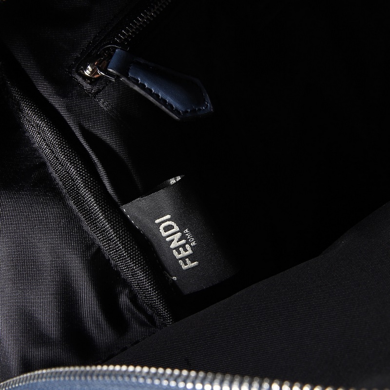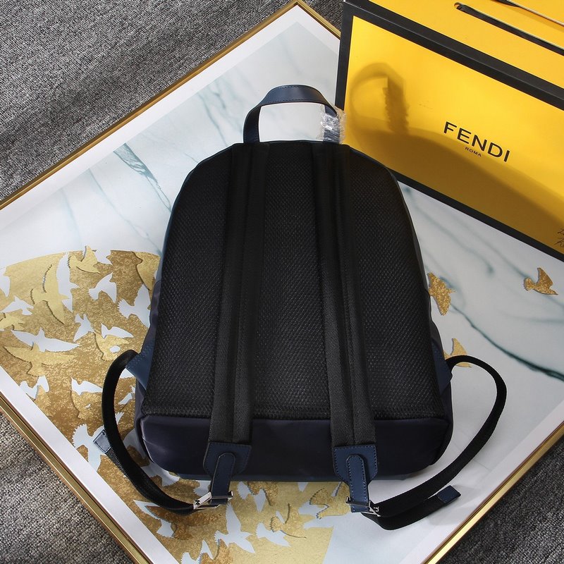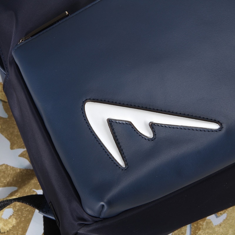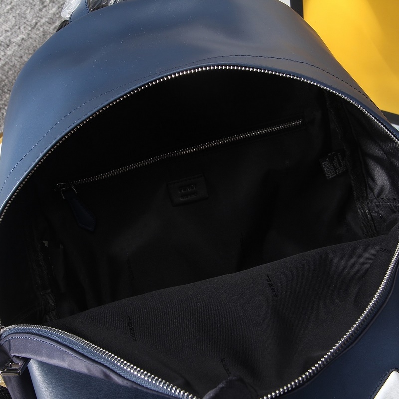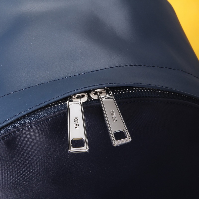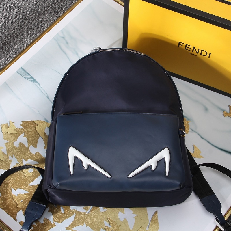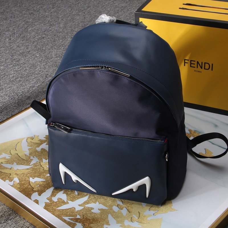 FENDI 모델 번호 9904 큰 앞주머니 백팩 통기성이 좋은 첨단 메쉬 소재의 등판 조절 가능한 더블 지퍼 잠금장치 내부 포켓 엠보싱 처리된 흰색 악마의 눈 모티브가 있는 파란색 나일론과 소가죽 팔라듐 도금 금속 부품 크기 33cm 항목 번호: XY9618780