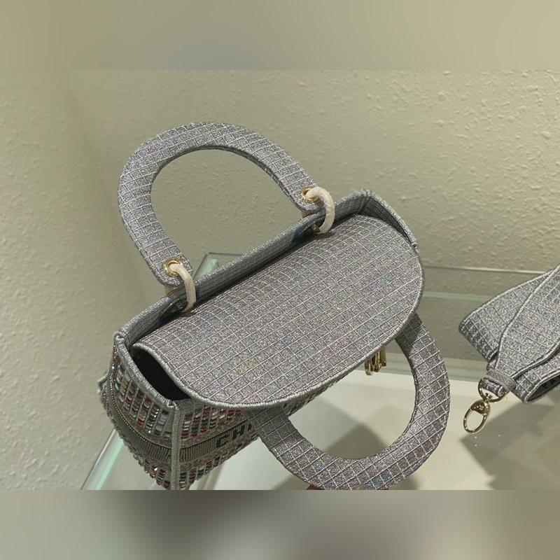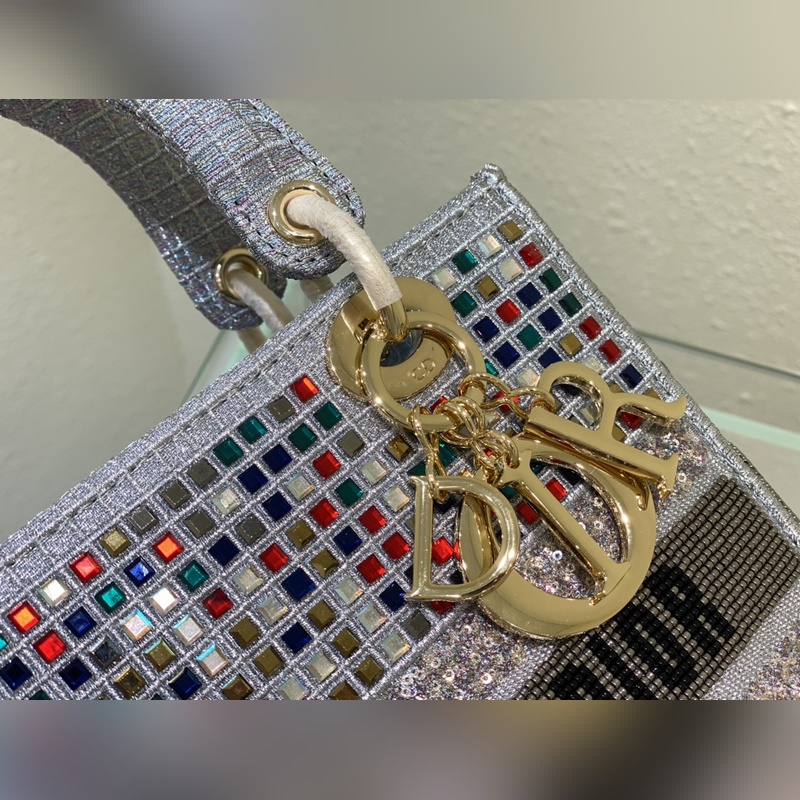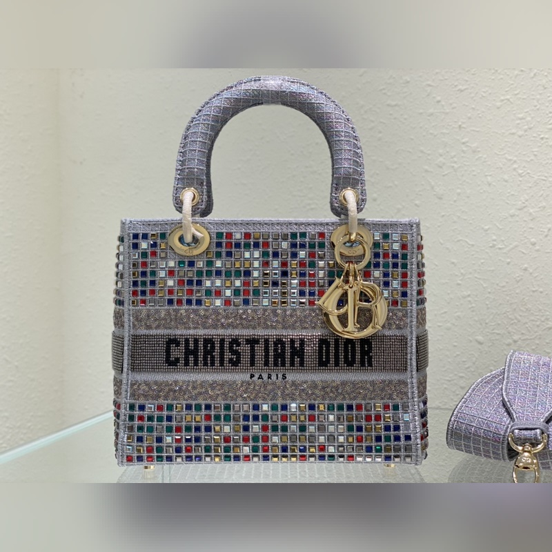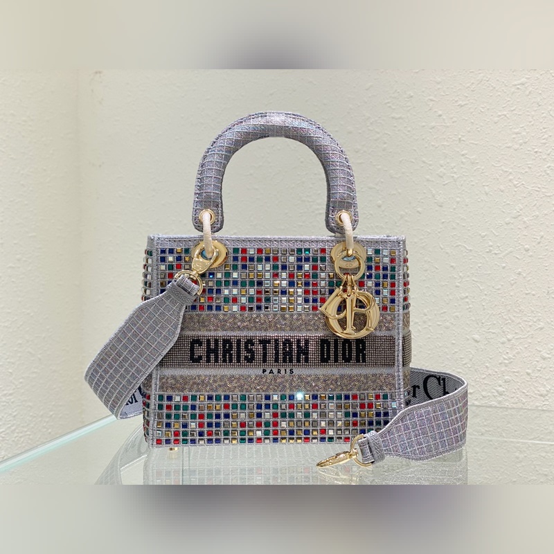 레이디 디올 핸드백은 우아함과 아름다움에 대한 디올의 심오한 통찰력을 담고 있습니다. 은색 자수 톤 온 톤 실크 실로 만든 격자 무늬 다색 사각형 다이아몬드 요소로 제작된 세련되고 우아한 핸드백은 가벼운 골드 마감의 시그니처 금속 D.I.O.R. 참으로 장식되어 절묘한 실루엣에 생기를 더합니다. 이 가방에 들어 있는 컬러 다이아몬드 중 일부는 사용 중에 떨어지는 것이 정상입니다.