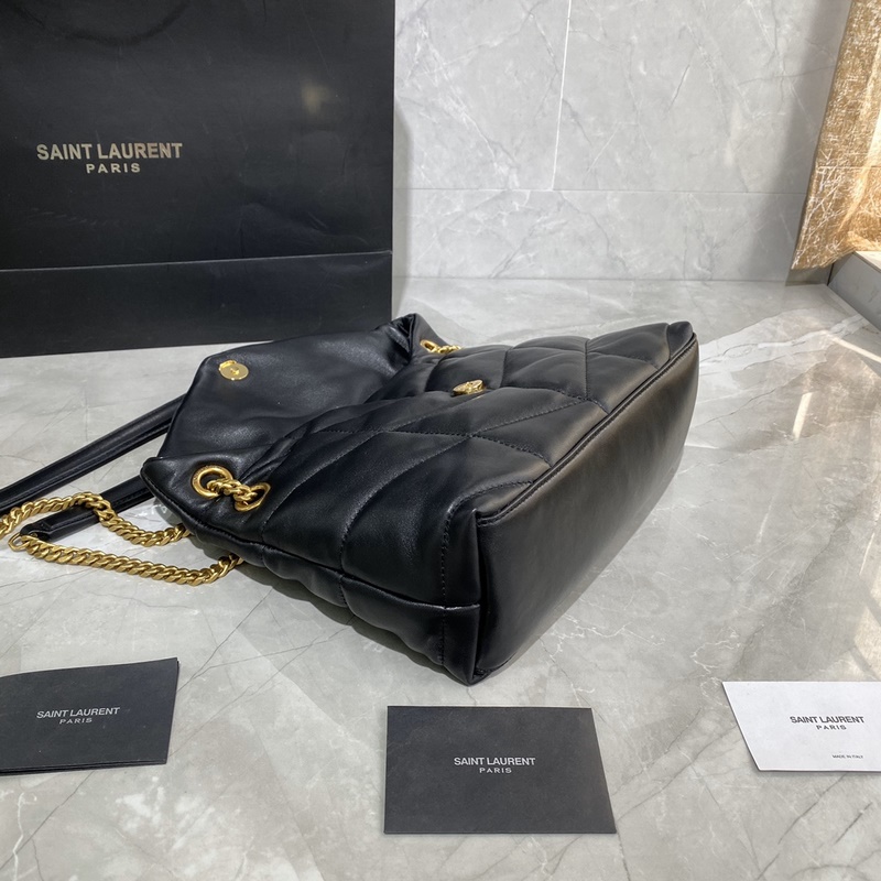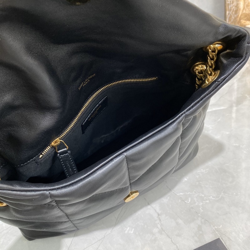29cm_블랙과 골드 컬러의 LOULOU PUFFER 퀼팅 양가죽 가방 100% 양가죽으로 만들어져 촉감이 부드럽고 섬세하며 마치 구름을 안고 있는 듯한 느낌을 줍니다. 클래식한 Y 패밀리 로고 체인 단추 장식 하드웨어는 모두 브러시드 실버 메탈로 만들어졌으며 무광택의 반투명 마감 처리되어 있습니다. 크기: 29x17x11cm 모델: 577476