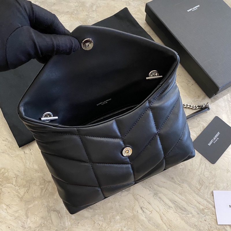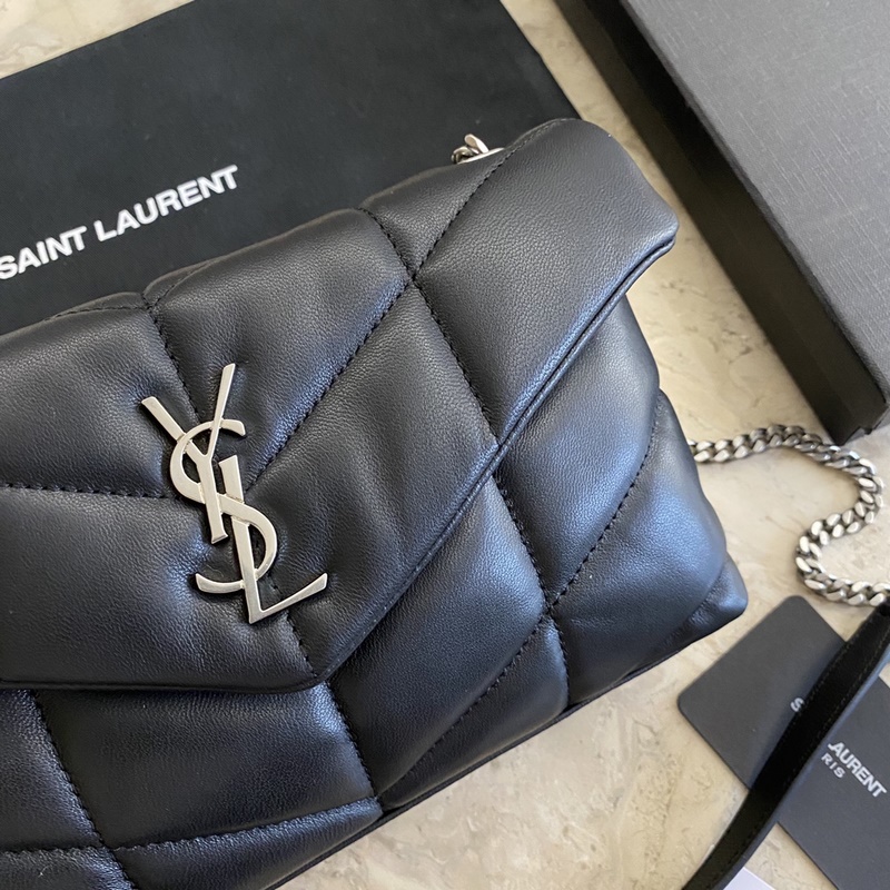 생 로랑 YSL LOULOU PUFFER 미니 백은 반으로 접어서 한쪽 어깨에 메는 퀼팅 양가죽 백 브러시드 메탈 하드웨어 그로그랭 안감 마그네틱 스냅 잠금장치 내부 지퍼 포켓 1개 크기 23*15.5*8.5cm 코드 620333