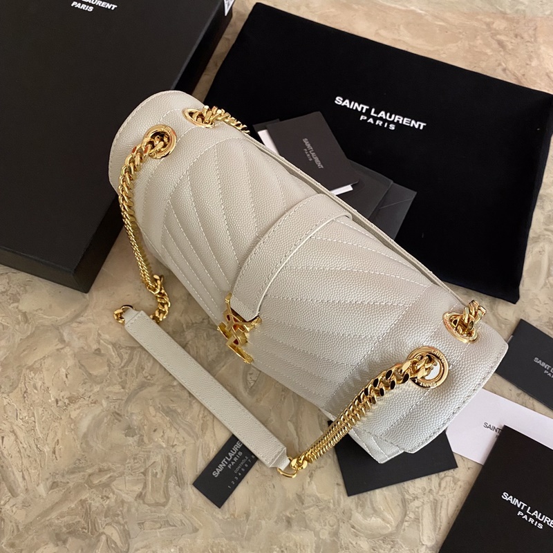 오프 화이트 YSL 생 로랑의 새로운 클래식 그리드 메신저 백 플랩 핸드백 금속 YSL 로고 금속 체인 가죽 체인 가죽 스트랩 수성 및 수직 자카드 리프팅 솔기 장식. 크기: 24x17.5x6cm 코드 392739