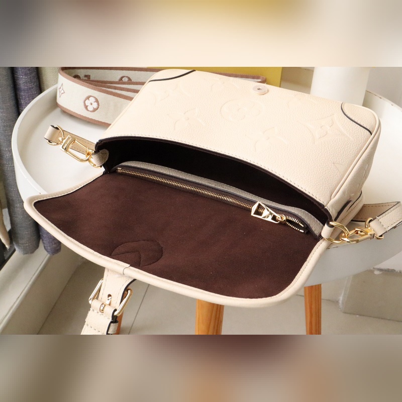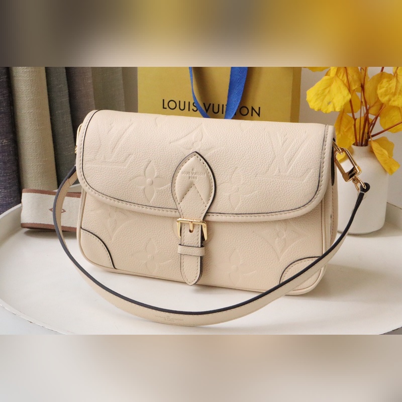 이 다이앤 백은 루이비통의 클래식한 모노그램 앙프렝뜨 엠보싱 가죽으로 만들어졌습니다. 탈착식 와이드 자카드 숄더 스트랩에 브랜드 로고가 짠 형태로 들어가 있어 탈착식 가죽 숄더 스트랩에 크로스 바디 옵션을 추가하여 우아하거나 스포티한 스타일에 유연하게 맞출 수 있습니다. 크기: 23 x 16 x 8.5cm