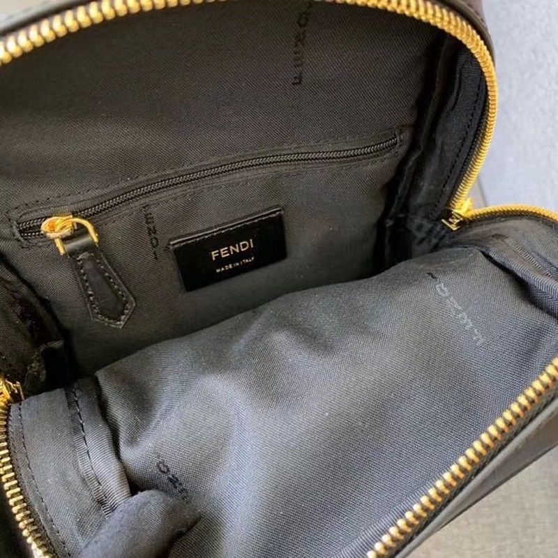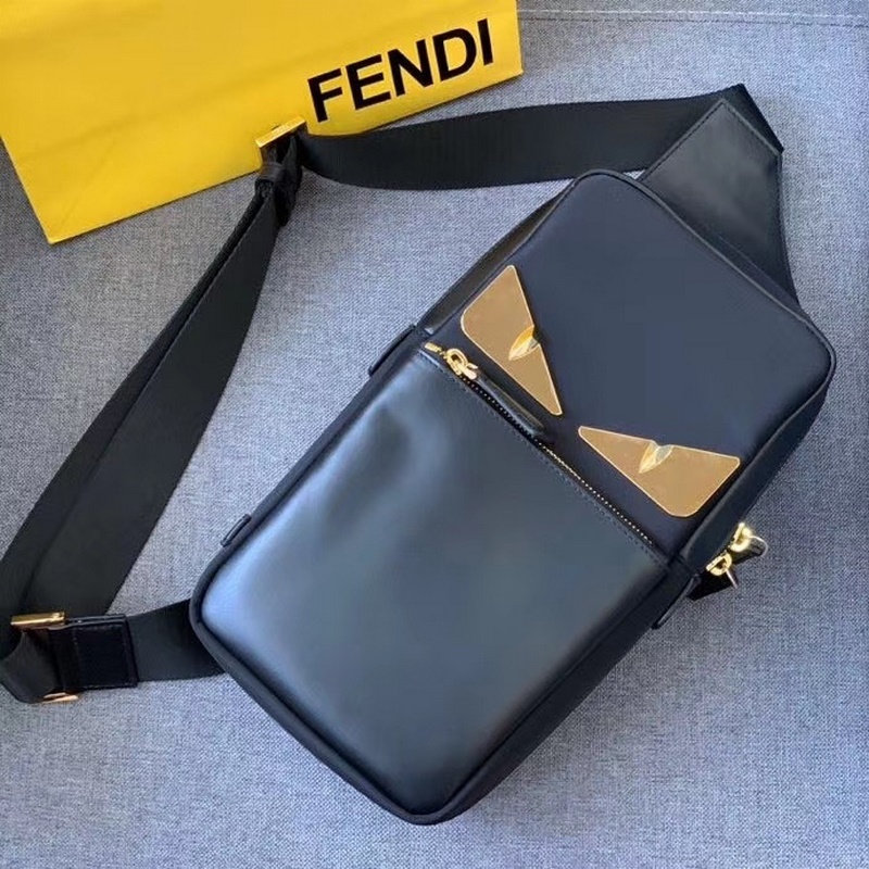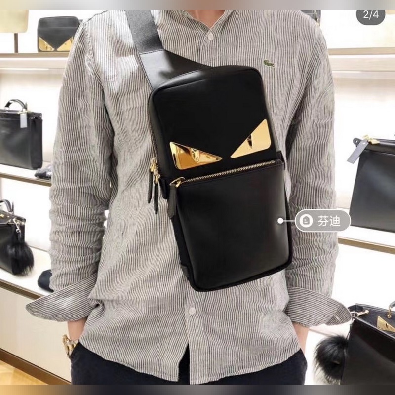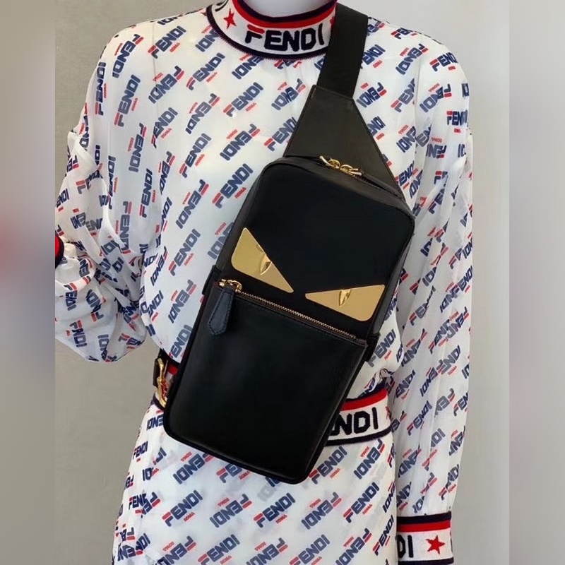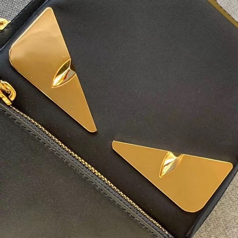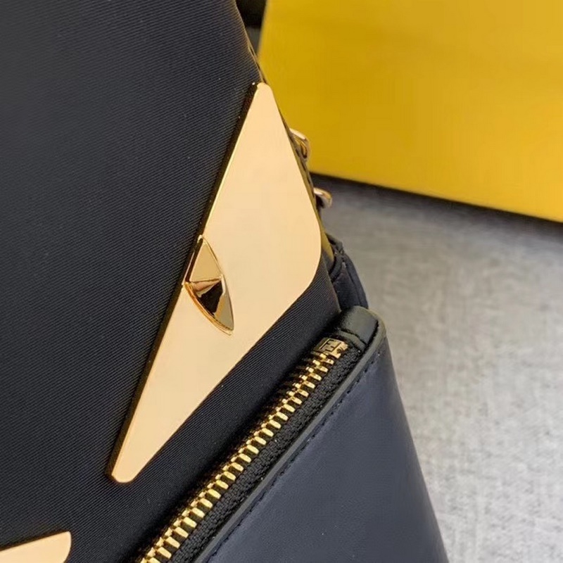 FENDI 숄더백 중앙에 수납 공간 지퍼가 달린 앞주머니 통기성이 좋은 뒷면의 기술적 메시 소재 길이 조절이 가능한 어깨끈. 더블 지퍼. 검은색 나일론 소재와 송아지 가죽으로 제작. 금도금 금속 장식 가방 벌레의 눈 모양. 크기 5:16:29cm