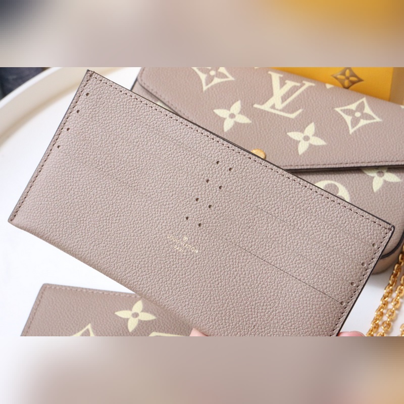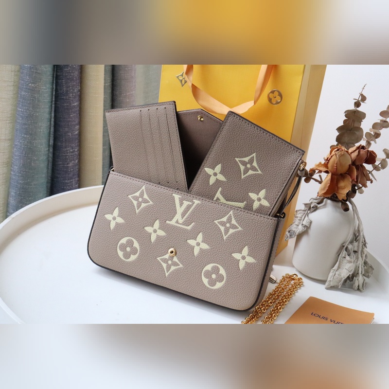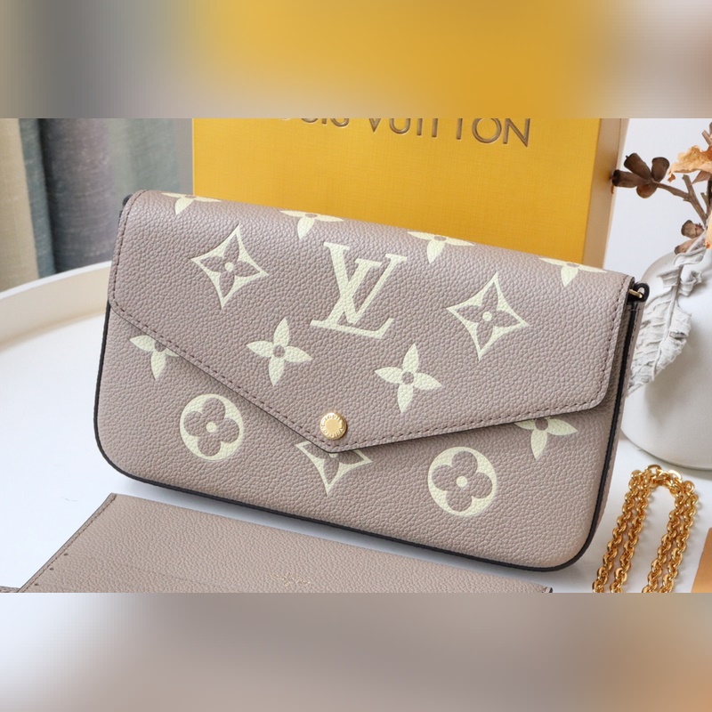 이 포쉐트 펠리시 체인백은 모노그램 앙프렝뜨 가죽에 모노그램 프린트가 적용되어 있으며 탈착식 내부 포켓이 있는 봉투 스타일의 구성입니다. 체인을 부착하면 클러치에서 숄더백으로 변형할 수 있습니다. 21.0 x 12.0 x 3.0 cm