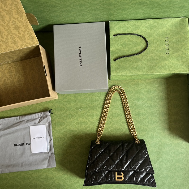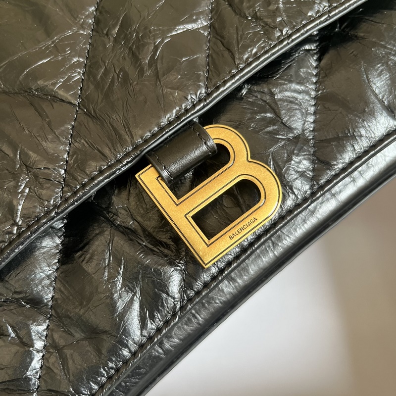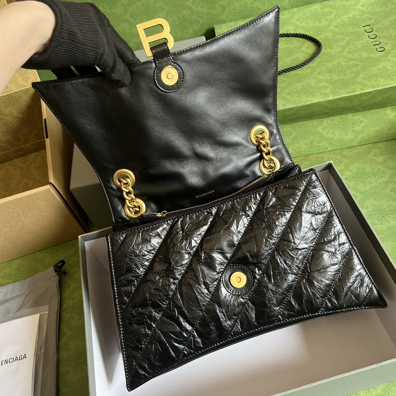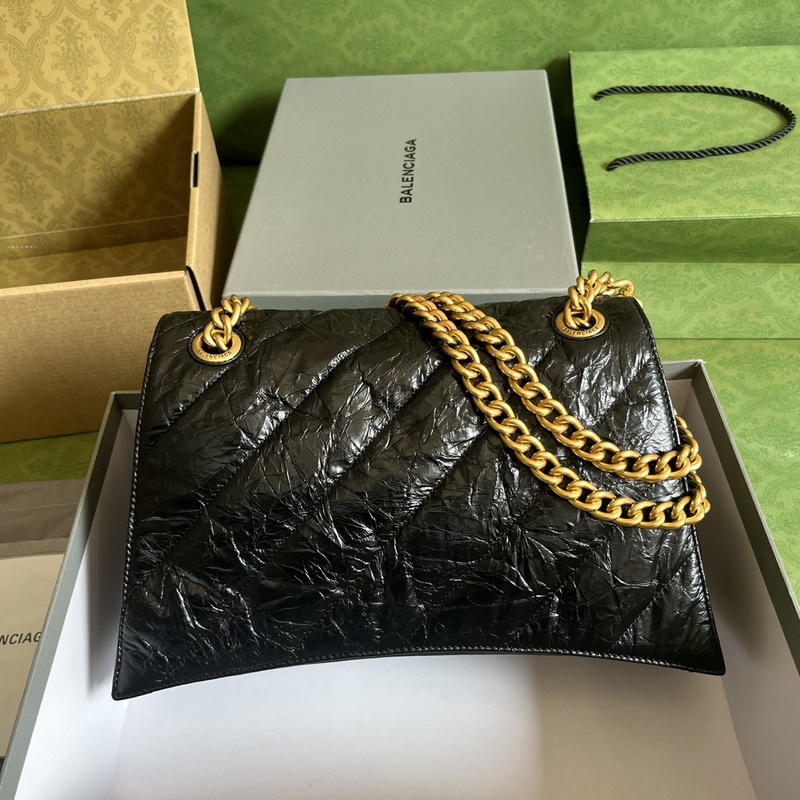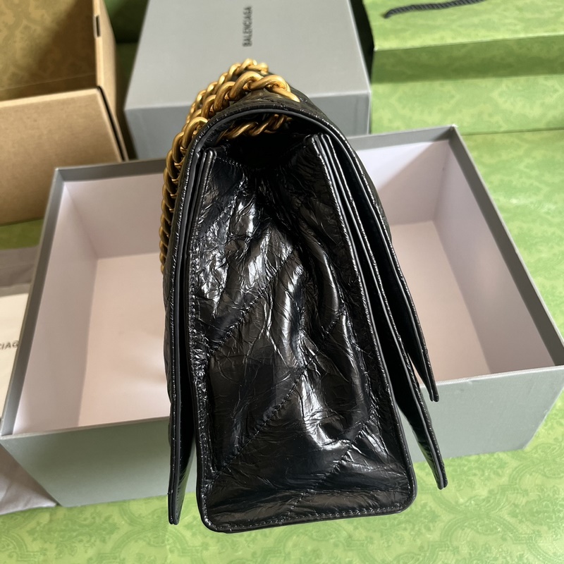 발렌시아가 23 봄/여름 컬렉션 - 크러쉬 강력하고 실용적인 대형 가방이 다시 돌아왔습니다! Crush는 모래시계 모양의 가방에 클래식한 B자형 금속 로고가 앞면에 있는 디자인입니다. 이 가방은 용량이 크고 내부에 여러 개의 수납 공간이 있어 편리합니다. 두꺼운 금속 체인 스트랩은 길이를 자유롭게 조절할 수 있습니다. 한쪽 어깨에 메거나 손에 들거나 팔 아래에 매는 등 착용하는 방법에 따라 완전히 다른 분위기를 연출할 수 있습니다. 모델: 716393. 크기: 31x19.8x6.9cm. 색상: 검은색/오일 왁스 처리된 진짜 가죽.