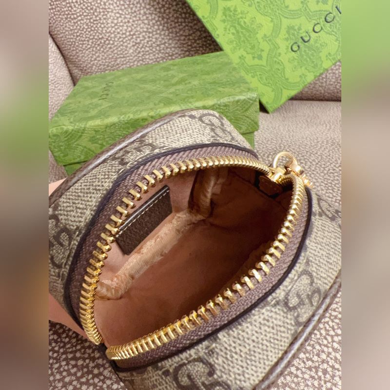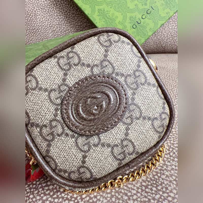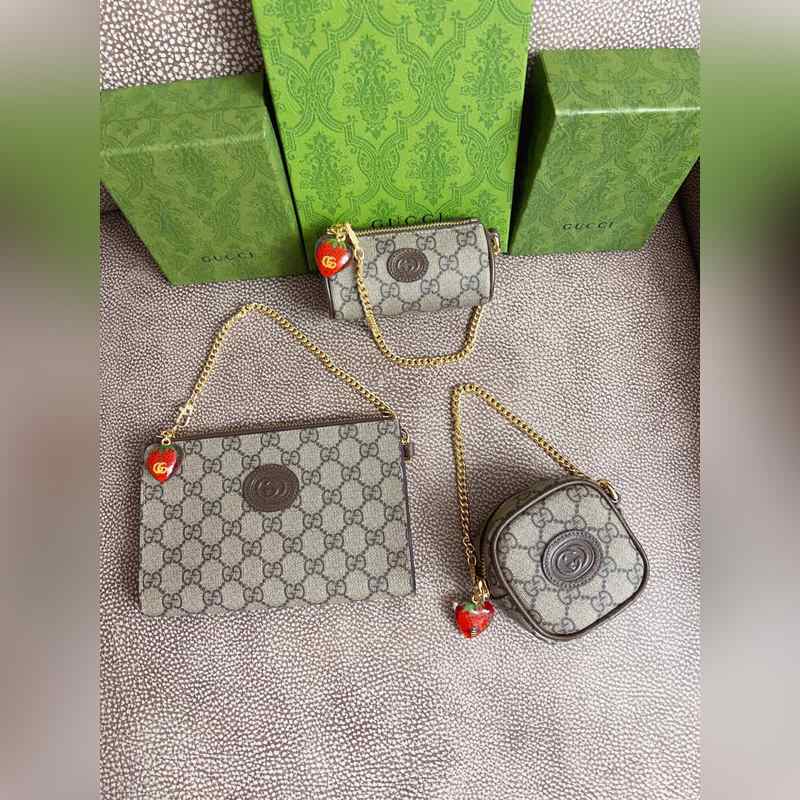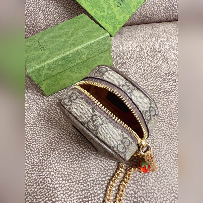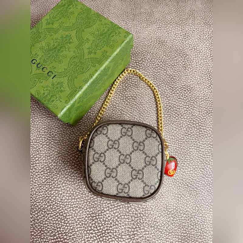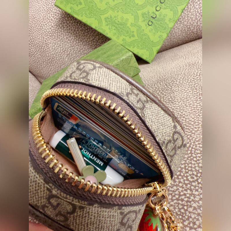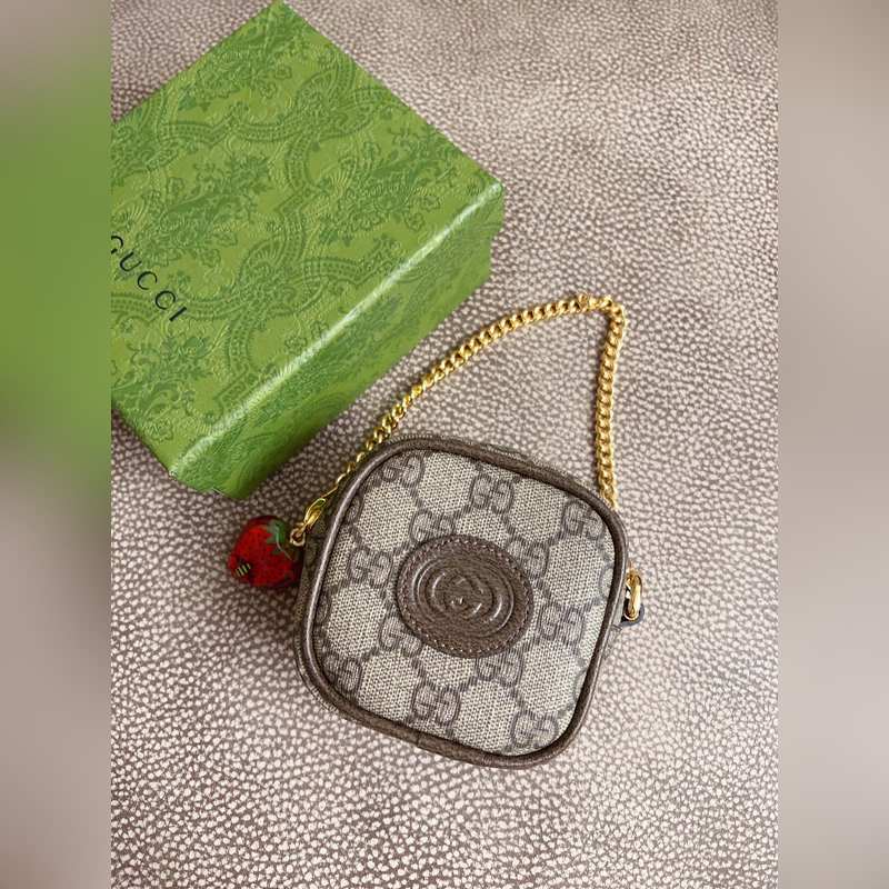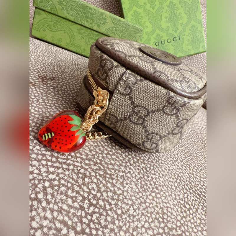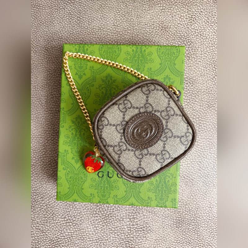구찌의 최신 미니 동전 지갑 주요 패션 잡지에서 강력 추천하는 빨간색 수첩! 갈색 소가죽 파이핑 레진 더블 G 딸기 매력 맞물리는 이중 G 타원형 태그 금속 체인 팔찌(높이 7cm) 지퍼 잠금 모델: 726252 8.5x 8x5.5cm