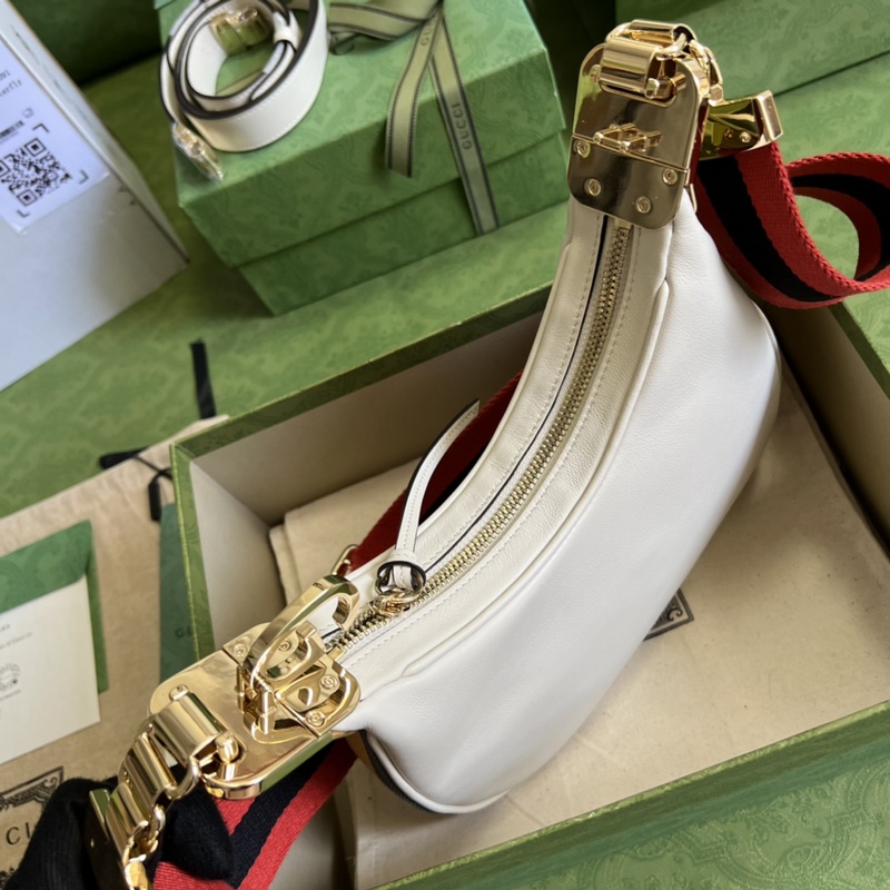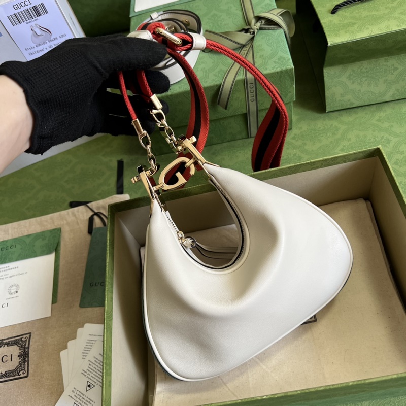 GGGucci Attache 시리즈 소형 숄더백 Gucci Love March 시리즈는 브랜드의 클래식한 요소를 재해석하고 헐리우드의 변치 않는 매력에 경의를 표합니다. 이 액세서리는 눈에 띄는 초승달 모양을 특징으로 하며 G자형 고리 잠금장치가 독특한 디자인 미학을 더해 줍니다. 클래식한 액세서리와 부드러운 소재의 조합으로 복고풍의 매력을 절묘하고 낭만적으로 해석합니다. 이 소형 아이템은 흰색과 흑단색 GG Supreme 캔버스로 만들어졌으며 흰색 가죽 파이핑으로 장식되어 있습니다. 화이트와 에보니 GG 수페리어 캔버스 팔라듐 컬러 하드웨어 녹색-노란색 웨빙 면과 리넨 안감 추가 가죽 어깨 스트랩 탈착식 웨빙 어깨 스트랩(높이 45cm) G 후크와 지퍼 잠금장치. 모델: 699409. 크기: 23(가로) x 22(세로) x 5cm(깊이) 색상: 흰색/원래 가죽.