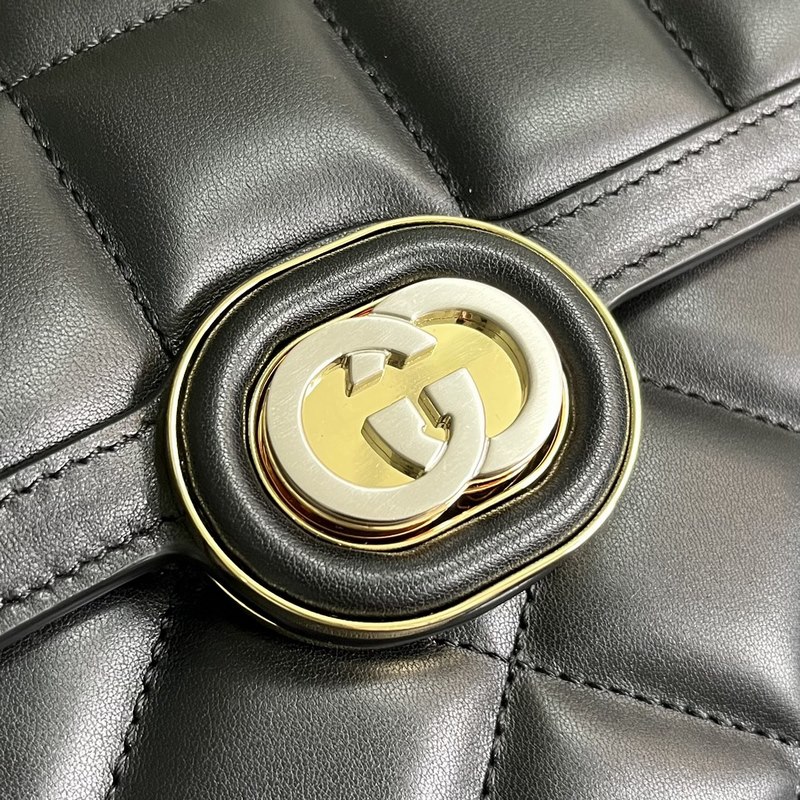구찌 데코 스몰 숄더백. 구찌는 클래식한 실루엣과 정교한 원단에 새로운 접근 방식을 도입하여 새로운 생명을 불어넣고 지난 수십 년 동안의 사랑에 대한 감사를 표현하면서 계속해서 그 영역을 확장하고 있습니다. 이 새로운 숄더백은 브랜드의 아카이브에서 가져온 상징적인 심볼을 퀼팅 디자인에 섬세하게 적용했습니다. 플랩 클로저의 인터로킹 GG 모티프 1970년대 스타일의 가죽 파이핑 체인 숄더 스트랩 등 레트로 감성이 물씬 풍깁니다. 블랙 퀼팅 가죽 골드 톤 하드웨어 가죽 안감 인터로킹 GG 디테일 내부: 지퍼 포켓 1개 길이 조절이 가능한 슬라이딩 체인 숄더 스트랩으로 높이 47.5cm의 숄더백 또는 높이 26cm의 탑 핸들로 착용할 수 있습니다. 무게: 약 0.9kg. 모델: 740834. 크기: 25(가로) x 19.5(세로) x 8cm(깊이) 색상: 블랙/오리지널 가죽.