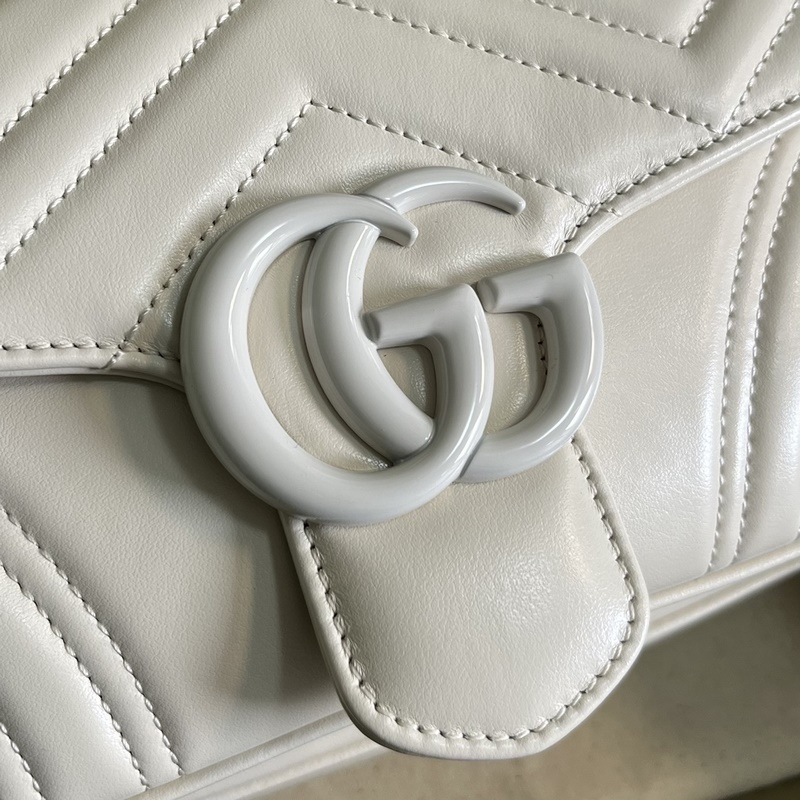 GG 마르몽 숄더백은 브랜드의 크리에이티브 디렉터가 각 시즌 컬렉션에서 엄선한 클래식한 아이템을 조합하여 구찌가 가장 좋아하는 핸드백을 따뜻하게 담아낸 제품입니다. GG 마르몽 핸드백 시리즈는 눈에 잘 띄는 더블 G 하드웨어와 정교한 요소가 돋보이는 퀼팅 마감으로 특징지어집니다. 이 숄더백은 화이트 가죽으로 제작되었으며 톤이 같은 하드웨어가 특징입니다. 화이트 퀼팅 V자형 가죽 화이트 세라믹 효과 마감의 황동 하드웨어 더블 G 탈착식 숄더 스트랩 체인 스트랩 숄더 스트랩. 모델: 734814. 크기: 26.5(가로) x 13(세로) x 7(깊이) 색상: 화이트/화이트 G 천연 가죽.