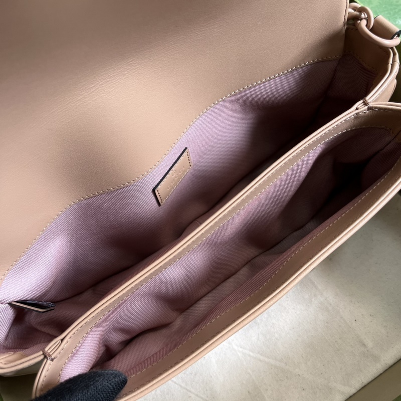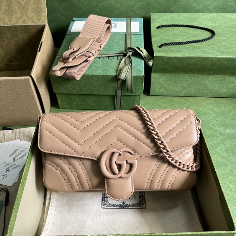 GG 마르몽 숄더백은 브랜드의 크리에이티브 디렉터가 각 시즌마다 가장 좋아하는 구찌 가방으로 선정됩니다. GG 마르몽 가방은 눈에 잘 띄는 더블 G 하드웨어와 정교한 요소가 돋보이는 퀼팅 마감으로 특징지어집니다. 이 숄더백은 로즈 베이지 가죽으로 제작되었으며 같은 색상의 하드웨어가 특징입니다. 로즈 베이지 퀼팅 V자형 가죽 로즈 베이지 세라믹 효과 마감의 황동 하드웨어 더블 G 탈착식 숄더 스트랩 체인 스트랩. 모델: 734814. 크기: 26.5(가로) x 13(세로) x 7(깊이) 색상: 로즈 베이지/G 금속 하드웨어.