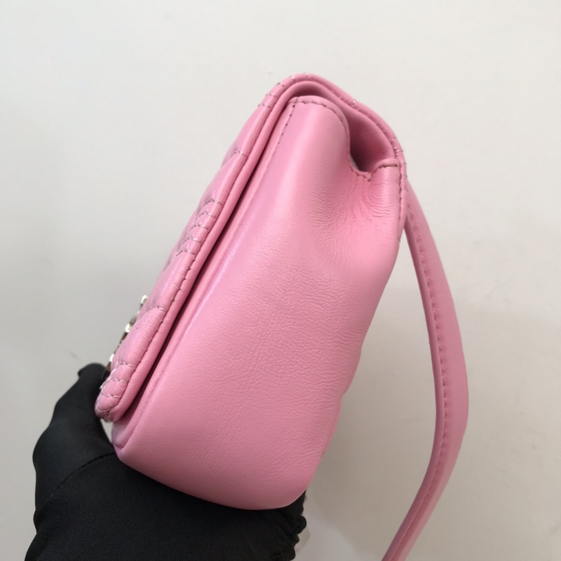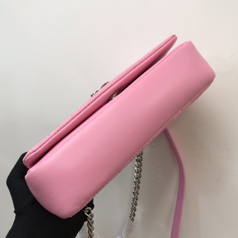 (2023600) 크기: W23 x H13 x D6cm 어깨끈의 최단 수직 착용 길이: 27cm 어깨끈의 최대 세로 길이: 50cm 외피: 100% 양가죽 장식: 100% 양가죽 안감: 면 60% 폴리에스터 40% 체인 조절식 양가죽 어깨 스트랩 내부 포켓 1개 상단 덮개에 자석 스냅 잠금장치 손으로 그린 가장자리 반짝이는 금속 부속품 이탈리아산