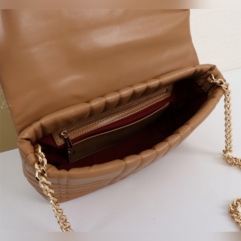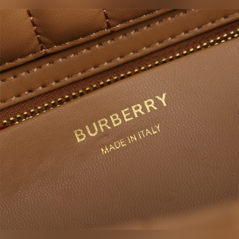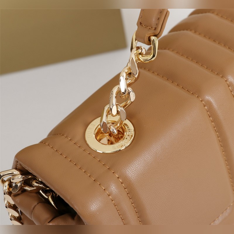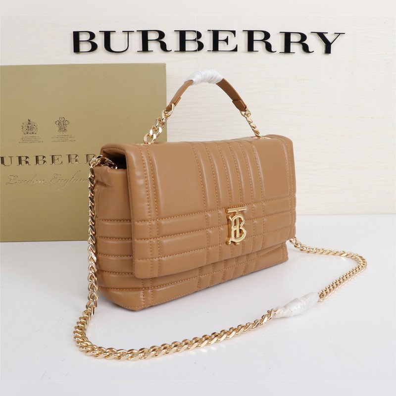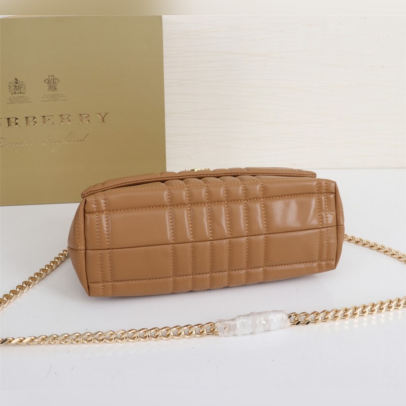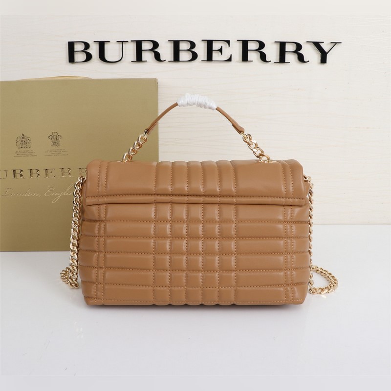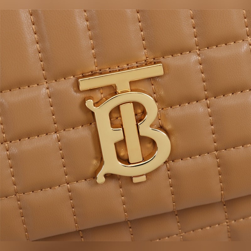 B의 새로운 양가죽 소재의 세련된 퀼팅 스쿨 스타일 로나 백은 토마스 버버리만의 로고와 반짝이는 체인 숄더 스트랩이 특징입니다. 어깨에 메거나 상단 손잡이를 이용해 클러치 백처럼 연출할 수 있습니다. 26 x 10 x 18cm 8396