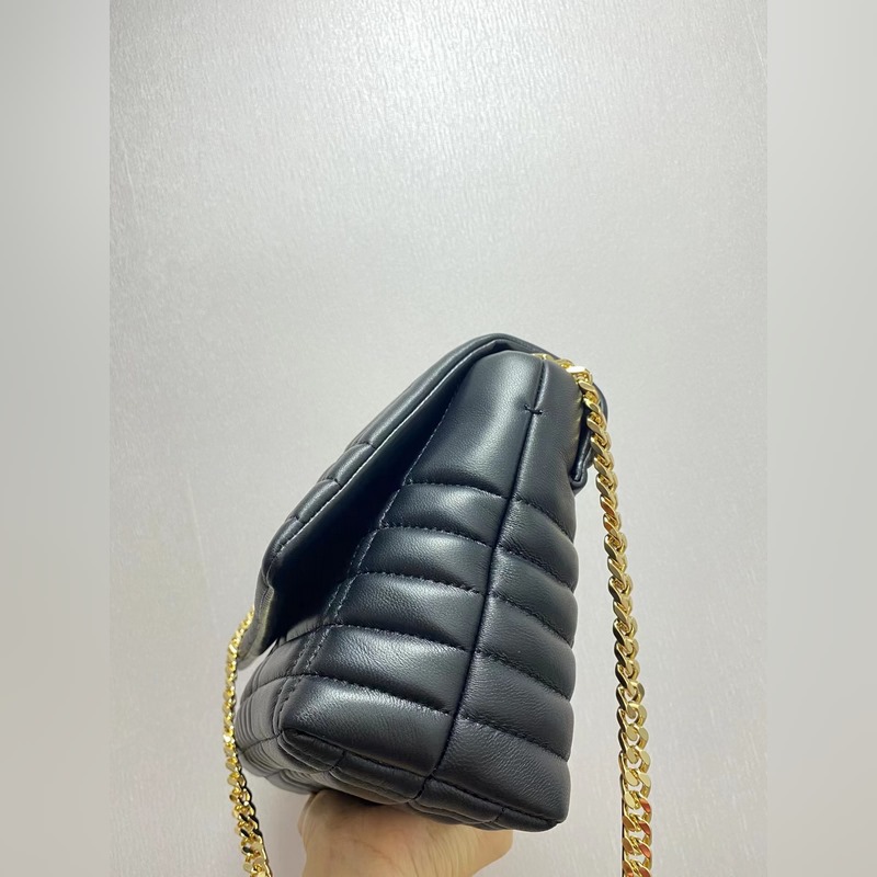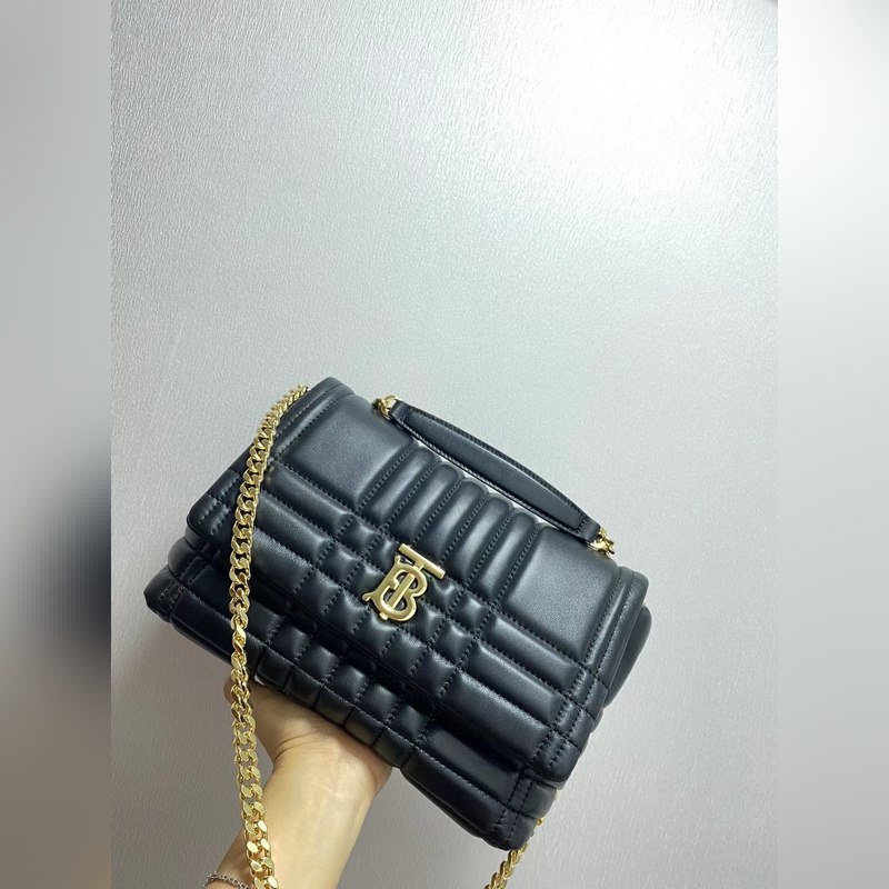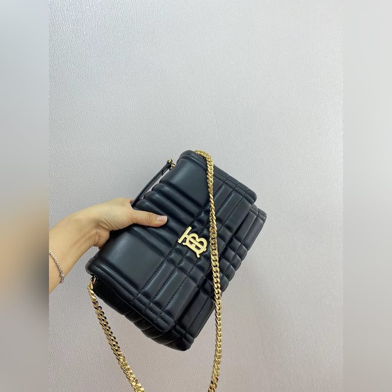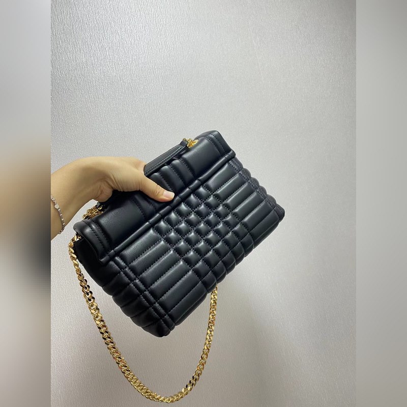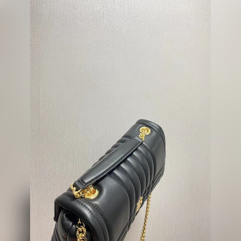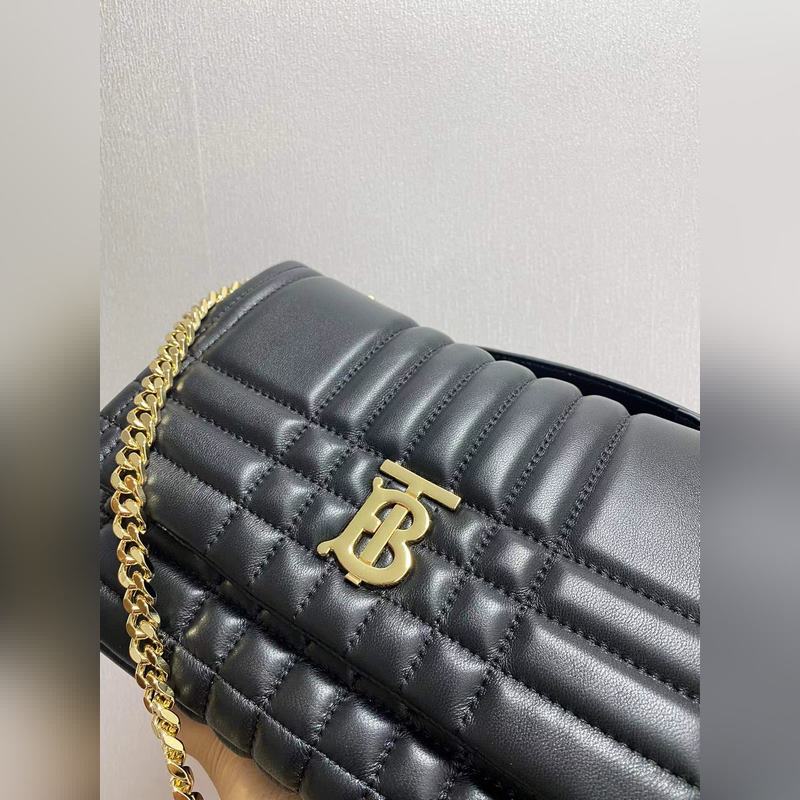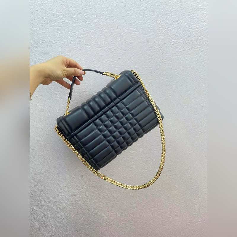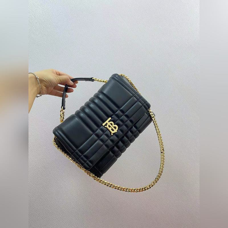 B Home의 2023 램스킨 롤라 백은 이탈리아산 램스킨으로 만든 세련된 퀼팅 스쿨 스타일 가방으로 토마스 버버리 로고로 장식되어 있습니다. 반짝이는 체인 숄더 스트랩이 함께 제공됩니다. 어깨에 메거나 상단 손잡이를 사용하여 클러치 백처럼 사용할 수 있습니다. 26 x 10 x 18cm