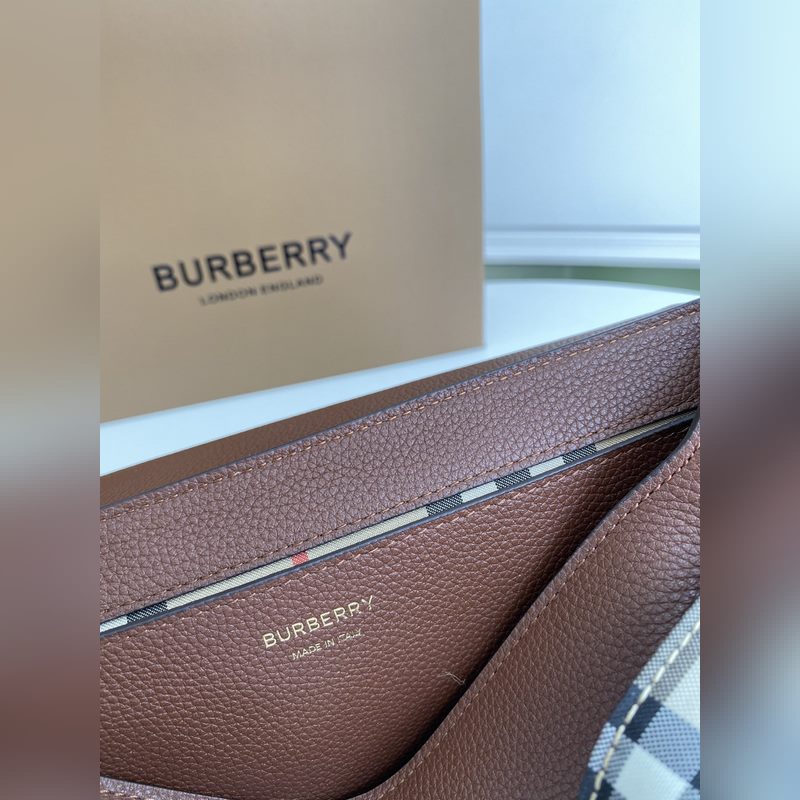 B의 컴팩트 백팩은 그레인 가죽과 레트로 체크무늬 패브릭으로 만들어졌으며