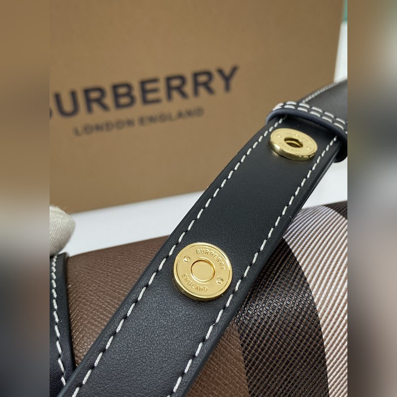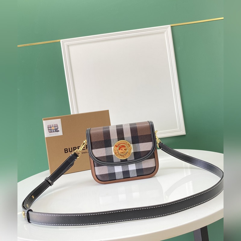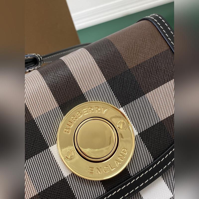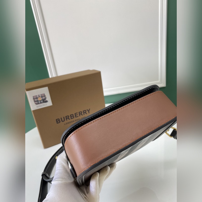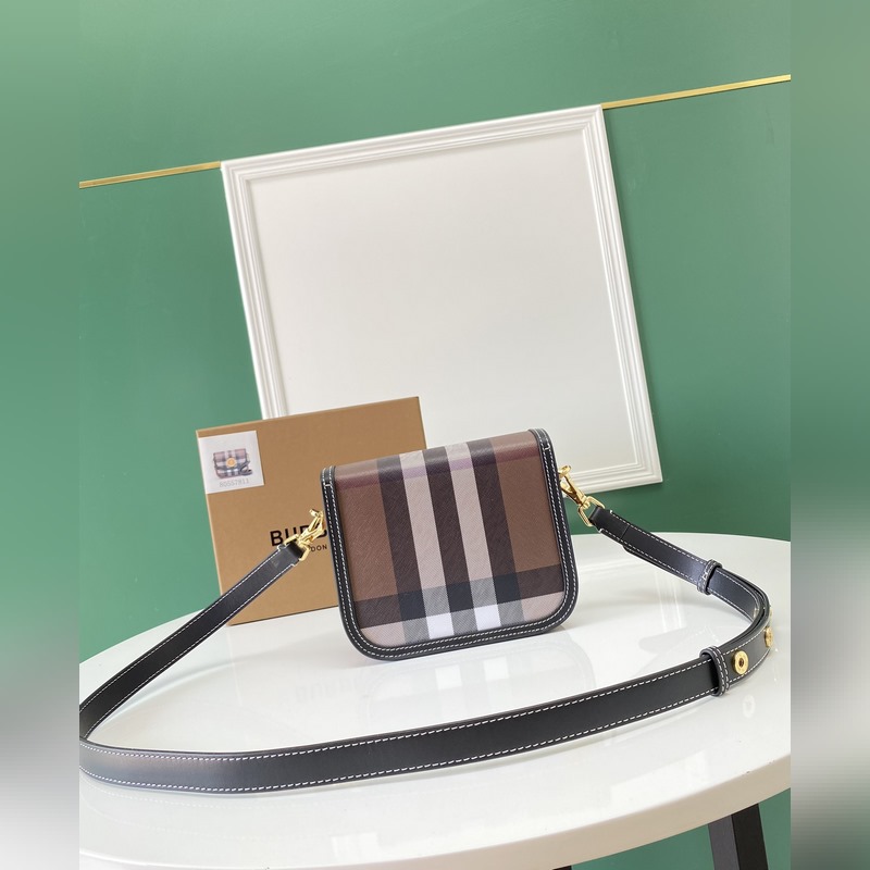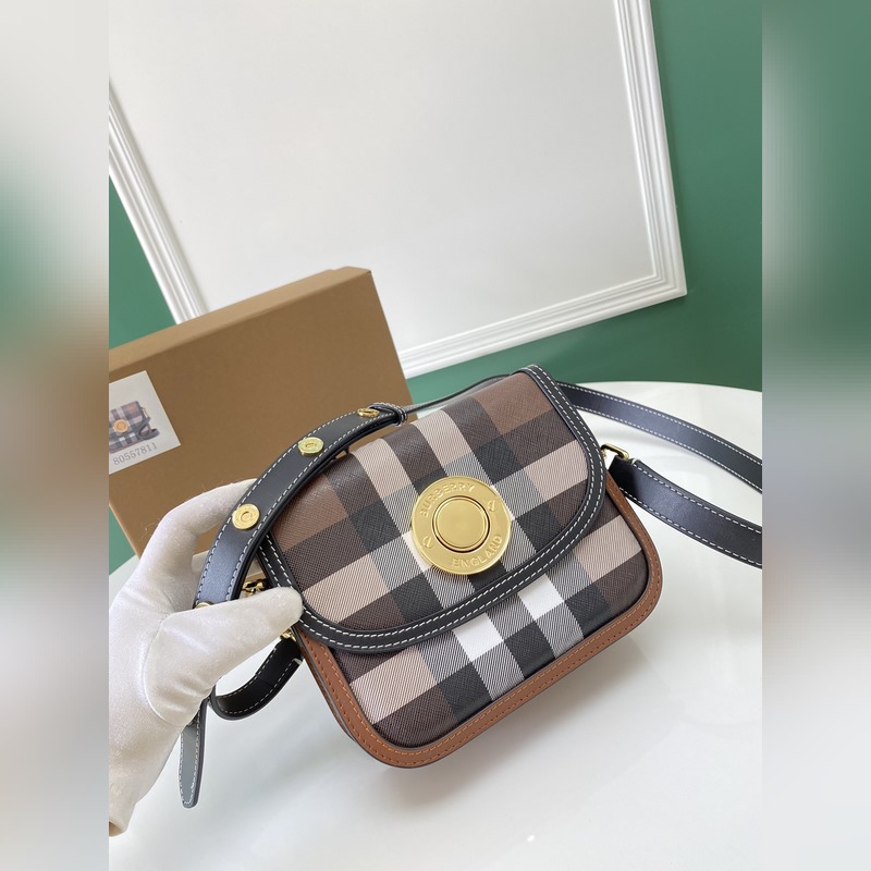 B의 최신 크로스바디 백은 대형 타탄 무늬와 대비되는 가죽 소재로 만들어