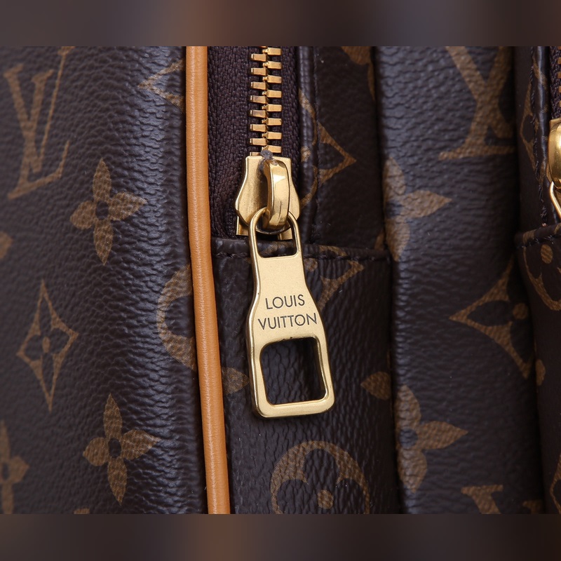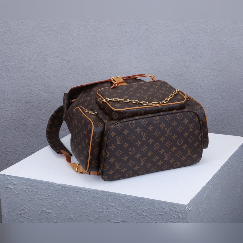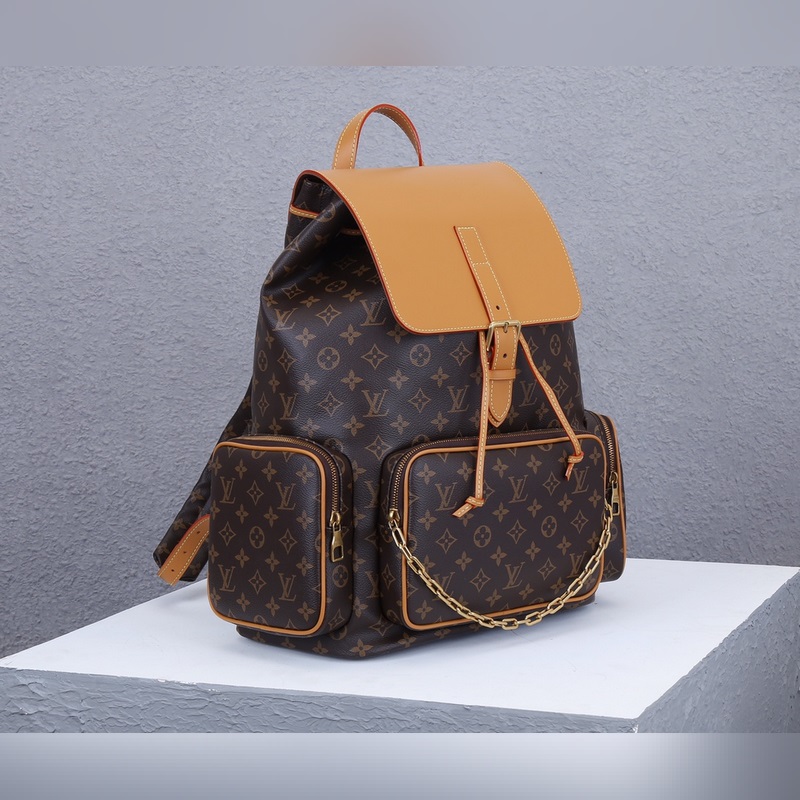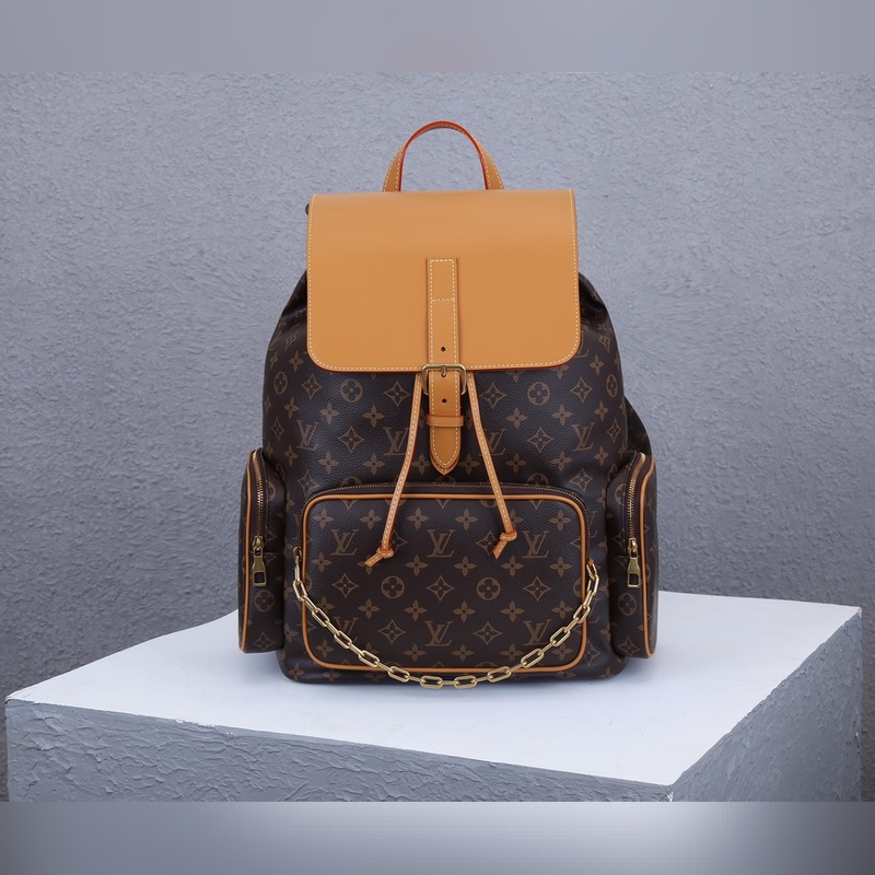 LV 트리오 백팩 모델: M44658 모노그램 캔버스 바디에 소가죽 플랩이 달린 이 가방은 앞주머니에 달린 금색 체인과 같은 현대적인 디테일로 루이 비통의 과거와 현재를 연결합니다. 지퍼가 달린 앞주머니 3개와 사이드 포켓은 실용적인 면을 고려한 것이며 노트북을 넣을 수 있는 충분한 공간이 있습니다. 모노그램 코팅 캔버스 원단 안감 1개 소가죽 트림 1개 녹청색 금색 금속 1개 길이 조절이 가능한 가죽 숄더 스트랩 1개 외부 포켓 2개 내부 패치 포켓 1개! 크기: 60 x 72 x 19cm