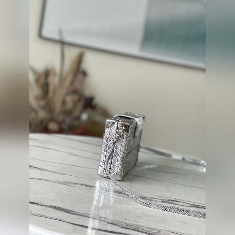 LV 모델 번호: M44199 파이썬 실버 박스 백 니콜라가 디자인한 이 핸드백은 고급스러운 파이톤 가죽으로 만들어졌으며 작은 여행 가방 모양입니다. 이 가방은 여행 가방을 만드는 브랜드의 전통을 이어가고 있으며 낮과 밤 모두에 적합합니다. 크기: 20 x 12.5 x 5cm 아이템 번호: SG96181250