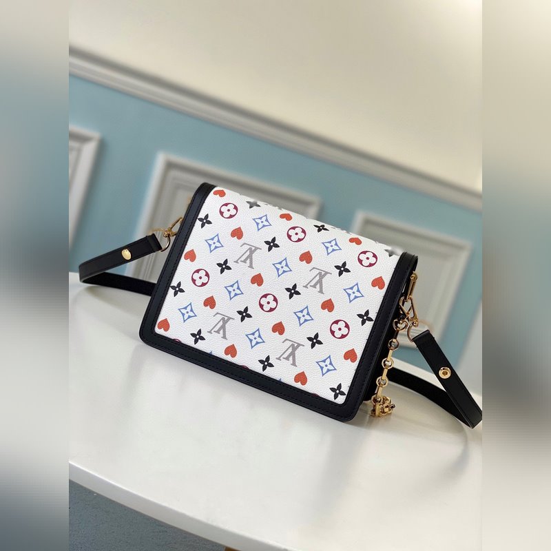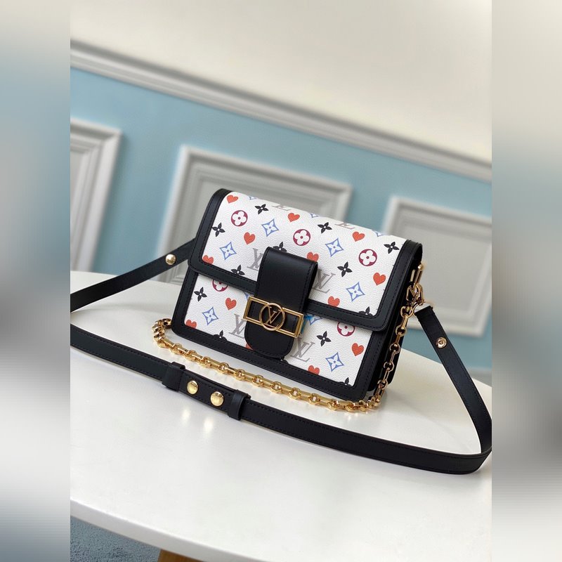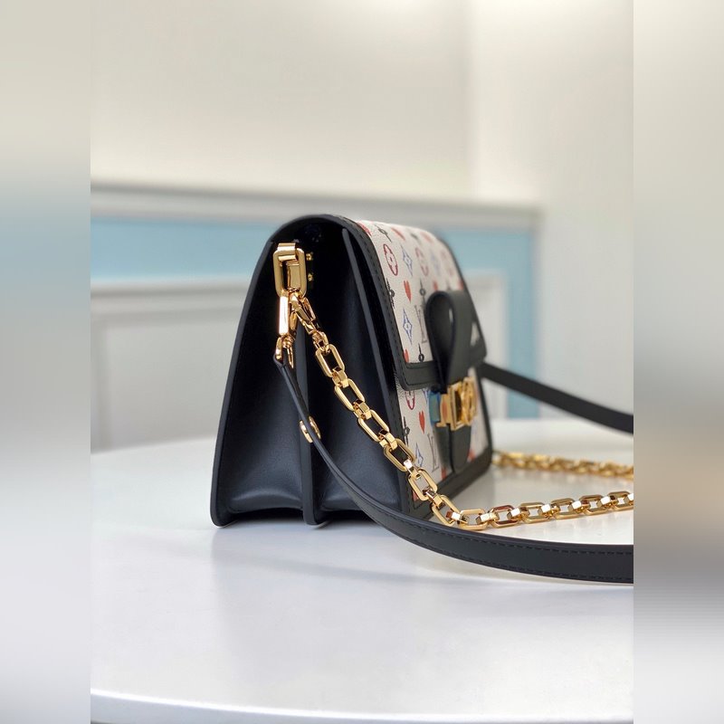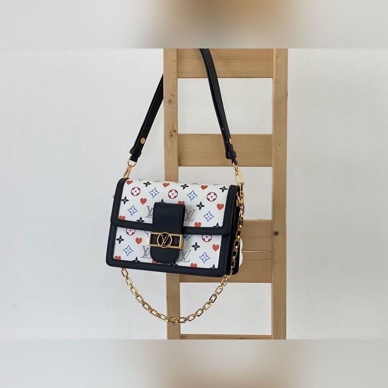 LV 다우핀 미디엄 백 모델 번호: M57463 이 모델의 도핀 미디엄 백은 2021년 초봄 컬렉션을 위해 새롭게 태어난 게임 온 모노그램 캔버스 백 바디에 가죽 트리밍이 특징입니다. 모노그램 플라워 패턴은 부분적으로 레드 하트 프린트로 대체되었으며 체인 숄더 스트랩과 상징적인 잠금 버클이 함께 제공됩니다. 크기: 25 x 17 x 10.5 cm 항목 번호: SG96181350 96189670