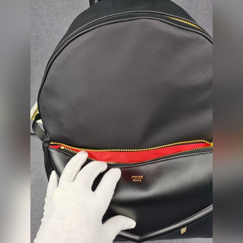 펜디 배낭 대형 상품 번호: 668568 소재: 방수 나일론 + 마이크로파이버 가죽 작은 괴물 눈 패턴의 나일론과 가죽 패치워크 백팩 앞면 지퍼 포켓 가죽 측면과 손잡이 통기성 있는 기술적 메시 소재의 뒷면 더블 지퍼 잠금장치 내부 포켓. 색상: 검정 크기: 34*38*14cm