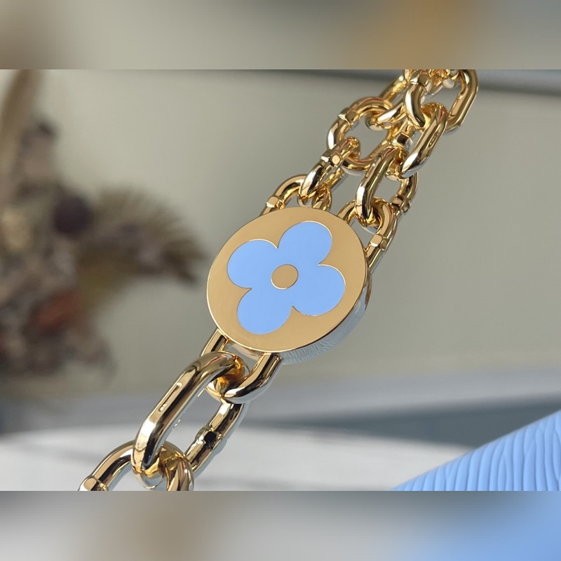 LV 아이템 번호: M59627 트위스트 미디엄 파란색 가방 새로운 더블 체인에 수작업으로 그려진 모노그램 꽃은 장식용으로 사용하든 휴대 방법을 확장하든 여성스러운 느낌을 더해줍니다. 트위스트 잠금장치는 클래식한 요소를 이어갑니다. 크기: 23 x 17 x 9.5cm 품번: SG96181380