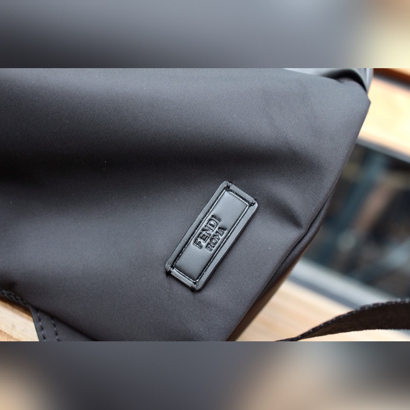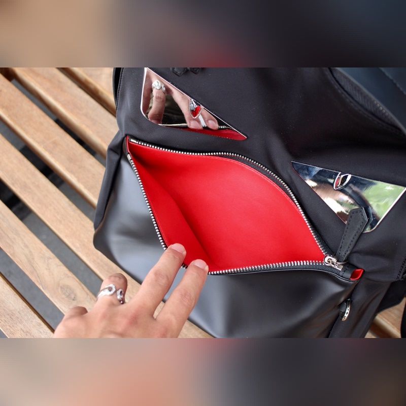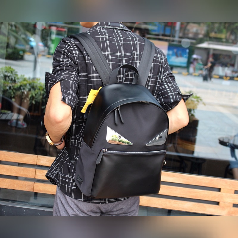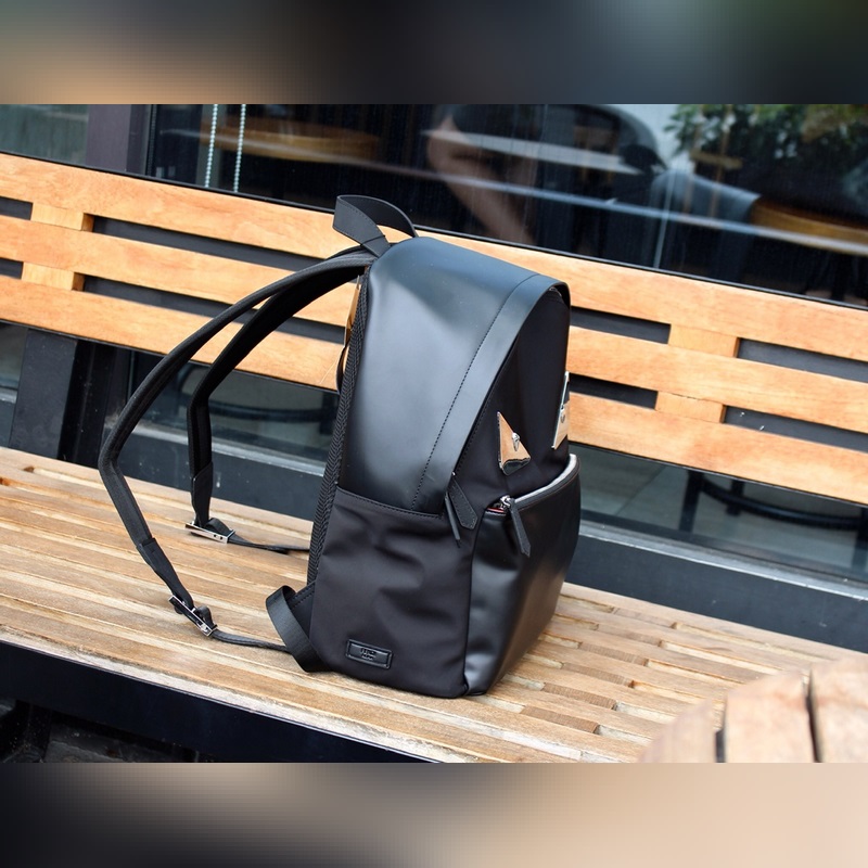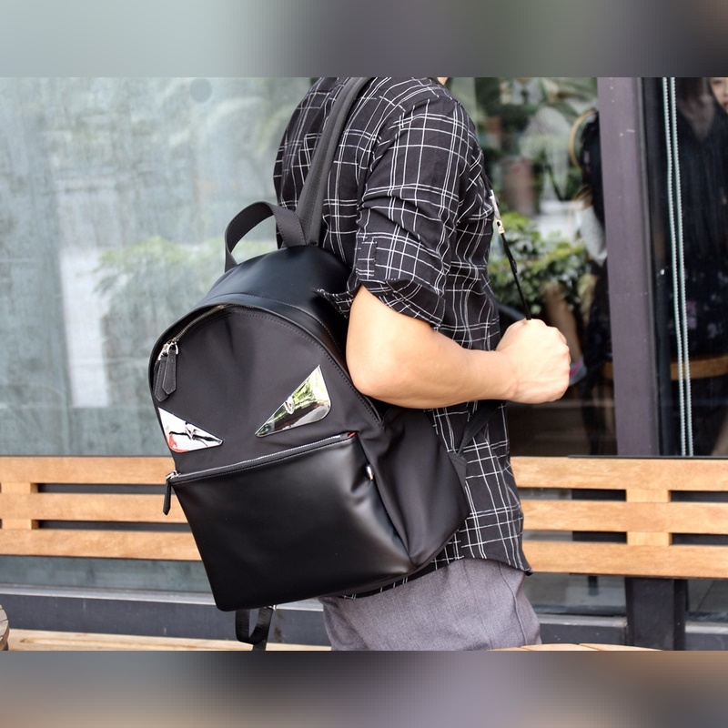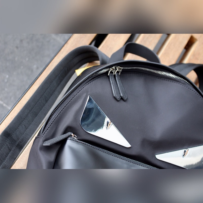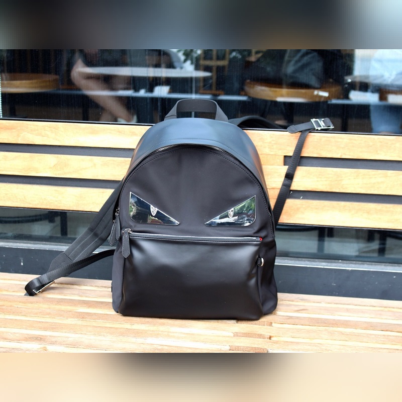 펜디 상품 번호 7vz042A2FTFOKUR 큰 앞주머니 백팩 통기성이 좋은 하이테크 메시 소재의 뒷면 조절 가능한 어깨 끈. 더블 지퍼 잠금 내부 포켓. 검은색 나일론과 가죽 소재. 가방 벌레 눈 모양의 금속 장식.