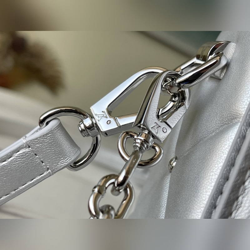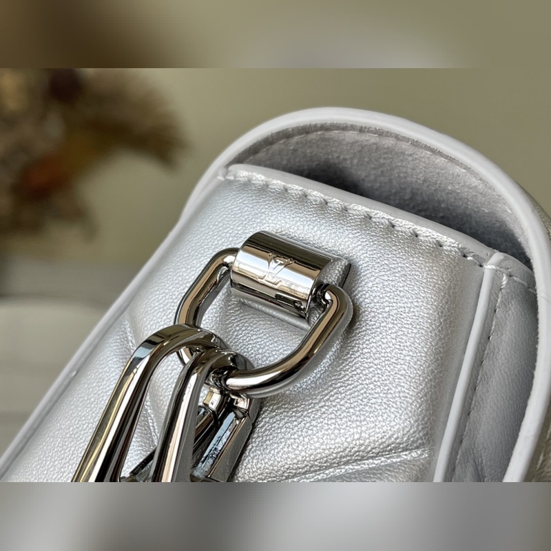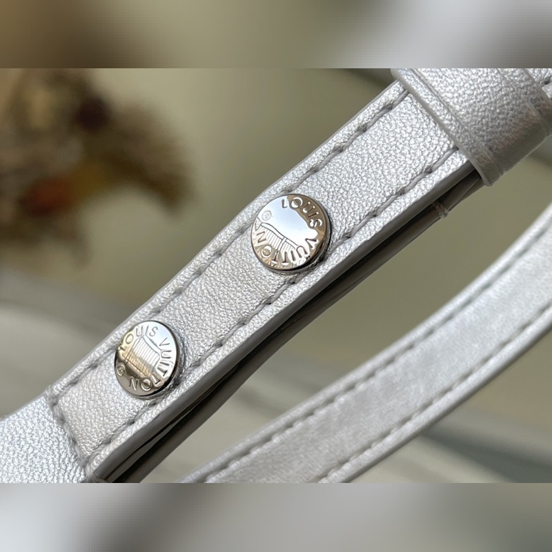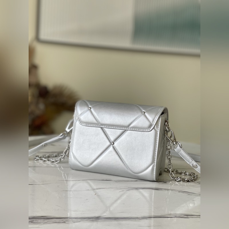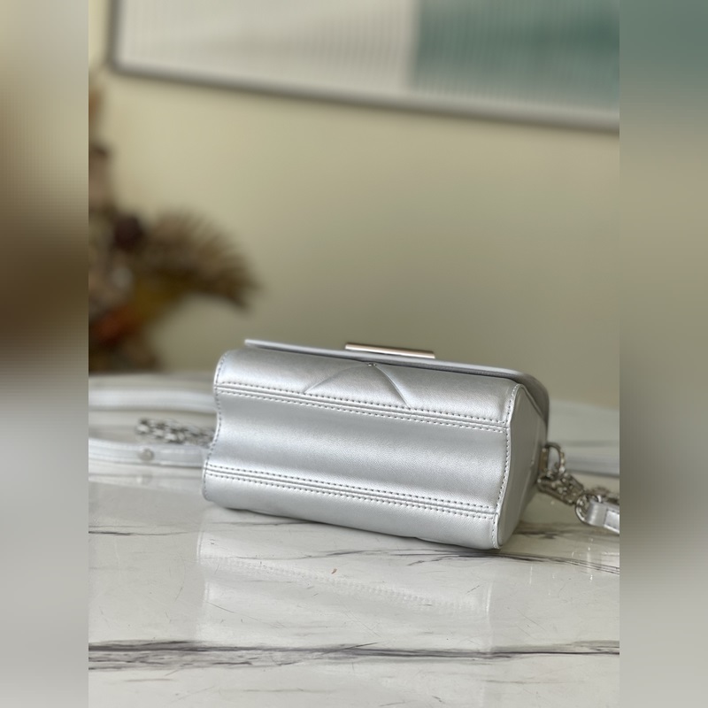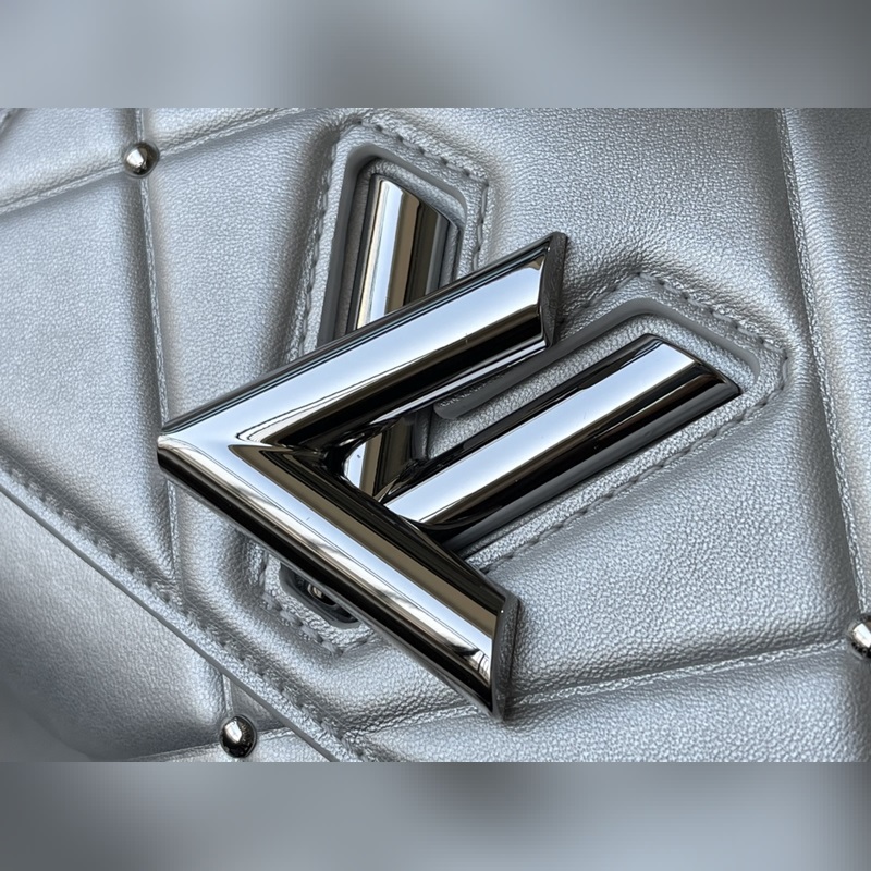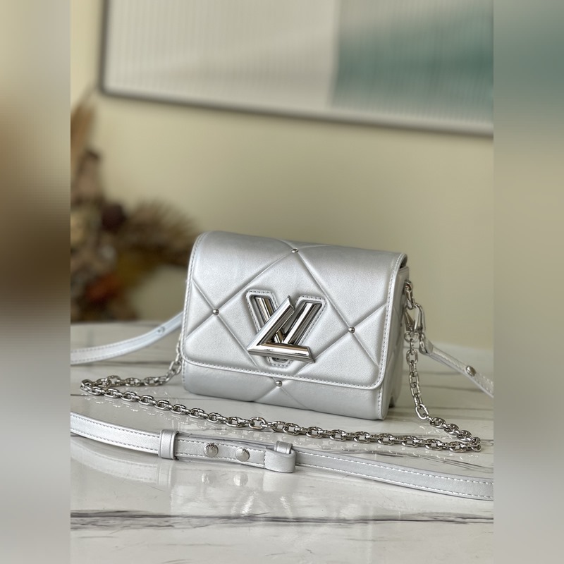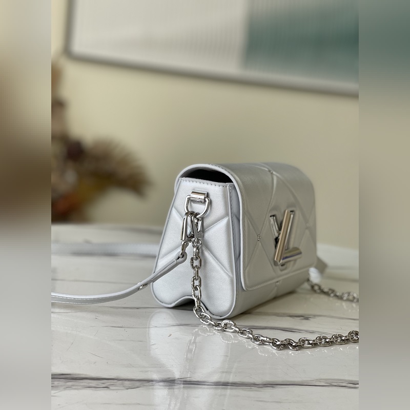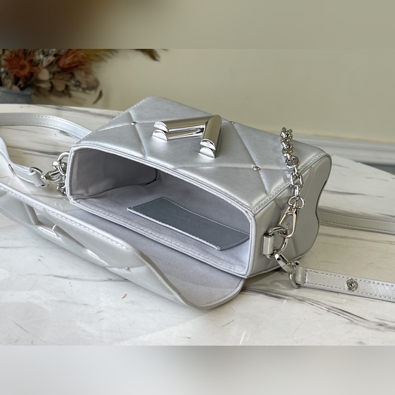 LV 아이템 번호 M59031 트위스트 소형 가방 트위스트 스몰 백은 은빛으로 빛나는 양가죽으로 덮인 눈 덮인 세상을 묘사하고 트위스트 락 스터드 체인은 반짝이는 광택을 더해줍니다. 탈부착이 가능하고 길이 조절이 가능한 어깨 스트랩이 포함되어 있어 어깨에 메거나 몸에 걸칠 수 있습니다. 크기: 19 x 15 x 9cm 품번: SG96181370
