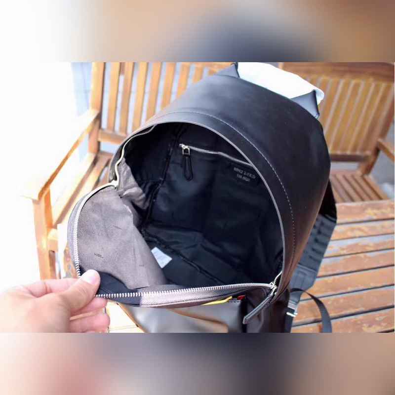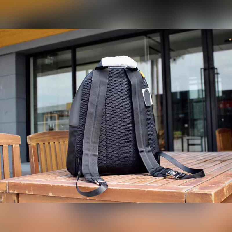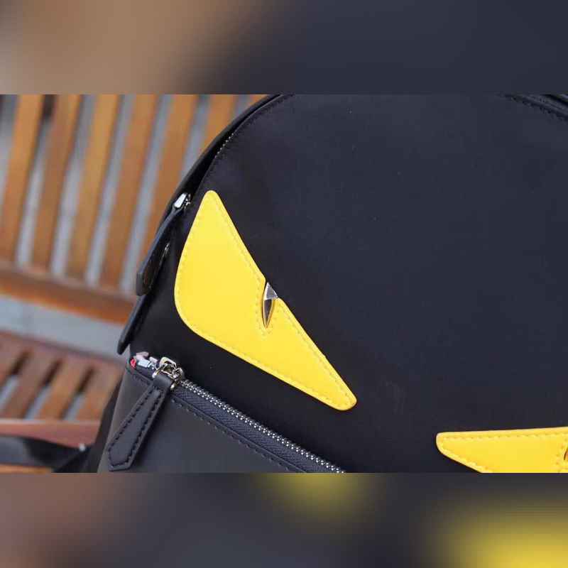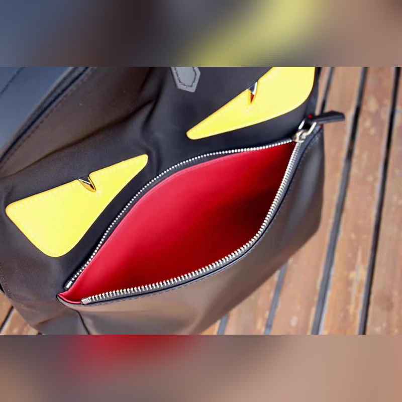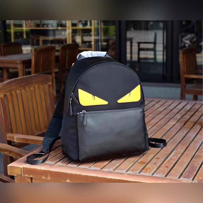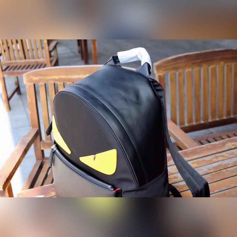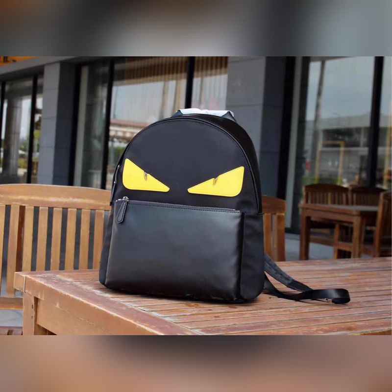 펜디 모델: 0237-1 책가방이 달린 새 옷감 펜디 몬스터 백팩 업그레이드된 백팩 나일론 패치워크 블랙 가죽 백팩 BAG BUGS 아이 패턴 스타일링 전면 지퍼 포켓 가죽 측면과 손잡이 통기성 있는 기술적 메시 소재의 뒷면 더블 지퍼 잠금장치와 내부 포켓 출장 및 레저 활동에 필수적인 아이템 사이즈: 38-35-14CM
