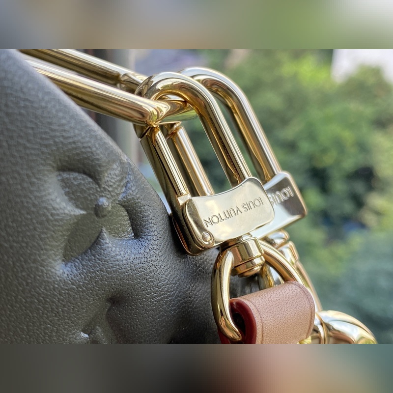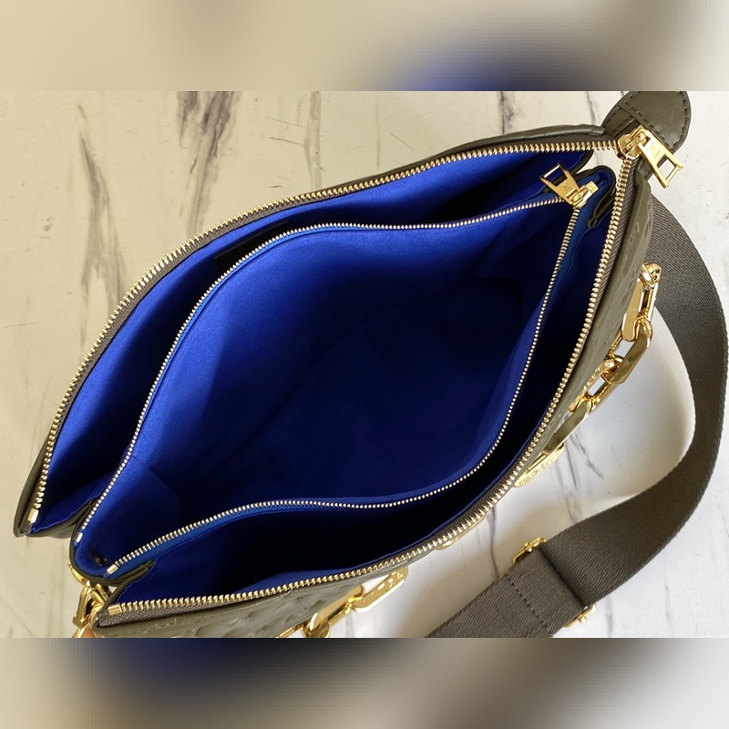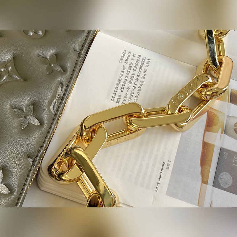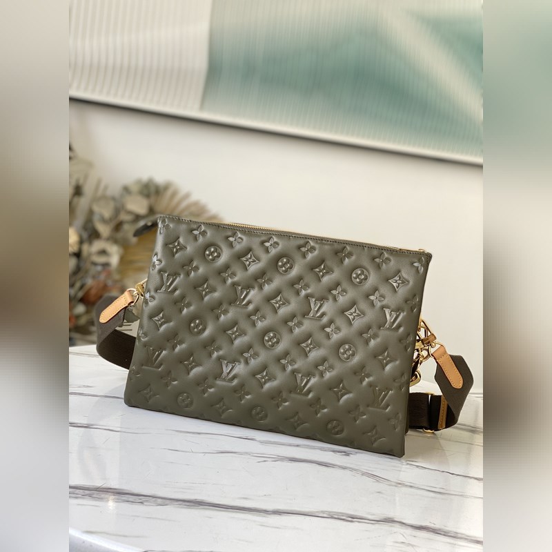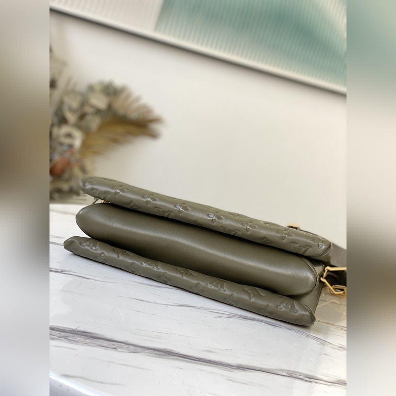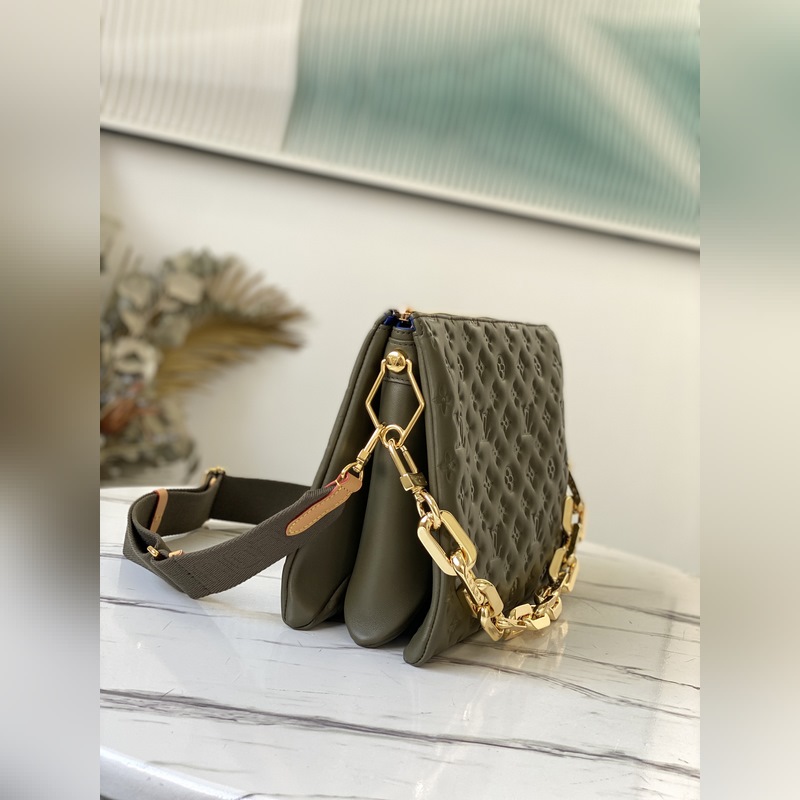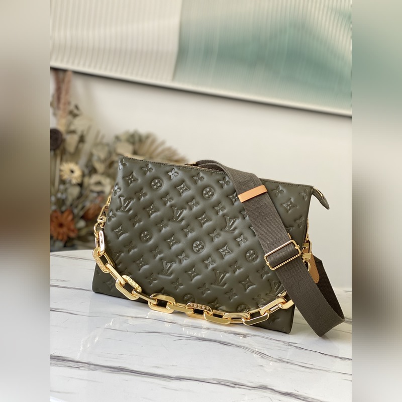 LV 모델 번호: M57782 밀리터리 그린 올 스틸 하드웨어 쿠썽 중형 핸드백 2021년 봄/여름 패션쇼에서 눈길을 사로잡았습니다. 양각으로 새겨진 모노그램이 있는 부드러운 양가죽은 쿠션 같은 부드러움을 선사하며 길이 조절이 가능한 어깨 스트랩과 새로운 엣지 체인을 통해 어깨에 메거나 크로스 바디로 메거나 겨드랑이 가방으로 사용할 수 있습니다. 크기: 34 x 24 x 12cm 품번: SG96181750