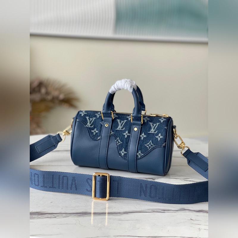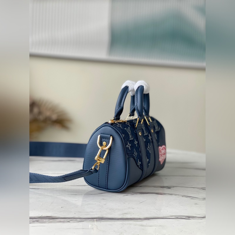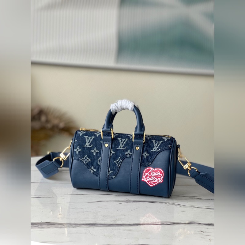 LV 모델 번호: M81011: Keepall 가방의 포켓 버전 2022년 초봄 클래식한 Keepall 핸드백의 미니 버전을 만나보세요. 일본 스트리트웨어 디자이너 니고의 모노그램 드립 요소를 만나보세요: 캐주얼한 데님 위에 아이코닉한 모노그램 패턴이 펼쳐져 있고 부드러운 타우리옹 소가죽과 조화를 이루며 하트 로고가 밝은 색상의 터치를 더합니다. 크기: 21 x 12 x 9cm 항목 번호: SG96181250 9618970