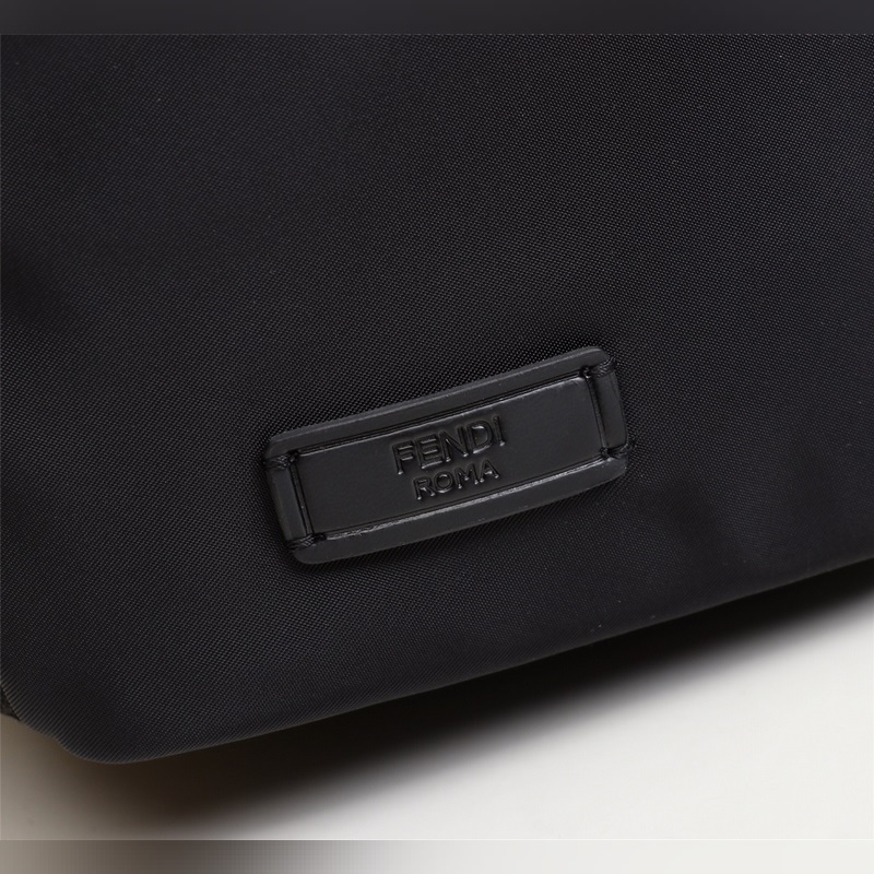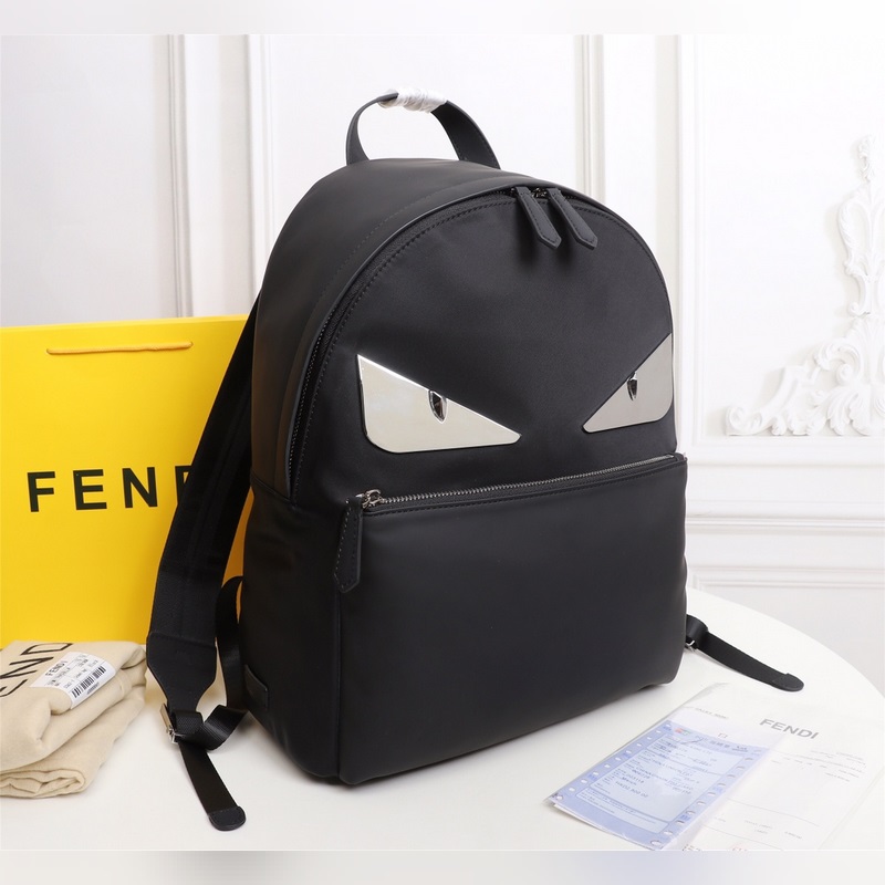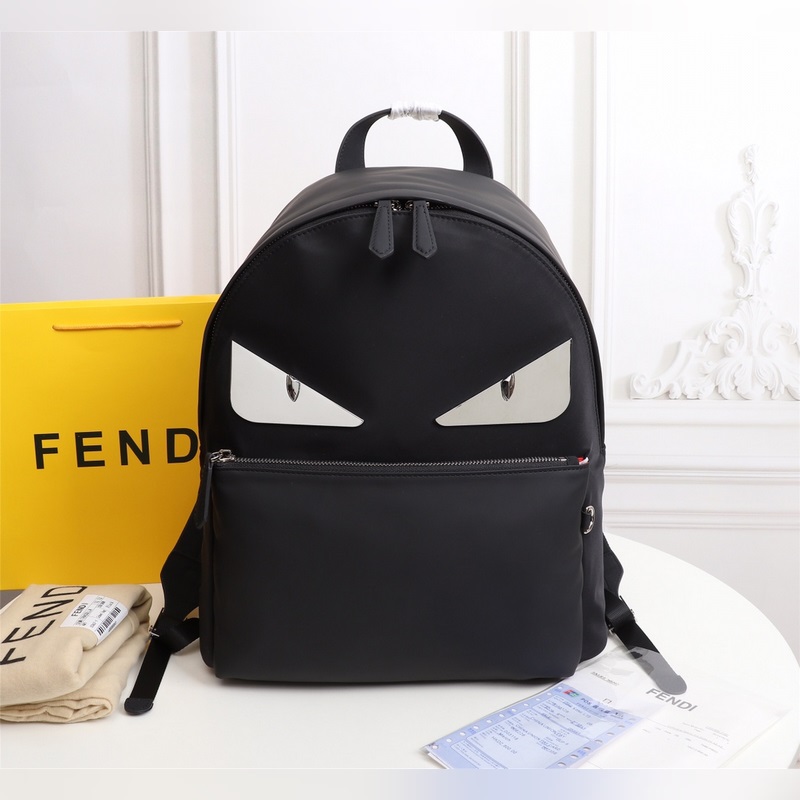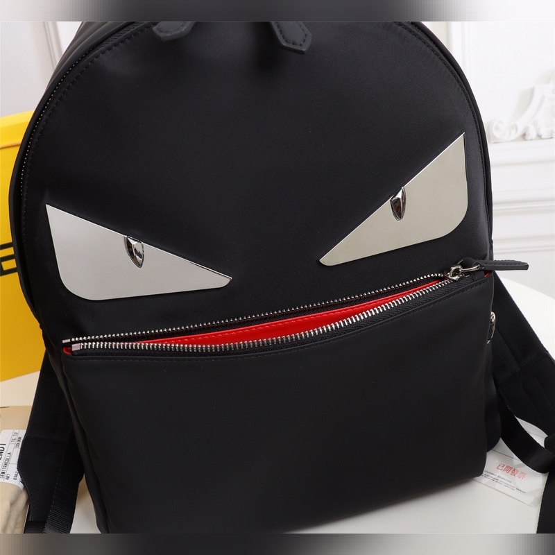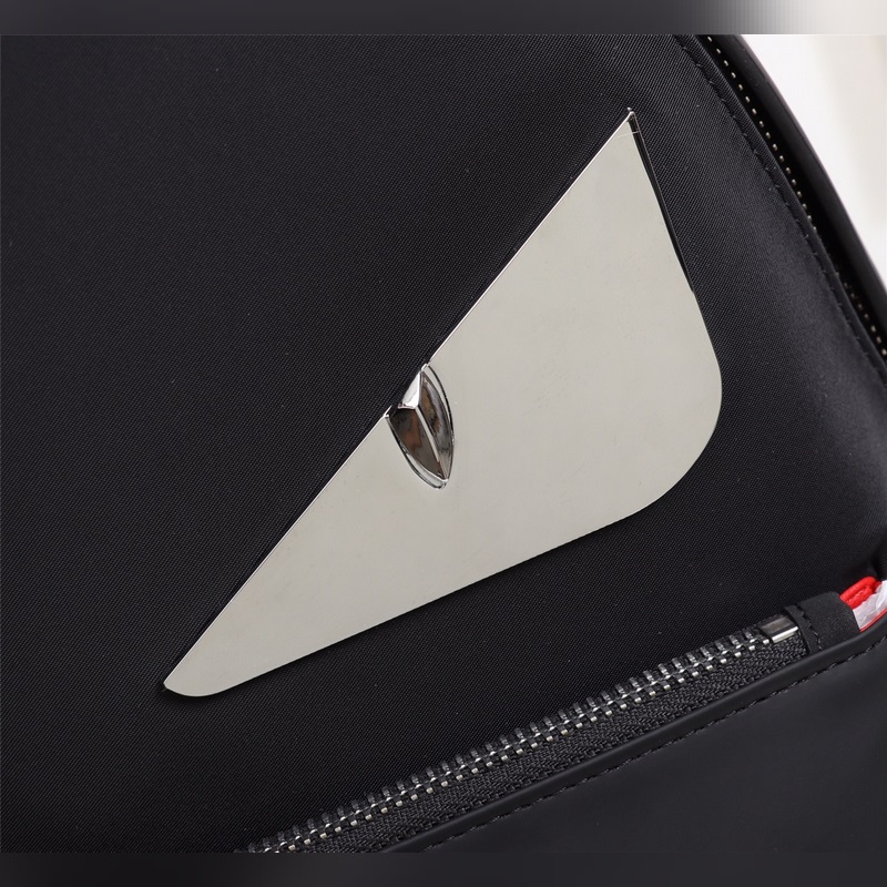 펜디 프론트 포켓 백팩 모델: 7vz042A2FTFOKUR 통기성이 좋은 하이테크 메시 소재의 뒷면 조절 가능한 어깨 끈. 더블 지퍼 잠금 내부 포켓. 검은색 나일론과 가죽 소재. 가방 Bugs eyes 금속 장식