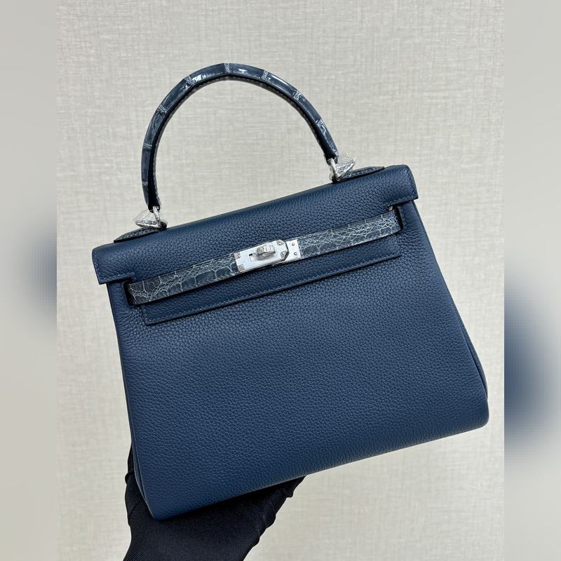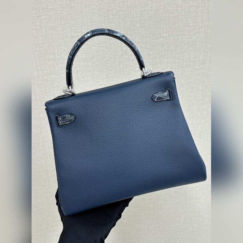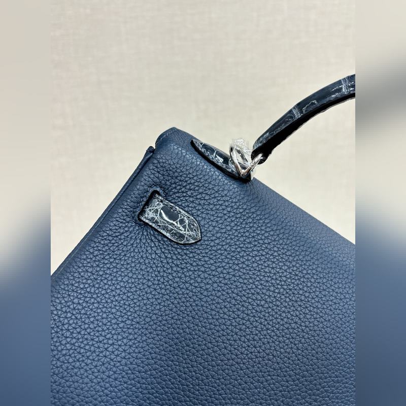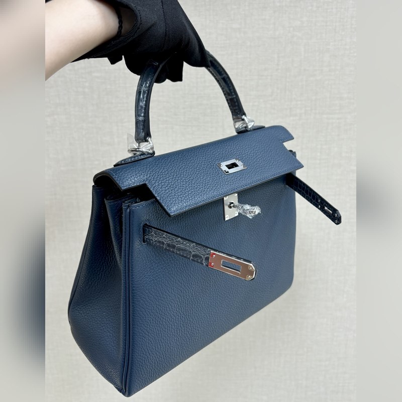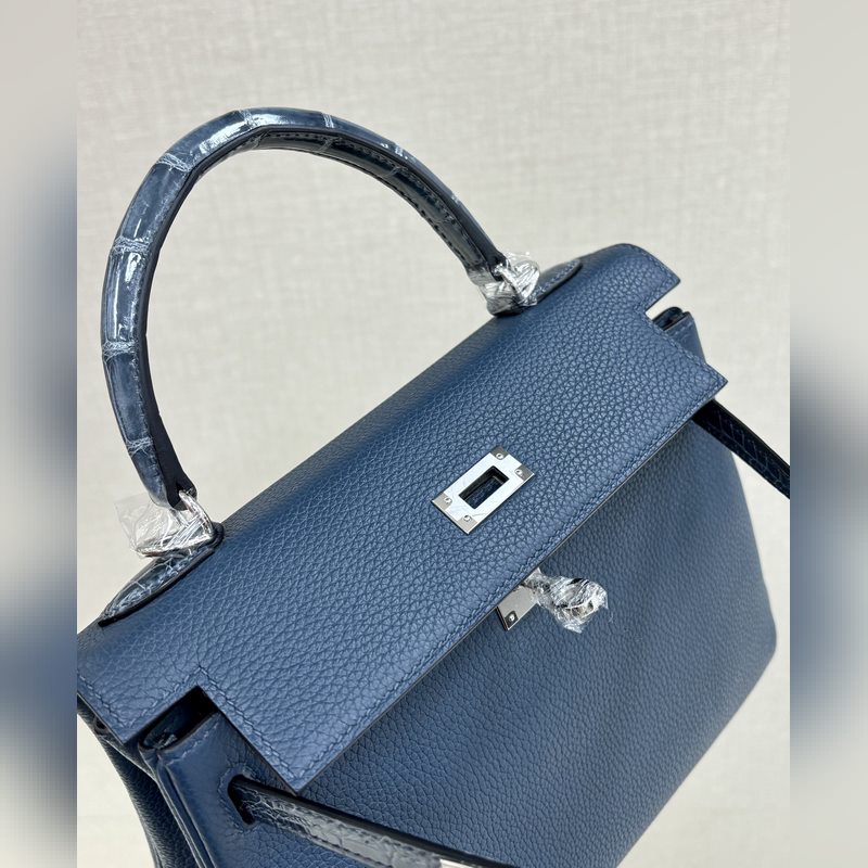 켈리 터치 25cm 악어 가죽에 반짝이는 토고 가죽 프러시안 블루 수