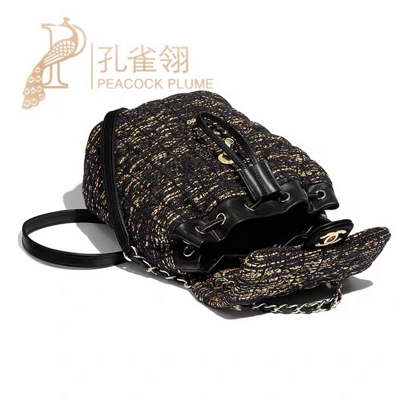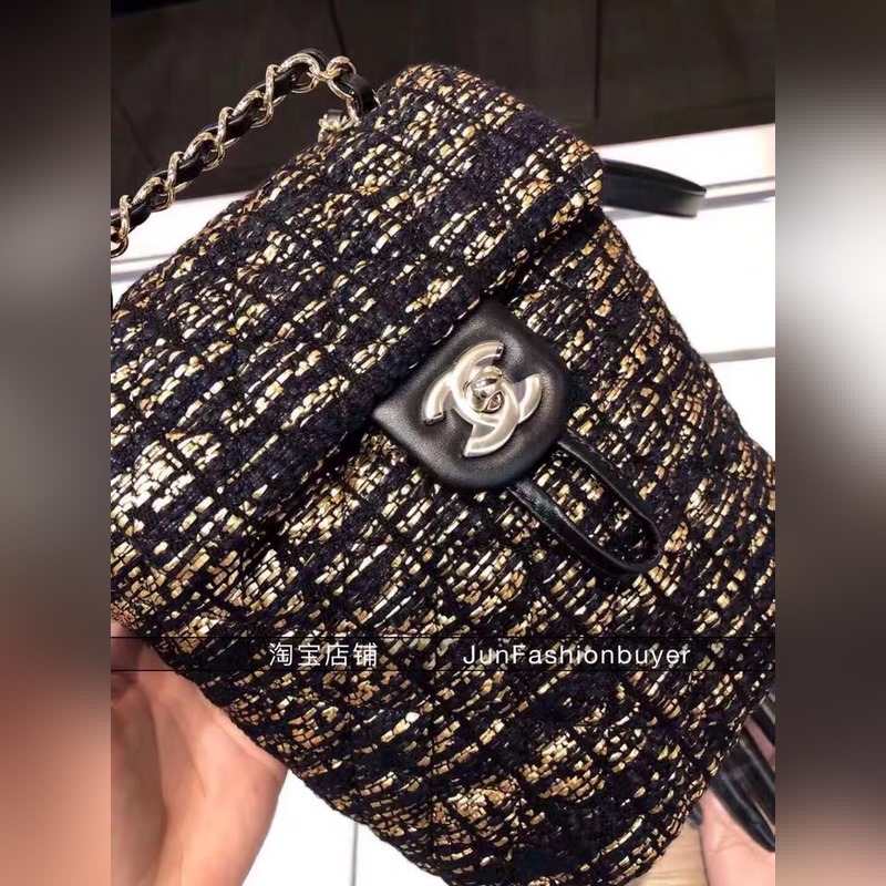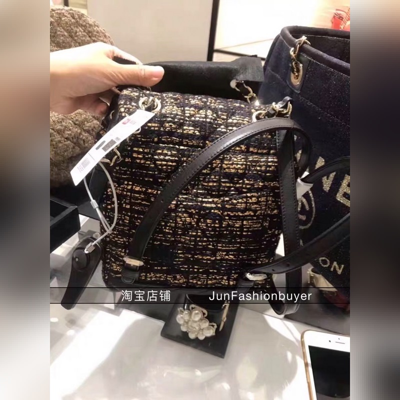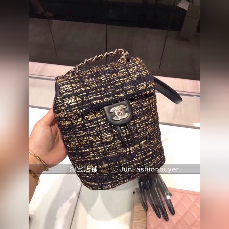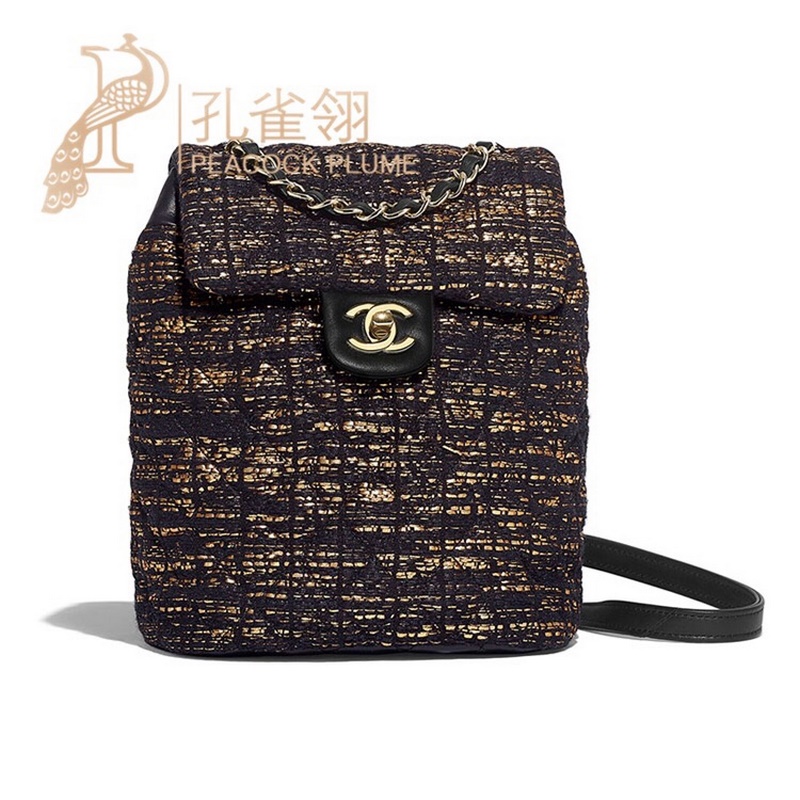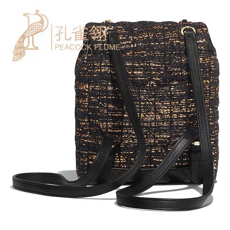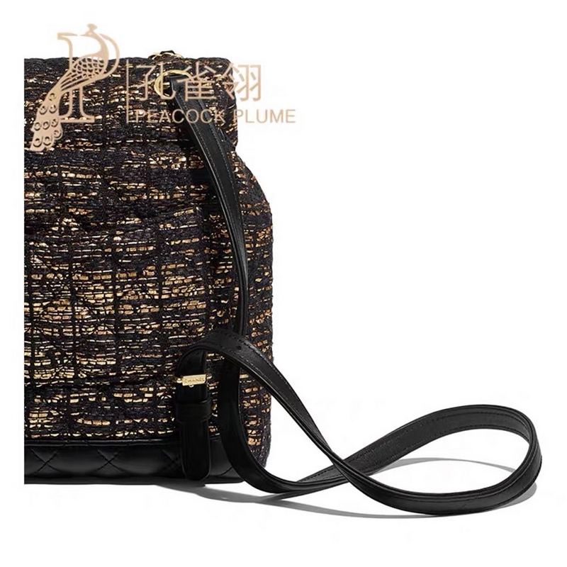 CHANE 블랙과 골드 컬러의 패션 백팩 모델: 69966 69964 트위드와 가죽 소재에 금색 하드웨어. 넉넉한 수납 공간. 심플하고 세련된 디자인. 여행과 휴가를 위한 필수 아이템. 크기: 25X30X12.5CM 크기 21X17X9CM.