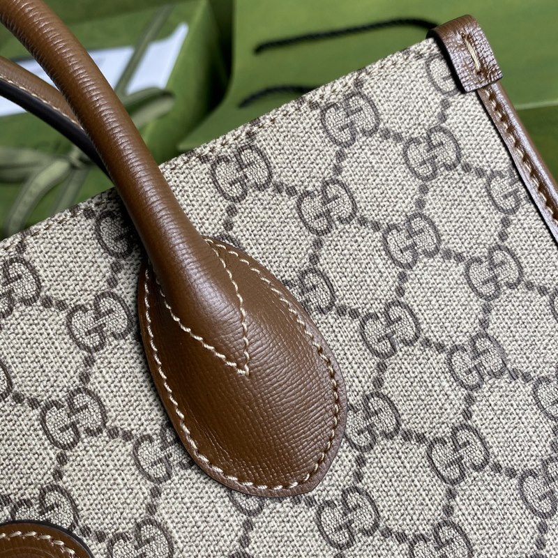이 작은 토트백은 GG Supreme 캔버스에 블랙 가죽 트리밍을 더해