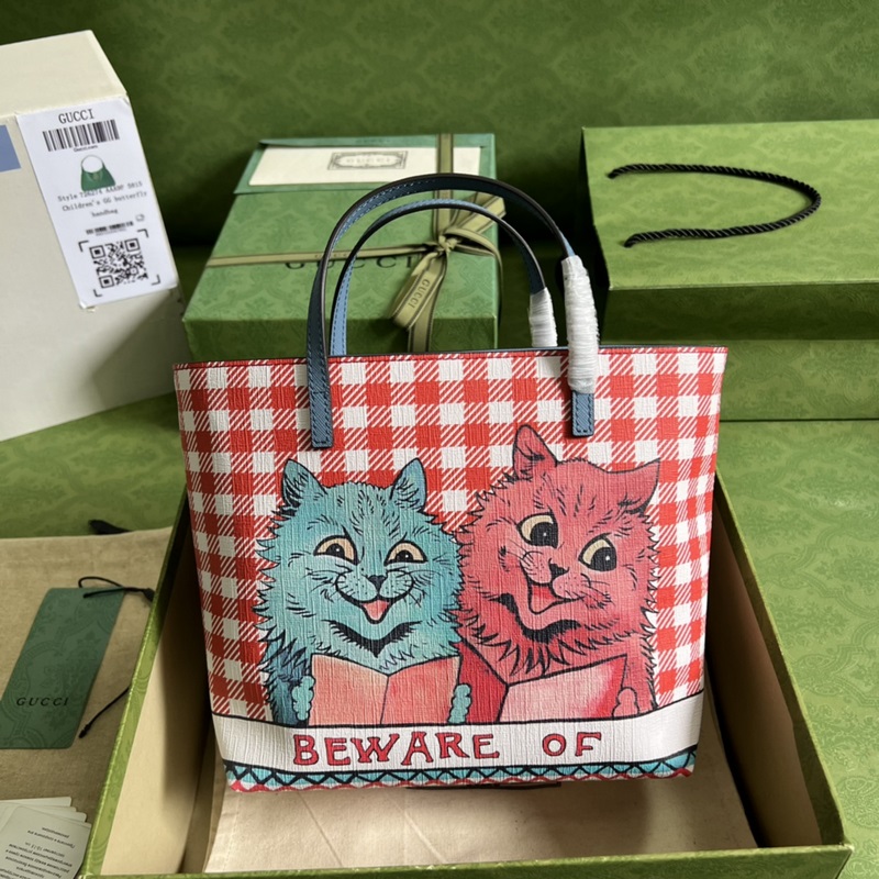 고양이 프린트의 어린이용 핸드백. 이 어린이용 핸드백은 빨간색과 아이보리