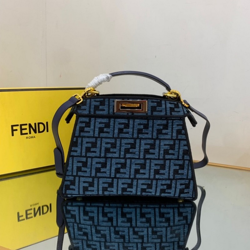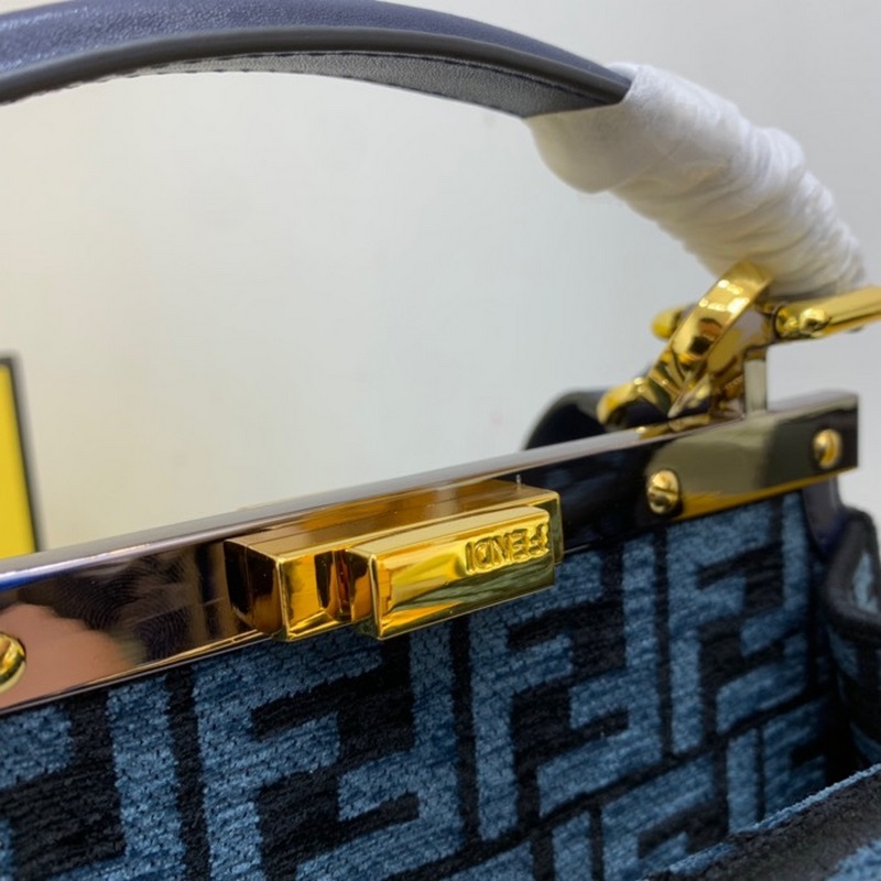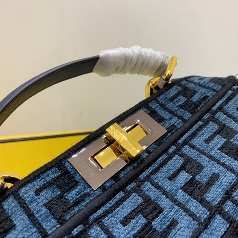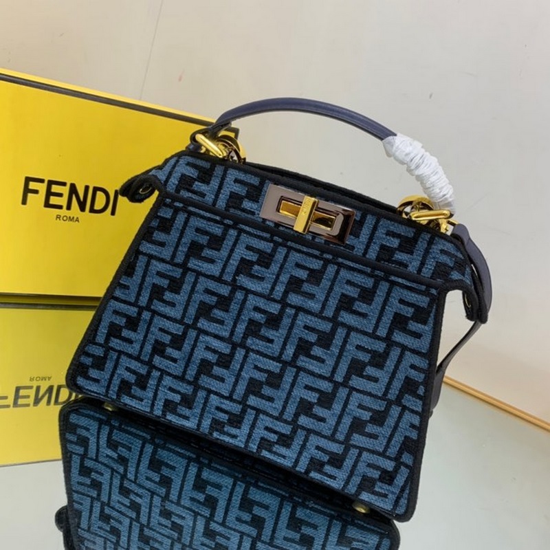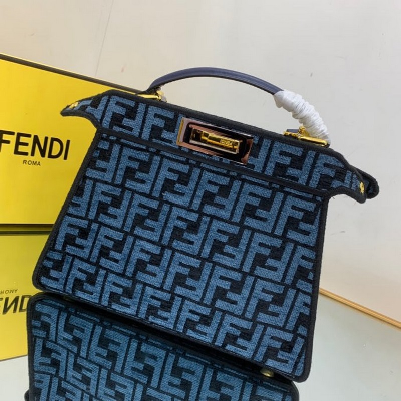 진한 파란색 FF 브로케이드 무늬가 있는 셔닐 소재의 트럼펫 백. 측면에
