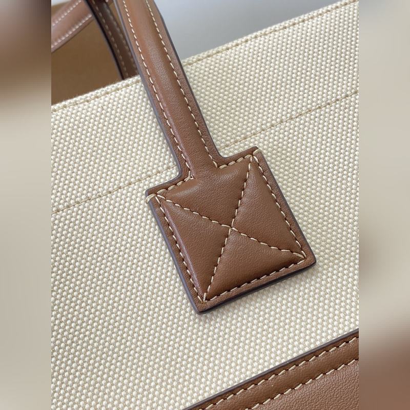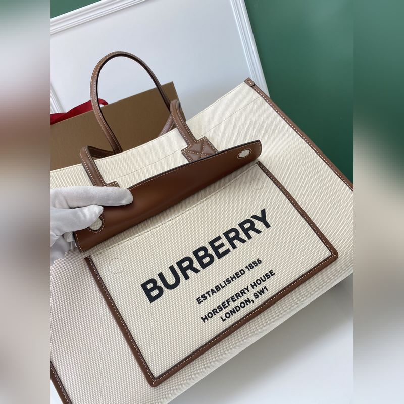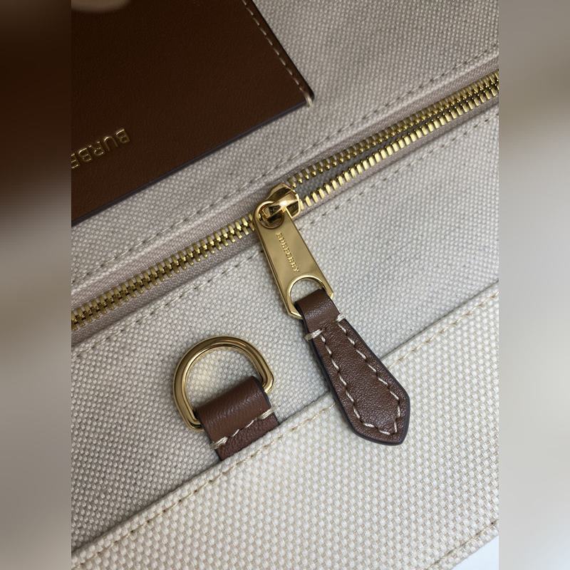버버리의 최신 세련된 토트백은 가죽 소재에 탑스티치와 면 캔버스를 사용했
